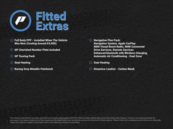 12V Socket in Centre Console, 18in Alloy Wheels - John Cooper Works GP Spoke Forged Lightweight - Two-tone, 3 Point Seatbelts on all Seats, 3D Printed Fascia Panel with Individual GP Numbering, 3D Printed GP Metal Shift Paddles, 4 Lashing Eyes in Luggage Compartment, 4 Speakers - in Front Door Trims and Underneath Front Seats, Air Conditioning - Manual, Airbags, Alarm System, Anti-Lock Braking System - ABS, Automatic Headlight Activation Switch, Bluetooth for Compatible Mobile Phone - with Audio Streaming, Brake Calipers - Red With John Cooper Works Logo, Carbon Black Colour Line - Knee Roll and Door Armrests, Carbon Fibre Wheel Spats with Individual Numbering on Front Driver and Passenger Side, Chrome Highlights, Cruise Control with Brake Function, Cup Holders, Darkened LED Headlights and Rear Lights, Darkened Rear Glass, Door Storage Compartments, Dynamic Brake Lights, Dynamic Stability Control - DSC, Electric Windows - Front, Electro-Mechanical Steering with Speed Dependant Steering Assistance, Electronic Vehicle Immobiliser, Exhaust Tailpipes in Stainless Steel, Foldable Rear Seats 60-40, Front Centre Armrest, Front and Rear ISOFIX - including Front Passenger Airbag Deactivation, Fuel Filler Cap in Chrome, GP Aerodynamic Lit with Chili Red and Rosso Red Accents including Specific Front Bumper with Air Intake and Rear Bumper with Diffuser Insert, GP Digital Display Cockpit, GP Door Entry Strips, GP Floor Mats with Logo and Chili Red Stitching, GP Walknappa Leather Steering Wheel, Gearshift Paddles, Glove Compartment, Headliner - Anthracite, Heated Rear Window, Heated Windscreen Washer Jets, Instrument Cluster, Interior Lighting, Interior Surfaces - Piano Black, John Cooper Works Sport Seats, LED Headlights with Closed Ring as Daytime Driving Lights, LED Reading Lights - Vanity Mirror Lights - Front Footwell Lights - Spotlights on Front Seats, Leatherette Gearshift Lever and Handbrake Gaiters, Load Protection Bar in Chili Red, MINI Driving Modes, MINI E-Call, MINI Logo Projection on Floor from Drivers Exterior Mirror, MINI TeleServices, Mechanical Seat Adjustment, Model Logo Cooper S on Right of Tailgate, Multifunction Controls for Steering Wheel, On-Board Computer, Pedals - Rubberised Stainless Steel, Performance Control, Piano Black Exterior Trim with Extended Content, Rain Sensor Window Wipers, Rear Fog Light, Rear LED Lights with Union Jack Design, Rear Spoiler - Bicolour with GP Logo, Rear Window Wiper, Roof and Mirror Caps - Melting Silver, Side Scuttle with MINI John Cooper Works Logo in Black High-Gloss with Red Border, Sport Suspension, Start-Stop Toggle including Keyless Go, Steering Column Height and Length Adjustment, Storage - Pockets on Back of Front Seats, Sun Visor with Vanity Mirrors, Sun-Heat Protection Glass, Tool Kit in Luggage Compartment, Torsen Mechanical Limited Slip Differential, Two-Tone Horn, Tyre Pressure Monitoring System, Visual Boost Radio, White Indicator Lenses, Full Body PPF - Installed When The Vehicle Was New (Costing Around £4,000), GP Cherished Number Plate Included, GP Touring Pack, Navigation Plus Pack Which Includes, Navigation System, Apple CarPlay, MINI Visual Boost Radio , MINI Connected Drive Services, Remote Services, Enhanced bluetooth with Wireless Charging, Automatic Air Conditioning - Dual Zone, Seat Heating, Dinamica-Leather - Carbon Black, Racing Grey Metallic Paintwork