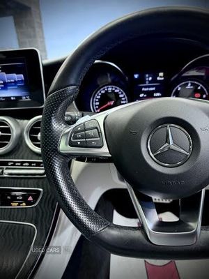 Active park assist with parktronic system, Attention assist, Bluetooth interface for hands free telephone, Collision prevention assist plus, DYNAMIC SELECT with a choice of driving modes (ECO, Comfort, Sport, Sport+ and Individual), Garmin Map Pilot navigation system with SD card, touchpad and voice control, Instrument cluster with 5.5-inch TFT multi-function display, Multi function trip computer, Outside temperature gauge, Remote boot release, Service indicator (ASSYST), Speed sensitive steering, 2 USB ports, Audio 20 radio/CD with 7" colour display with multi touch keypad, DAB digital radio module, Frontbass loudspeakers, Media interface, Steering column mounted multifunction controls, Adaptive brake lights, AMG front, rear apron and side skirts, Auto dimming driver's door mirror, Auto dimming rear view mirror, Body coloured bumpers, Chrome grille surround, Door sill plates with "Mercedes-Benz" lettering, Electric adjustable/heated/folding door mirrors, Electric front sliding and fixed rear panoramic glass sunroof, Electric windows one touch open/close, Green tinted glass, Heated windscreen washers, LED daytime running lights, LED tail lights, Radiator grille with integral star, Rain sensor windscreen wipers, Side windows surround in polished aluminium, Twin chrome exhaust tailpipes, 2 cupholders in front centre console, 2 rear head restraints, 3 spoke flat bottom multi-function leather AMG steering wheel, 4-way lumbar support for drivers seat, 4-way lumbar support for front passenger seat, 40:20:40 split folding rear seats, Advanced multicolour ambient light and LED interior light, AMG floormats, Auto dual-zone climate control system, Auto Mercedes-Benz child seat recognition sensor, Door courtesy lamps, Electric front seats, Electric height adjustable front seats, Front centre armrest with storage compartment, Front footwell illumination, Heated front seats, Height/reach adjustable steering column, Illuminated front/rear door handle recesses, Illuminated glovebox, Isofix rear child seat fastenings, LED reading lights, Sports pedals with stainless steel surfaces and rubber studs, Sports seats with integrated headrests, Steering wheel gearshift paddles, Sunvisors with illuminated vanity mirrors, Memory pack - C Class, Seat comfort pack - C Class, Stowage pack - C Class, 2 rear seatbelts, ABS + BAS, Active bonnet, Adaptive brake system, Brake calipers with Mercedes-Benz lettering + perforated brake discs, Drivers knee airbag, Drivers pelvis airbag, Dual stage Driver/Passenger Airbags, Electronic parking brake, ESP with ASR, Front side airbags, Hill hold control, Hill start assist, Tyre pressure monitoring system, Warning triangle and first aid kit, Window airbags, Alarm system/interior protection/immobiliser, Chrome surround electric key, Keyless entry and keyless start, Remote central locking, Diesel particulate filter, Tyre inflation kit
