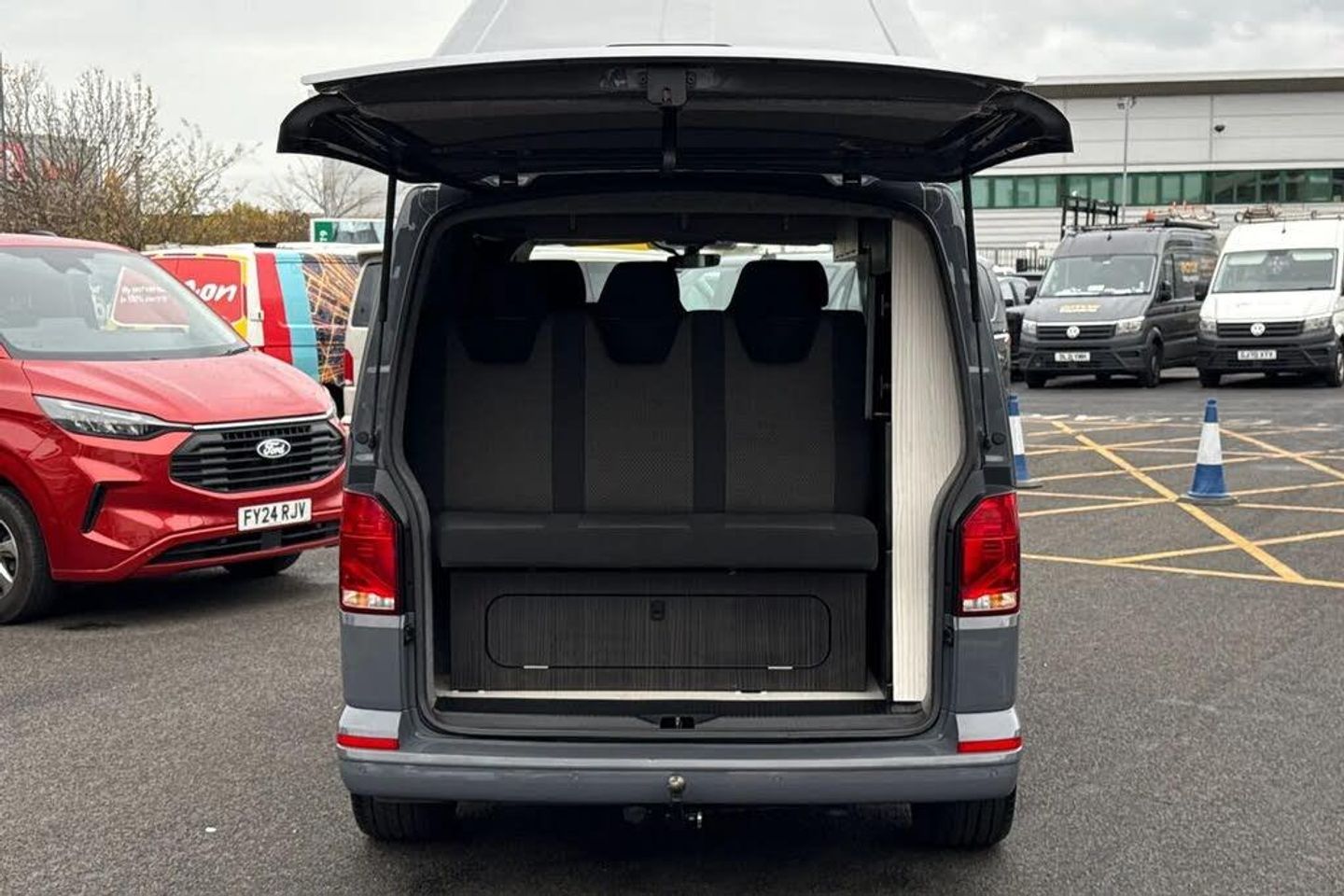 Pure Grey-Solid paint,Tailgate without window,Rubber floor covering in cab,Dual passenger seat in cab with integrated storage compartment,2 remote control folding keys,Solid - Pure grey,Bricks woven fabric - Titanium/Palladium black,Steel spare wheel with original equipment tyre,Heat insulating glass (green) in cab and passenger/load compartment,Heated front windscreen,16" chassis with 16" brake system,Radiator grille with 2 chrome trims,Transporter nameplate on the rear fender,Front fog lamps with cornering light,Electronic stability control,ABS,ASR with deactivation button,hill start assist and brake assist system,Start/stop system with regenerative breaking,Adaptive cruise control,Cross wind assist,Left convex exterior mirror,Power folding adjustable door mirrors with separately heated,Right convex exterior mirror,3 point height adjustable seat belts on outer seats cab with electric pretensioners,Driver and front passenger airbag with front passenger airbag deactivation,Warning buzzer and light for driver and front passenger seat belt not fastened,Without child safety lock in passenger compartment,Mobile phone interface,2 USB interfaces type C in dashboard,4 speakers with 2 tweeters and 2 woofers,Composition colour radio with 6.5" touchscreen,Digital radio reception (DAB+),Volkswagen app connect,Closing rear wing door with unlatching from the inside,Rear wing doors without window apertures,Dimmable illuminated instruments,Driver alert with Multi-function display plus,Multi function display plus with black and white display,eCall emergency system,Forward collision warning front assist with autonomous emergency braking,Diesel particulate filter,Dust/pollen filter,3 spoke leather wrapped multi function steering wheel,Comfort headliner in cab,hardboard roof trim in passenger and load compartment,Heavy duty tool kit and jack,High partition,Refrigerant R134a,Standard lower part dashboard in palladium,Storage compartments on cab seats and reading light,LED Interior lighting in load and passenger compartment,Front and rear left without window closed side panel in load compartment,Interior plastic loading edge protection,Without right side window apertures in passenger and load compartment,Comfort pack - Transporter,Exterior pack without fog light- Transporter,Light and vision pack - Transporter,Non smoker pack - Transporter,Front seats on the right in 1st row of seat,Anti theft alarm system with interior monitoring in cab,backup horn and towing protection,Lockable wheel bolts,16" Clayton alloy wheels