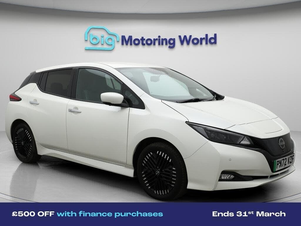 £500 towards your finance depo-Our Nissan Leaf is finished in White. Specification includes a range of fantastic features including £500 towards your finance deposit, 17'' Alloy Wheels, Part Leather Seats, Leather Seats, Apple CarPlay, Satellite Navigation, Privacy Glass, Heated Seats, Rear View Camera, Heated Rear Seats Specification information is supplied by CAPHPI and may vary to the actual car. This data does not form any part of a buying contact. Please check specification prior to purchase in-store. The MOT is valid until September 2026, visit bigmotoringworld.co.uk for more photos, a 360 tour, service history and a free HPI report.Were BIG on peace of mind and this White Nissan Leaf has completed our comprehensive 200 point inspection and passed all checks. Its ready for you to drive away with immediate collection in-store. We include a 90-day warranty as standard plus an option to extend for up to 3 years.Reserve this car exclusively for you, safely and securely at bigmotoringworld.co.uk, with a fully refundable £99 deposit. Test drive before you buy, with no commitment, no hassle and a completely haggle free experience. Still searching and want to see thousands more cars? We are BIG on choice with over 8000 cars to choose from.Visit our award winning web site bigmotoringworld.co.uk.Were Big Motoring World and were BIG on what matters to you.
