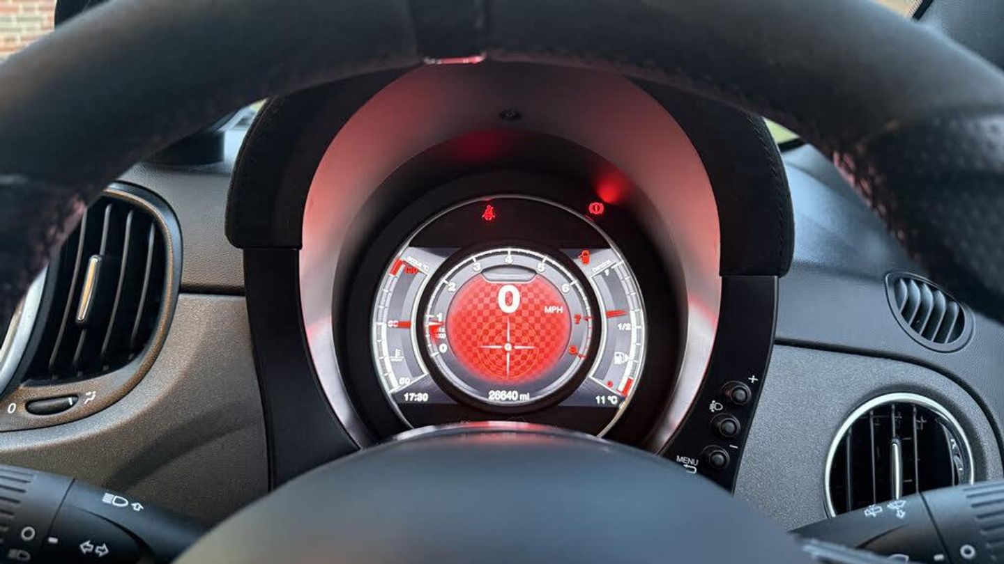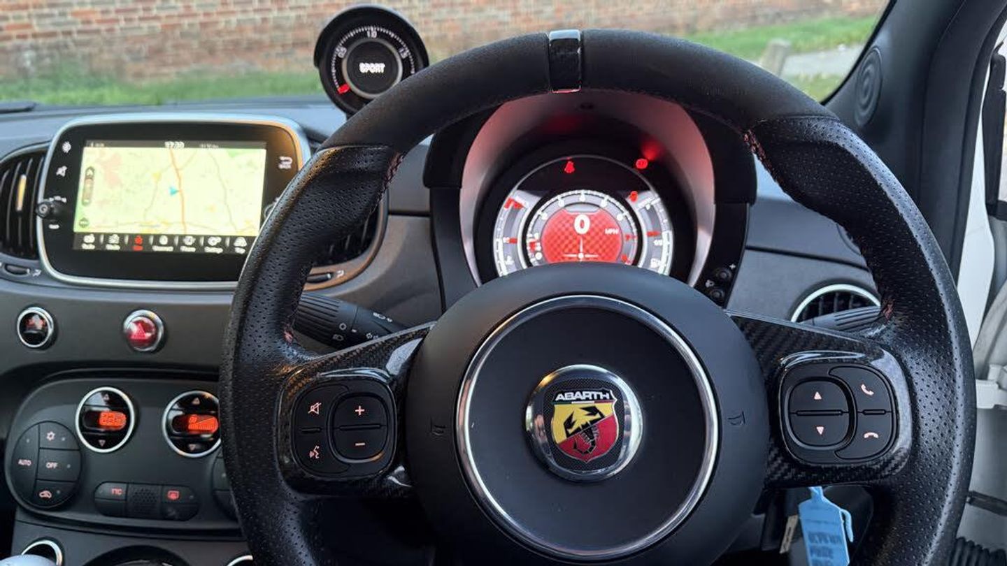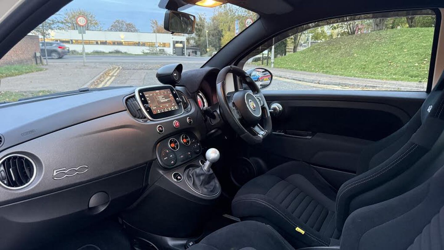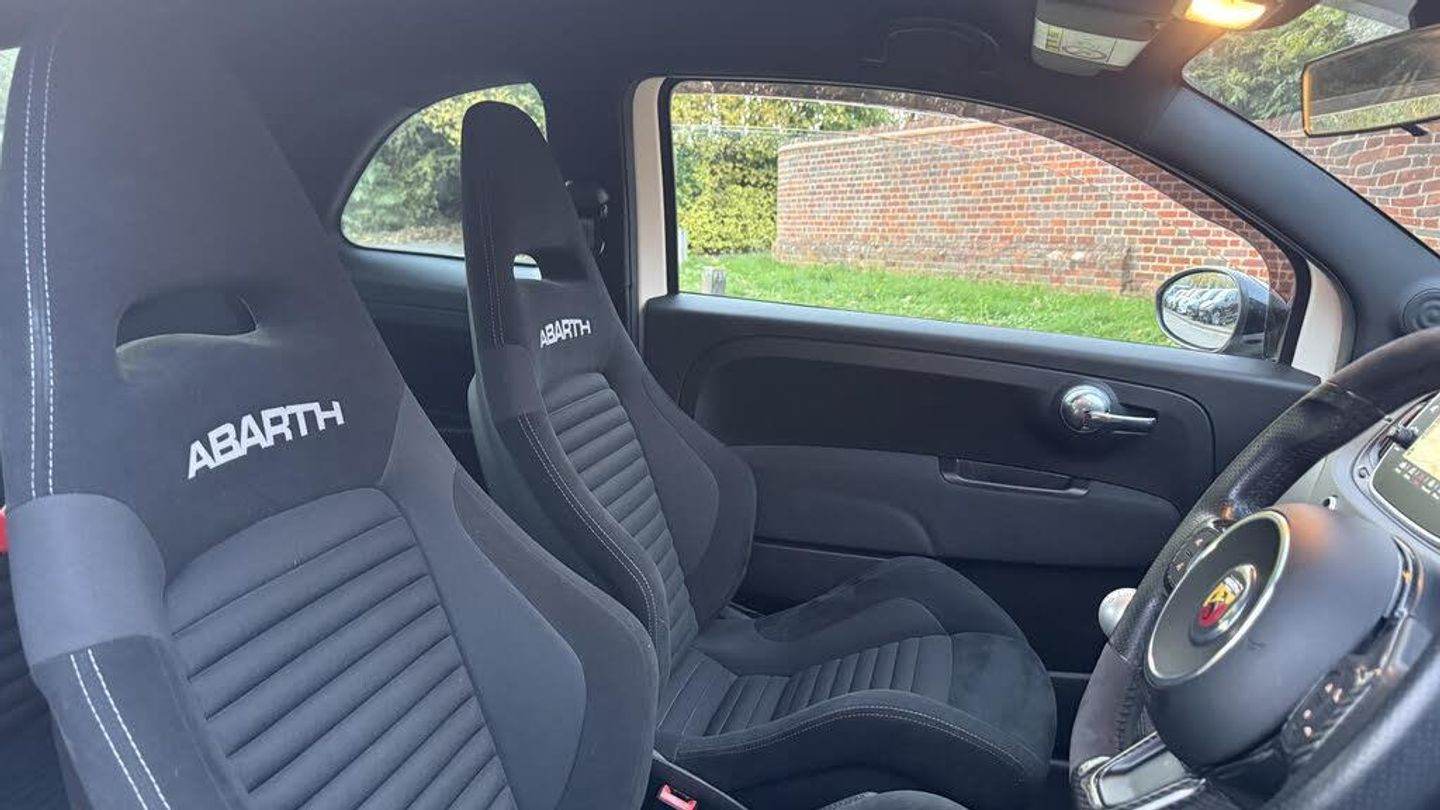 Dualdrive PAS, Rear parking sensors, Sports button, TFT display screen, Trip computer, U-connect access via mobile, Koni rear suspension with FSD technology (Frequency Selective Damping), Sports suspension, Torque transfer control (TTC), Bluetooth audio streaming, Anthracite bumper inserts, Body coloured bumpers, Dark tinted rear windows, Dual mode record monza exhaust system with four tailpipes, Electric front windows, Front fog lights, LED daytime running lights, Rear wiper, 12V socket, Abarth corsa front seats by sabelt in fabric, Aluminium gear knob, Aluminium sports pedals, Auto climate control, Front head restraints, Glovebox, Height adjustable steering wheel, High performance BMC air filter, Interior stowage net, Rear headrests, Sports alcantara leather multifunction steering wheel with carbon fibre detailing, 3x3 point rear seatbelts, ABS, Brembo brakes, Drilled and ventilated front brake discs, Drilled rear brake discs, Driver and passenger airbags, Drivers knee airbag, ESP + ASR/MSR + HBA + Hill holder, Tyre pressure monitoring system, Window airbags, Alarm, Central locking, Immobiliser, Remote central locking, Fix and go kit