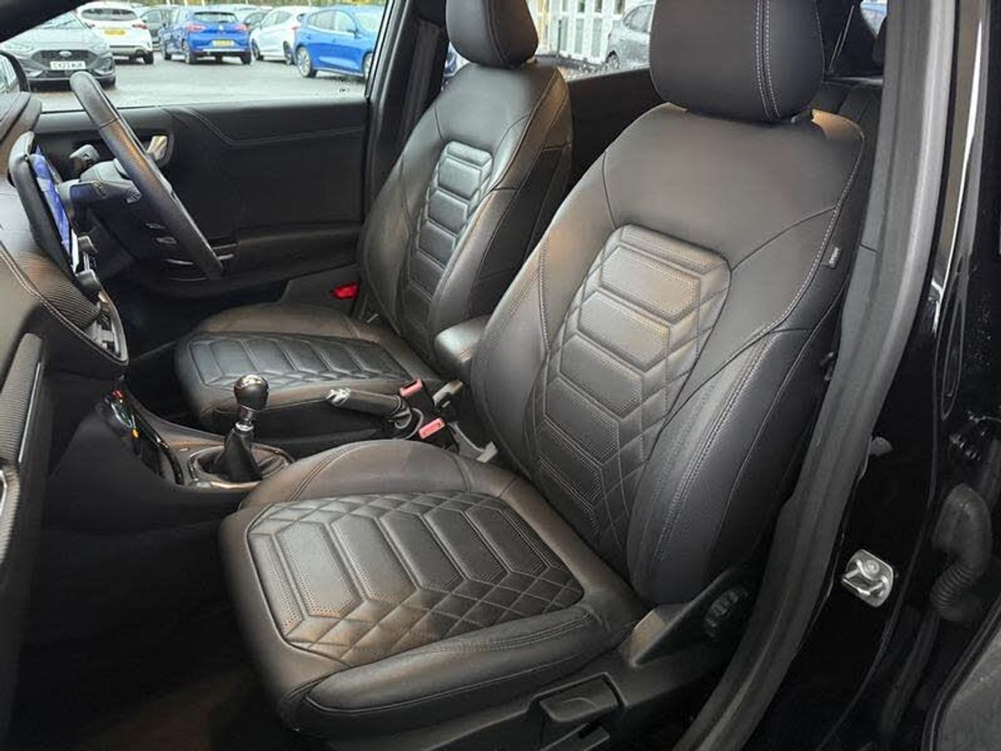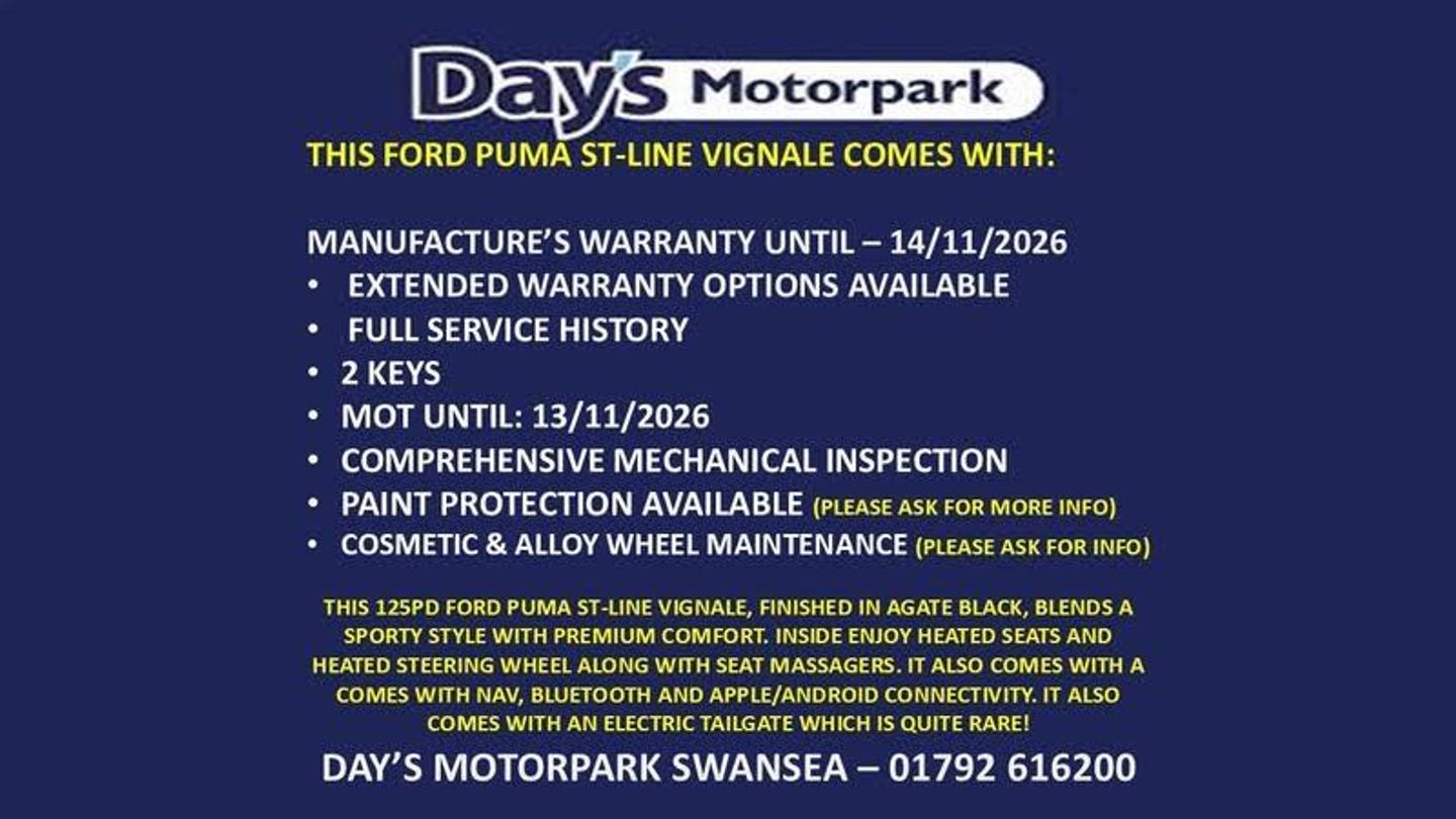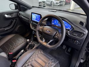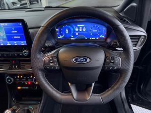18in Alloy Wheels - Unique 5x2-Spoke - ST-Line Vignale, ABS - Anti-lock Braking System, Acoustic Laminated Windscreen, Active Grille Shutter, Automatic Dimming Rear View Mirror, Automatic Headlights with Rain-Sensing Wipers and Auto High Beam, B&O Premium Audio System and Ford SYNC 3 Navigation, Brighter Upper Door Frame Mouldings, Carbon-Look Interior Deco Spears, Centre Console - Premium with Openable Stowage Area with USB Connectivity - 2 Cupholders and 12v Power Point, Courtesy Lights - Ambient LED Courtesy Lighting - Single Colour, Cruise Control with Intelligent Speed Assist, Drivers Manual 4-Way Seat Adjustment with Manual Lumbar Adjust, ESC - Electronic Stability Control and Hill Start Assist, Ecoboost Hybrid Tailgate Badge, Electric Windows - Front and Rear, Electronic Air Temperature Control - EATC, Emergency Brake Warning - Automatic Hazard Warning Lights, First Aid Kit Strap, Fixed LED Signature Headlamps, Floor Mats - Front and Rear, Ford KeyFree System, Ford MegaBox Extended Bootspace, Ford Power Starter Button, Front Bumper - Unique ST-Line Vignale Design - Body Colour, Front Door Threshold Plates - ST-Line, Front Fog Lights, Front Parking Sensors, Front Seats - Sports Style, Full Digital 12.3in Instrument Cluster, Handbrake - Black Sensico Trimmed with Stitching, Headliner - Deluxe, Instrument Panel - High Level, Intelligent Speed Assistance, LED Rear Lights, Lane Keeping Aid with Lane Departure Warning, Large Rear Spoiler - Body Colour with Centre High Mounted Stop Light, Locking Wheel Nuts, Lower Bodyside Moulding - Body Colour - High Gloss Black Painted Spear with Chrome Insert, Passenger 4-Way Seat with Lumbar Adjustment, Post Collision Braking, Power Steering, Power-Foldable Heated Door Mirrors with Puddle Lamps and Puma Logo Projection, Pre-Collision Assist with Autonomous Emergency Braking and Pedestrian-Cyclist Detection, Premium Sensico Wrapped Instrument Cluster, Privacy Glass, Puma Badge, Quickclear Heated Windscreen, Rear Bumper - ST Line Vignale Body Colour with Special Masking, Rear Parking Sensors, Rear Seats - 2-Way Head Restraint Up-Down, Rear Seats - Second Row 60-40 Folding Seats, Remote Central-Double Locking, Restrain Device Pack, ST-Line Badge, ST-Line Flat-Bottomed Leather Steering Wheel with Unique Red Stitching, Selectable Driving Modes - Normal - Eco - Sport - Slippery and Trail, Soft-feel Gearshift Boot with Metal Grey Stitching, Speed Limiter, Sports Suspension, Tailgate - Manual, Thatcham Alarm, Traction Control and Emergency Braking Assistance, Trip-Fuel Computer, Tyre Inflation Kit, Tyre Pressure Monitoring System - TPMS, Vignale Body Styling Kit, Winter Pack, Wireless Charging Pad with Electronic Air Temperature Control EATC