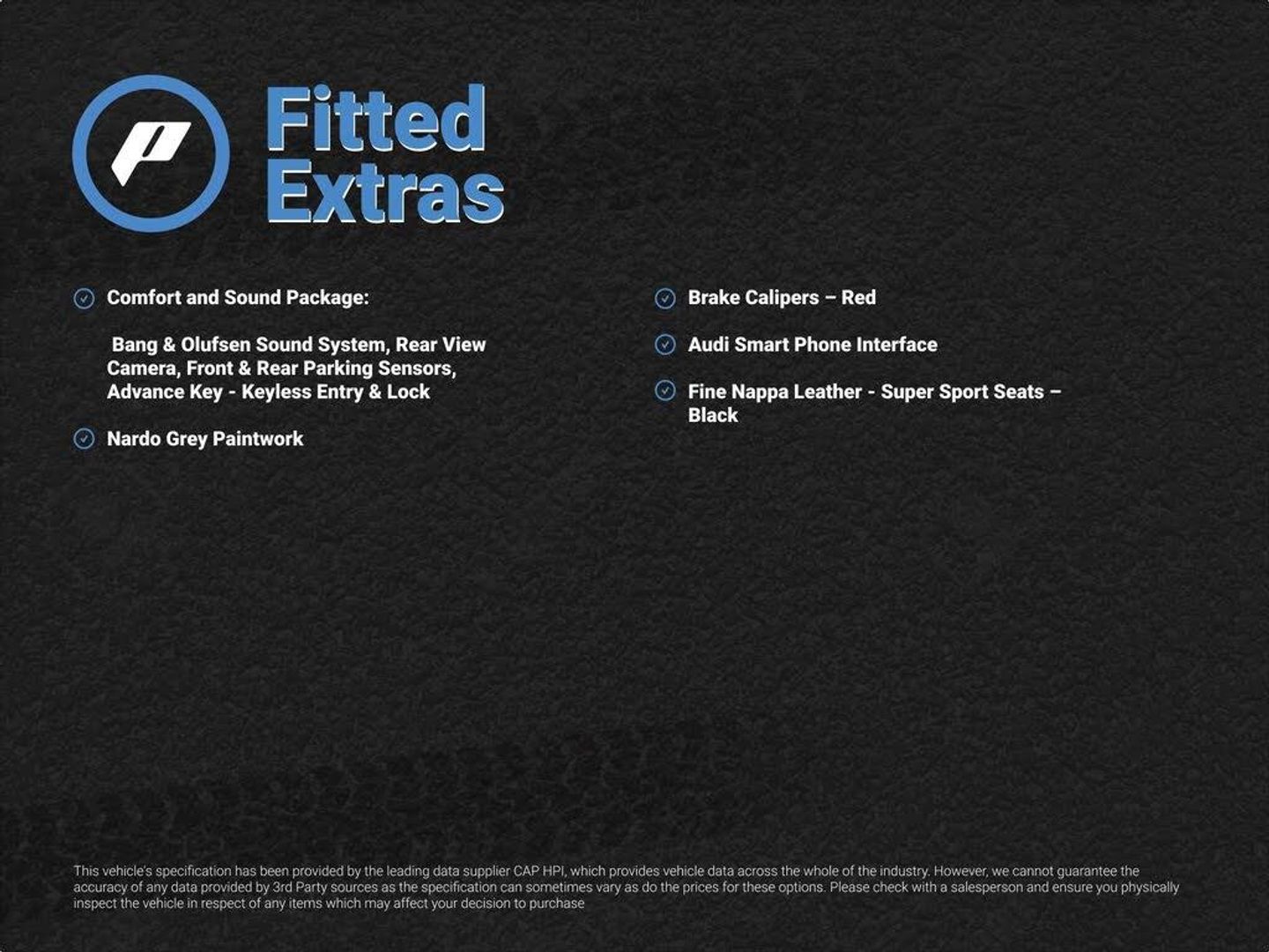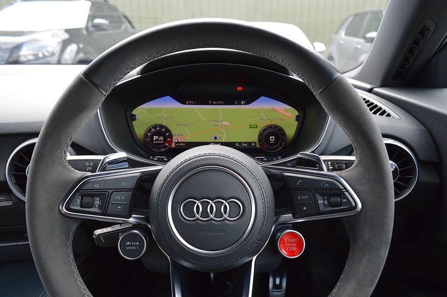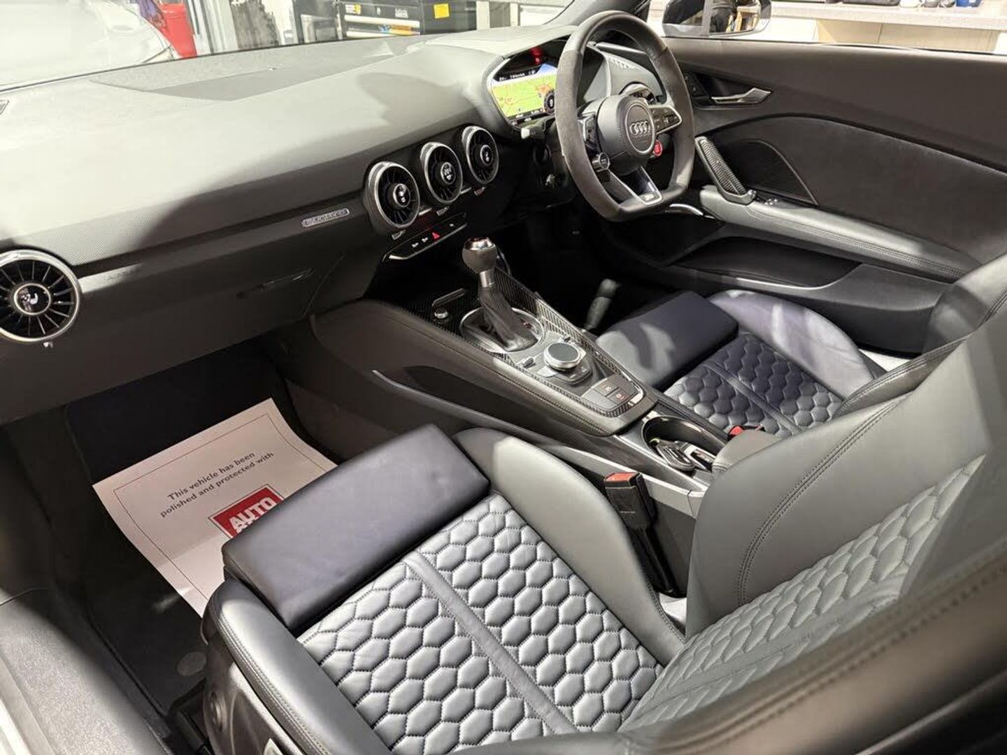 20in Alloy Wheels - 7-Spoke Rotor Design - Gloss Anthracite Black - Diamond Cut Finish, All Weather LED Headlights, Anti Theft Locking Wheel Bolts, Anti-Theft Alarm, Audi Connect Infotainment Services (36 Month Subscription From New), Audi Drive Select, Audi Phone Box with Wireless Charging, Audi Smartphone Interface, Audi Sound System, Audi Virtual Cockpit with RS Specific Display, Black Door Mirrors, Black Styling Package, Bluetooth Interface, Brake Calipers - Painted Black with TT RS Logo, Coloured Interior Elements in Slate Grey, Cruise Control with Speed Limiter, DAB Digital Radio, Deluxe Automatic Air Conditioning, Door Sill Trims with Aluminium Inlays and TTRS Logo, ESC - Electronic Stabilisation Control with Sport Mode inc ABS - EBD - ASR - EDL, Electric Windows - Front, Electromechanical Parking Brake, Extended Leather Package, Exterior Mirrors - Electrically Adjustable - Heated and Folding - Automatically Dimming on Both Sides - Including Automatic Kerb-Side Function for the Passenger-Side, First Aid Kit and Warning Triangle, Front Airbags with Front Passenger Deactivation, Head Level Airbags, Headlights - High-Beam Assist, Heated Front Seats, Hill Hold Assist, ISOFIX Child Seat Mounting for Front Passenger with Airbag Deactivation, ISOFIX Child Seat Mounting for Rear Seats, Inlays - Carbon, Keyless Go, LED Interior Lighting Pack, Light and Rain Sensor, MMI Navigation Plus including MMI Touch, Online Media Streaming, Pedals and Footrest - Stainless Steel, Privacy Glass, Progressive Steering, RS Body Styling, RS Brake System, RS Gear Lever Knob - Alcantara, RS Sports Exhaust System, RS Sports Suspension, TT RS Fixed Rear Wing, TTRS Badge on the Steering Wheel, TTRS Exhaust Sound Button in Centre Console, TTRS Sport Leather and Alcantara Multi-Function Steering Wheel, Tool Kit, Tyre Pressure Warning Light, Tyre Repair Kit, Comfort and Sound Package, Bang & Olufsen Sound System, Rear View Camera, Front & Rear Parking Sensors, Advance Key - Keyless Entry & Lock, Brake Calipers - Red, Audi Smart Phone Interface, Fine Nappa Leather - Super Sport Seats - Black, Nardo Grey Paintwork