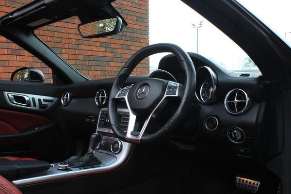 OVER 200 VEHICLES IN GROUP STOCK. Finished in Obsidian Black metallic with full Bengal Red Exclusive Nappa leather interior (£940). Features include panoramic glass vario sunroof (£410), Air Scarf neck-level heating system (£395), 18 AMG ten spoke alloy wheels in black (£525), Comand satellite navigation, heated AMG sport seats with memory package, air conditioning, Bluetooth connectivity with media streaming, DAB digital radio, automatic bi-xenon headlights with LED daytime running lights, active high beam, cruise control, AMG sports suspension, AMG sports exhaust system, AMG high-performance braking system, mirror package (£350), wind deflector, brushed aluminium trim, voice control, multifunctional AMG leather steering wheel with paddleshift, automatic transmission plus much more standard specification. This SLK55 AMG has £2,620 worth of options and is offered in excellent condition having covered 83000 miles from new. The car comes complete with a service history. GOOGLE YORKSHIRE VEHICLE SOLUTIONS FOR OUR CUSTOMER REVIEWS. PLEASE CALL OR E-MAIL FOR FURTHER DETAILS OR TO ARRANGE A PERSONALISED VIDEO OR VIEWING. THIS DEALER HAS COMMITTED TO AA CARS STANDARDS AND IS APPROVED BY THE CHARTERED TRADING STANDARDS INSTITUTE.-SUNROOF, AIR SCARF, 18'S, NAV