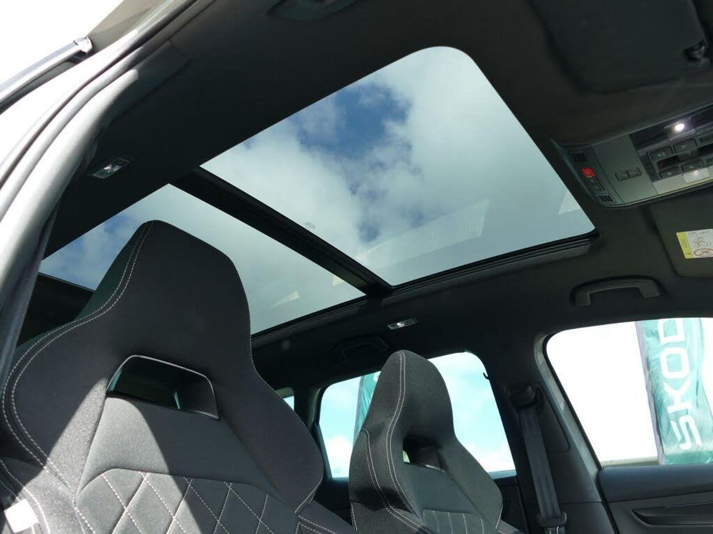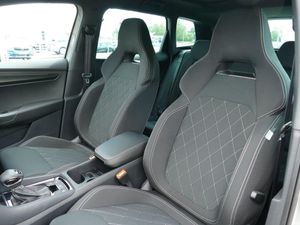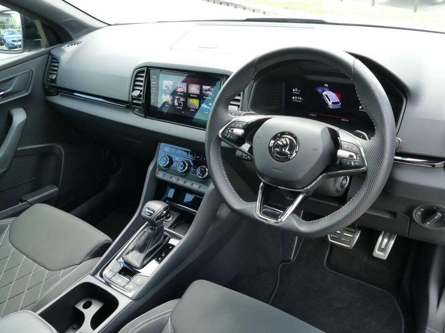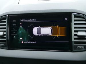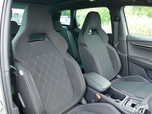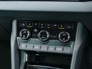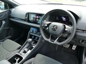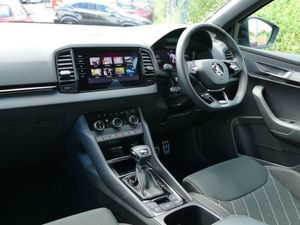 8" Digital display, Care connect, Driver fatigue sensor, Emergency services call system, Outside temperature gauge, Service interval indicator, SmartLink wireless for Apple and wired for Android, Start/stop system with regenerative braking, USB C Port x 2 in front centre console, Virtual cockpit, Virtual pedal with electrically operated boot door, 8 Speakers, DAB radio with Bluetooth, USB connection, Wireless charging without wireless aerial connection, Acoustic glass, Aero front windscreen wipers with intermittent function, Auto dimming rear view mirror with light and rain sensors, Black door mirrors, Black electric window control buttons, Black radiator grille, Black roof rails, Body colour door handles, Electric front and rear windows with child proof lock, Front door steps with SportLine logo, Heated rear windscreen, LED daytime running lights, LED rear lights with high functionality welcome effect and dynamic indicators, Light assistant (coming/leaving home/tunnel light), Panoramic sliding sunroof, Plastic scuff plates, Privacy glass, Protective door side sills in body colour, Rear diffuser, Rear side wing doors, Rear spoiler, Rear window wiper with washer system and intermittent control, Safety reflectors on front doors, Skoda lettering on tailgate in black, Sportline badge on front fender, Sportline decorative inserts with badging, Sports front and rear bumpers, 1.5 litre bottle holders in driver and front passenger door panels, 12V socket in boot, 12v socket in front centre armrest with storage compartment and rear air vents, 3 rear height adjustable headrests, 3 seat bench in 2nd row, 3 spoke leather sports multifunction steering wheel and silver stitching with gear shift paddles, 4 foldable roof handles with rear coat hooks, Black floor carpet, Black roof headlining, Chrome inner door handles, Double sided boot floor, Foldable hooks in the boot, Front head restraints, Height adjustable front three point seats belts with tensioners, Height/reach adjust steering wheel, Ice scraper, Illuminated glovebox, Illuminated luggage compartment, Interior noise suppression, Isofix child seat preparation outer rear, Manual lumbar support for front seats, Pen holder, Pollen filter, Rear boot cover, Rear reading lights, Rear seats fixed folding and divided 60:40, Rubbish bin door, Safety vest holder, Single front passenger seat, Storage box in upper central dashboard closed, Sunvisors with illuminated vanity mirrors, Textile floor mats, Ticket holder, Titan black interior ceiling, Welcome animation with sportline logo, Boot pack - Karoq, Light Pack - Karoq, Parking pack - Karoq, Automatic door unlocking in case of crash, Automatic fuel cut off in case of crash, Child locks on rear doors, Driver airbag, Electronic parking brake with auto hold function, Emergency rear braking signal, ESC including ABS, MSR, ASR, EDS, HBA, DSR, RBS, MKB and traction control, Front side airbags, Hill hold control, Knee airbags, Passenger airbag with switch-off function, Pedestrian monitor, Seatbelt reminder signalisation and pretensioner for all seats, Three point seatbelts rear, Two tone horn, Tyre pressure display, Tyre pressure monitor, Alarm with interior monitoring, back up horn and tilt sensor with safe function, Electronic engine immobiliser, Keyless entry and start/stop, Remote central locking with 2 remote folding keys, Black air vent surround, Black centre console, Satin black dashboard, Satin black door trim, 19" Sagitarius anthracite alloy wheels with matt black aero inserts, Anti-theft wheel bolts protection, Matt black aero hub caps, Storage on wheel cover, Tool kit