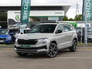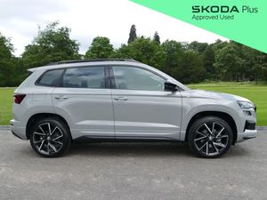 Introducing this 2023(73), Skoda Karoq SportLine 2.0 TSI 190PS 4x4 DSG automatic finished in a stunning Meteor Grey paint with the optional extra 19" Vega Black Polished alloy wheels. Comes with Simpsons Skoda service history. This example comes equipped with a range of desirable optional features, including the 9.2" Columbus satellite navigation system and the Travel Assist package, which incorporates Front Assist, Adaptive Cruise Control, Traffic Sign Recognition, a lane-keeping system and a USB-C port conveniently positioned in the rear-view mirror. Additional optional features include tri-zone climate control, ensuring optimum comfort for all occupants, and a steel space-saving spare wheel for added practicality. Front and rear parking sensors combined with a rear-view camera make manoeuvring simple and stress-free. The heated steering wheel and heated front seats provide welcome comfort during colder months, while the panoramic sunroof floods the cabin with natural light and fresh air. The infotainment system includes DAB radio, Bluetooth, Apple CarPlay and Android Auto for seamless connectivity. An electronically operated boot with a virtual pedal offers hands-free access, while Drive Mode Select allows you to tailor performance to your preference. Two USB-C ports ensure your devices stay charged throughout every journey. ULEZ compliant. Part exchanges welcome. As a family-owned business with over 80 years of experience, the Simpson family has looked after the motoring needs of Lancashire since 1944. We are driven by customer satisfaction and all our cars are carefully prepared to our own and Skoda's exacting approved standards, both mechanically and cosmetically, additionally with a minimum of 12 months warranty, 12 months breakdown roadside assistance and minimum 6 months MOT. For more information, to book your test drive or to request a personalised walk-around video of a vehicle, please contact our team at Simpsons Skoda Preston.