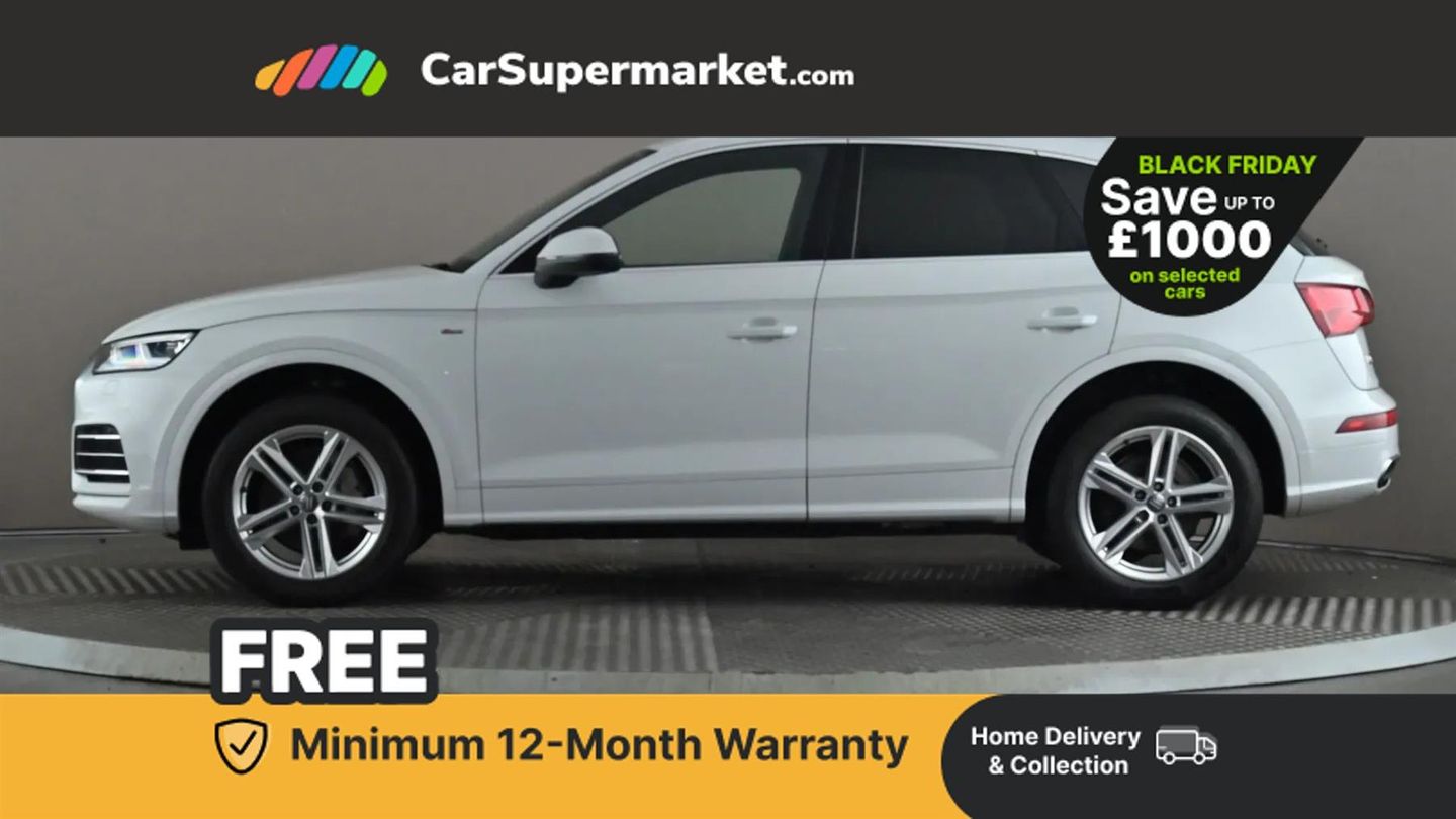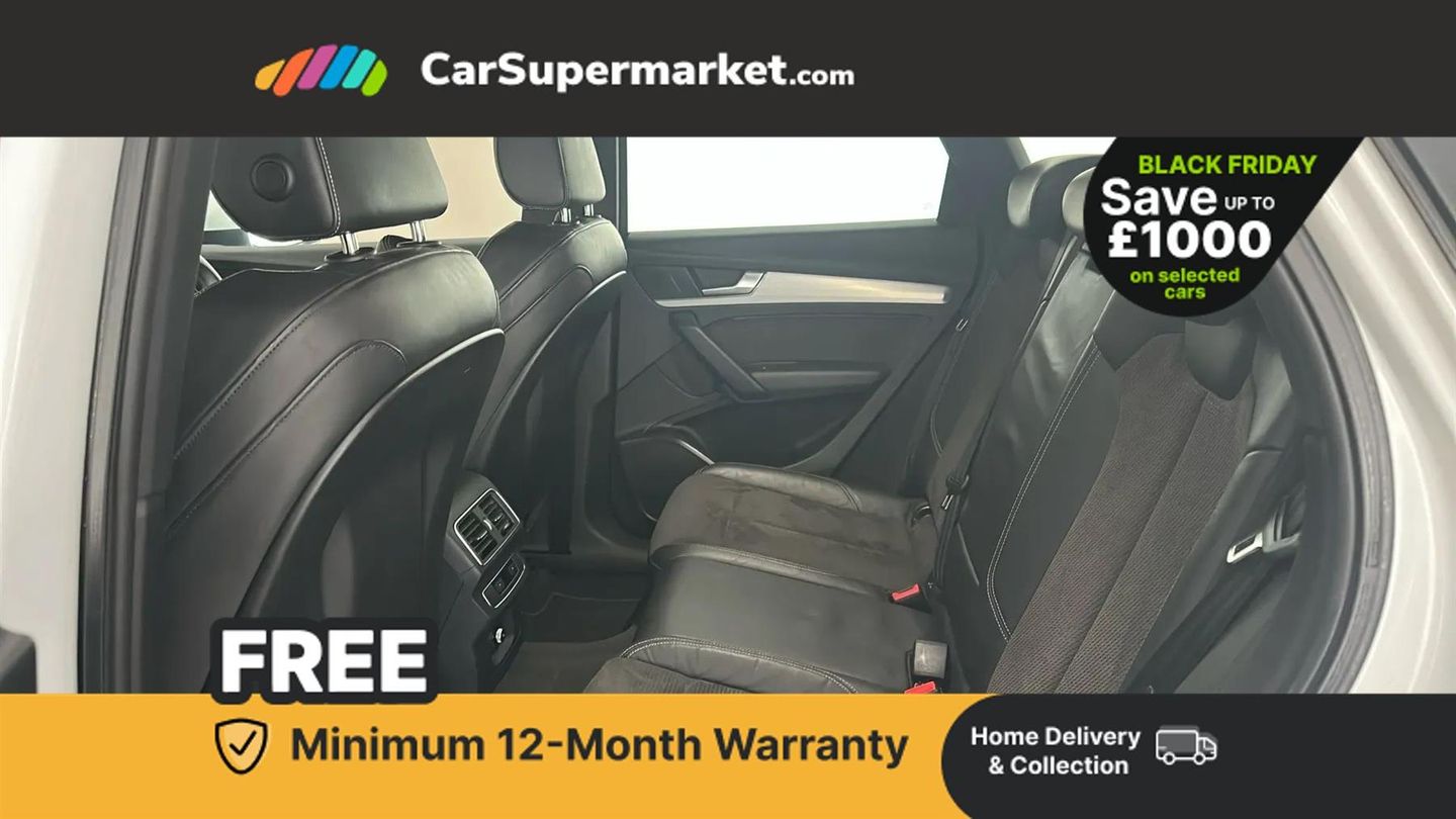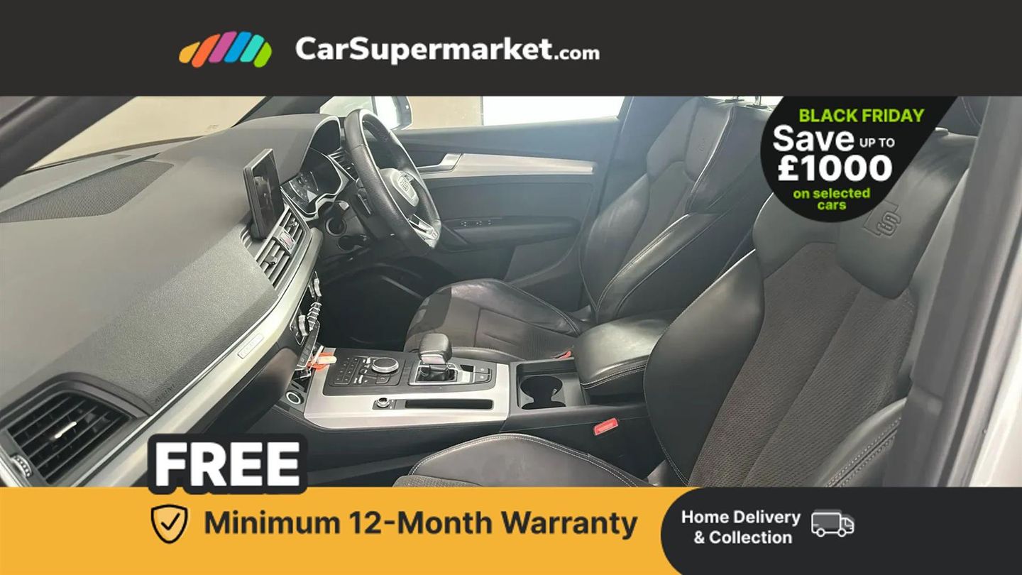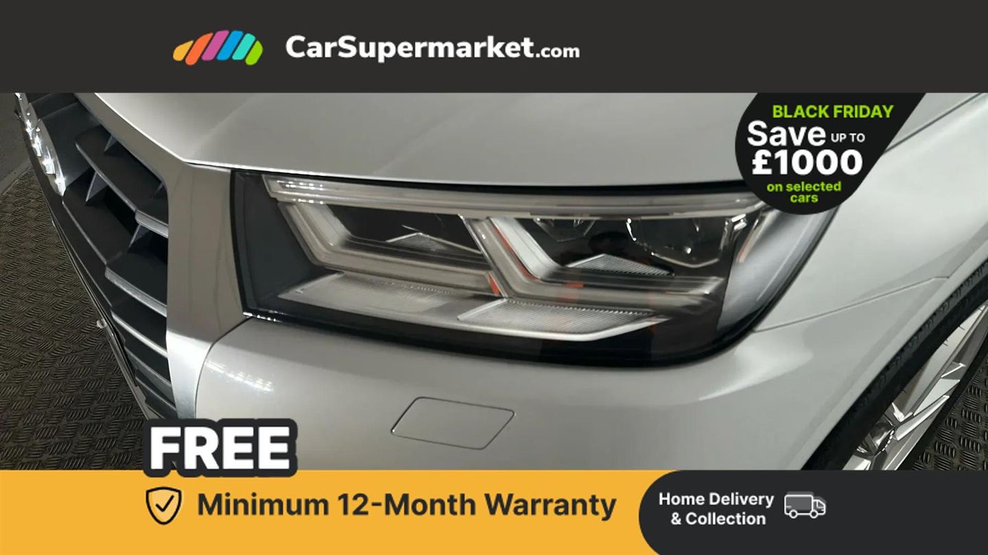 7" Colour driver information system,Audi connect safety and service (e-call),Audi drive select,Audi parking system plus with front and rear sensors,Audi Pre sense collision avoidance,Audi smartphone interface,Automatic start-stop system with coasting functionality and efficiency programme,Cruise control + speed limiter,Electro - mechanical power assisted steering,MMI Navigation,Mobile telephone preparation - bluetooth interface,Power tailgate,Service interval indicator,Voice control system,Diesel particulate filter,Dynamic suspension,Quattro on demand,2 x USB charging port with aux input socket,2x SD card slot,CD player,DAB Digital radio,MMI radio plus with 7" colour MMI screen and MMI controller,Acoustic windscreen,Air inlets in matt titanium black with blades in matt aluminium silver,Aluminium roof rails,Auto dimming rear view mirror,Automatic headlight levelling,Body colour bumpers,Body colour door mirrors,Body colour rear diffuser with matt aluminium silver surrounds,Body colour S Line side skirts,Body colour underbody protection,Chrome exhaust tailpipe,Electric adjustable/heated/folding door mirrors,Front and rear electric windows,High beam assistant,LED headlights with LED rear lights + dynamic rear indicators,Light and rain sensor for auto activation of lights and windscreen wipers,Loading sill protector in stainless steel,Privacy glass with front acoustic glazing,Rear wiper,S front and rear bumpers,S Line badges on the front wings,S Line rear spoiler,Twilight grey matt radiator grille with matt aluminium horizontal chrome struts,3 rear headrests,40:20:40 split folding rear seat with rear centre armrest,Black cloth headlining,Contrast stitching on seats, steering wheel and gear lever gaiter,Deluxe 3 zone electronic climate control,Front centre armrest,Front sport seats with S embossed logo,Front/rear floor mats,Heated front seats,Height adjustable front head restraints,Height/reach adjustable steering column,Illuminated door sill trims with S logo,ISOFIX child seat mounting and top tether,Luggage compartment carpet,Manual seat adjustment with 4-way electric lumbar support,Perforated leather gearknob,Removable luggage compartment floor,Stainless steel pedals,Sunvisors with vanity mirrors,Trunk roller cover,High gloss pack - Q5,LED interior light pack - Q5,Non Smokers pack,3 point seatbelts on all seats,6 airbags - Driver, front passenger, curtain and side airbags,Electromechanical parking brake,Electronic stabilisation control including ABS, ASR and EDL,Front passenger airbag deactivation,Hill descent control,Hill hold assist,Multi collision brake assist,Pop-up bonnet for pedestrian protection,Pre sense city,Seat belt force limiter,Seatbelt monitoring,Tyre pressure warning,Warning triangle and first aid kit,Anti theft alarm,Anti-theft wheel bolts,Keyless Go access/ignition system,Remote central locking,Matt brushed aluminium inlays,Tool kit,24-litre AdBlue Tank and 70-litre Fuel Tank,Glacier White