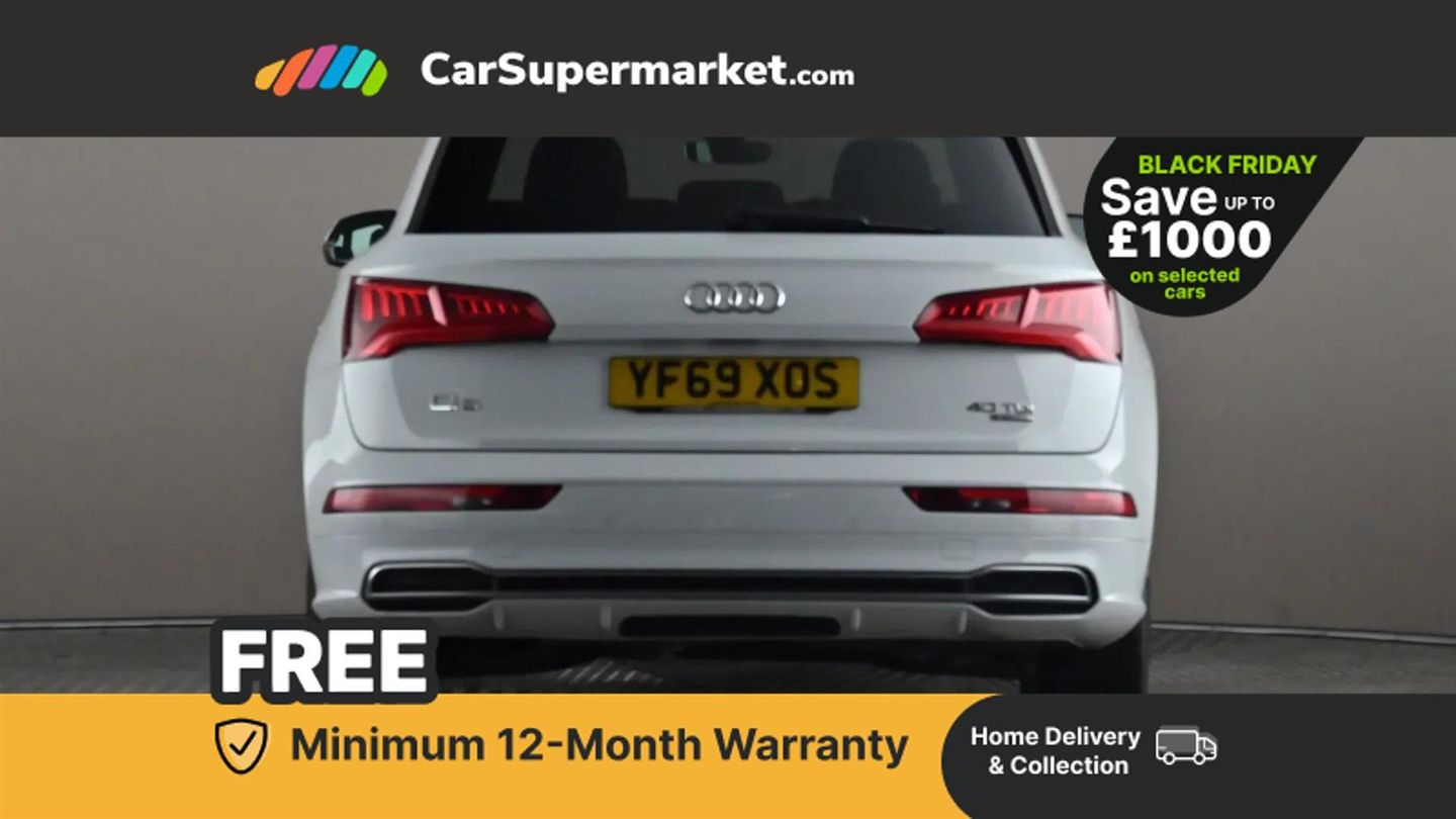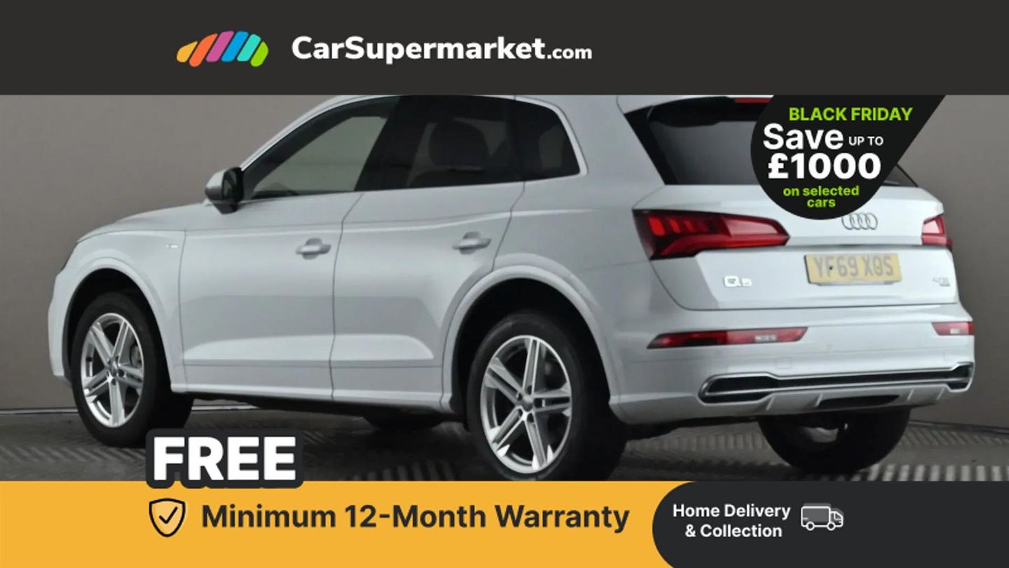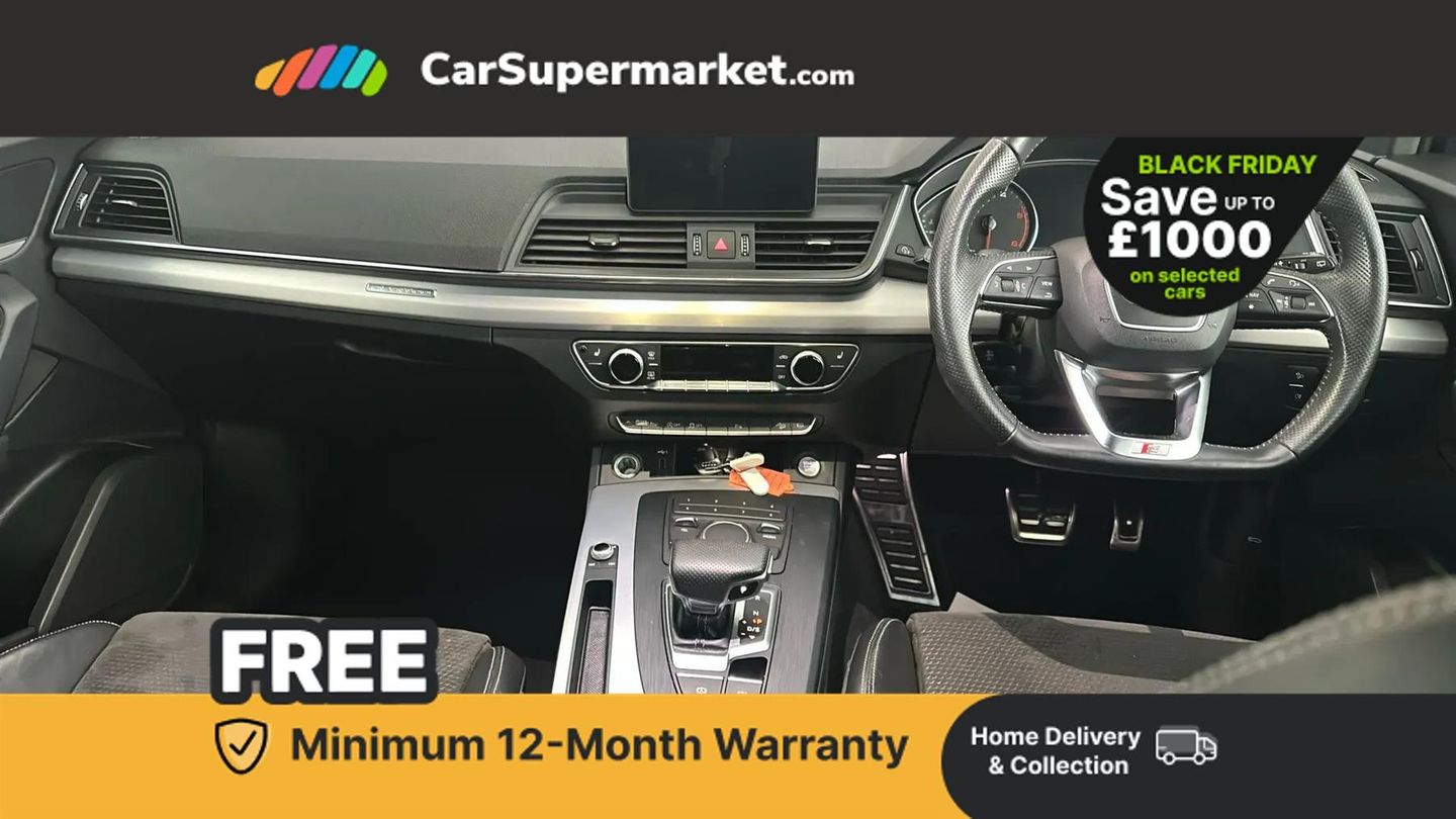 7" Colour driver information system,Audi connect safety and service (e-call),Audi drive select,Audi parking system plus with front and rear sensors,Audi Pre sense collision avoidance,Audi smartphone interface,Automatic start-stop system with coasting functionality and efficiency programme,Cruise control + speed limiter,Electro - mechanical power assisted steering,MMI Navigation,Mobile telephone preparation - bluetooth interface,Power tailgate,Service interval indicator,Voice control system,Diesel particulate filter,Dynamic suspension,Quattro on demand,2 x USB charging port with aux input socket,2x SD card slot,CD player,DAB Digital radio,MMI radio plus with 7" colour MMI screen and MMI controller,Acoustic windscreen,Air inlets in matt titanium black with blades in matt aluminium silver,Aluminium roof rails,Auto dimming rear view mirror,Automatic headlight levelling,Body colour bumpers,Body colour door mirrors,Body colour rear diffuser with matt aluminium silver surrounds,Body colour S Line side skirts,Body colour underbody protection,Chrome exhaust tailpipe,Electric adjustable/heated/folding door mirrors,Front and rear electric windows,High beam assistant,LED headlights with LED rear lights + dynamic rear indicators,Light and rain sensor for auto activation of lights and windscreen wipers,Loading sill protector in stainless steel,Privacy glass with front acoustic glazing,Rear wiper,S front and rear bumpers,S Line badges on the front wings,S Line rear spoiler,Twilight grey matt radiator grille with matt aluminium horizontal chrome struts,3 rear headrests,40:20:40 split folding rear seat with rear centre armrest,Black cloth headlining,Contrast stitching on seats, steering wheel and gear lever gaiter,Deluxe 3 zone electronic climate control,Front centre armrest,Front sport seats with S embossed logo,Front/rear floor mats,Heated front seats,Height adjustable front head restraints,Height/reach adjustable steering column,Illuminated door sill trims with S logo,ISOFIX child seat mounting and top tether,Luggage compartment carpet,Manual seat adjustment with 4-way electric lumbar support,Perforated leather gearknob,Removable luggage compartment floor,Stainless steel pedals,Sunvisors with vanity mirrors,Trunk roller cover,High gloss pack - Q5,LED interior light pack - Q5,Non Smokers pack,3 point seatbelts on all seats,6 airbags - Driver, front passenger, curtain and side airbags,Electromechanical parking brake,Electronic stabilisation control including ABS, ASR and EDL,Front passenger airbag deactivation,Hill descent control,Hill hold assist,Multi collision brake assist,Pop-up bonnet for pedestrian protection,Pre sense city,Seat belt force limiter,Seatbelt monitoring,Tyre pressure warning,Warning triangle and first aid kit,Anti theft alarm,Anti-theft wheel bolts,Keyless Go access/ignition system,Remote central locking,Matt brushed aluminium inlays,Tool kit,24-litre AdBlue Tank and 70-litre Fuel Tank,Glacier White