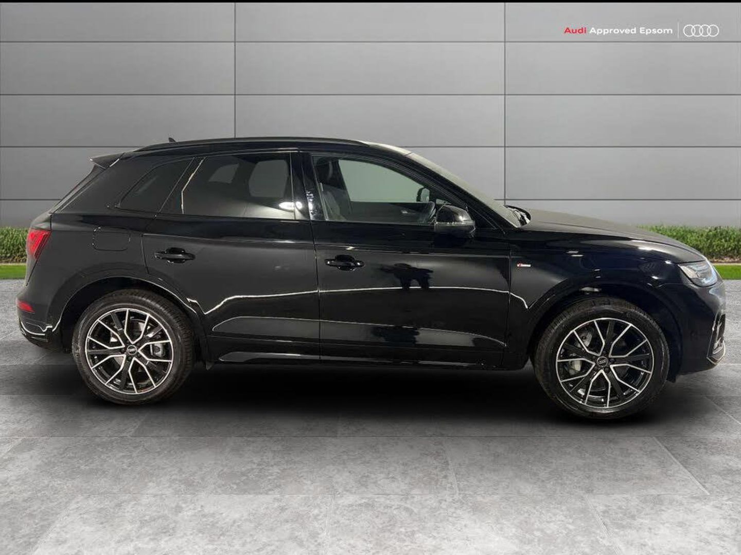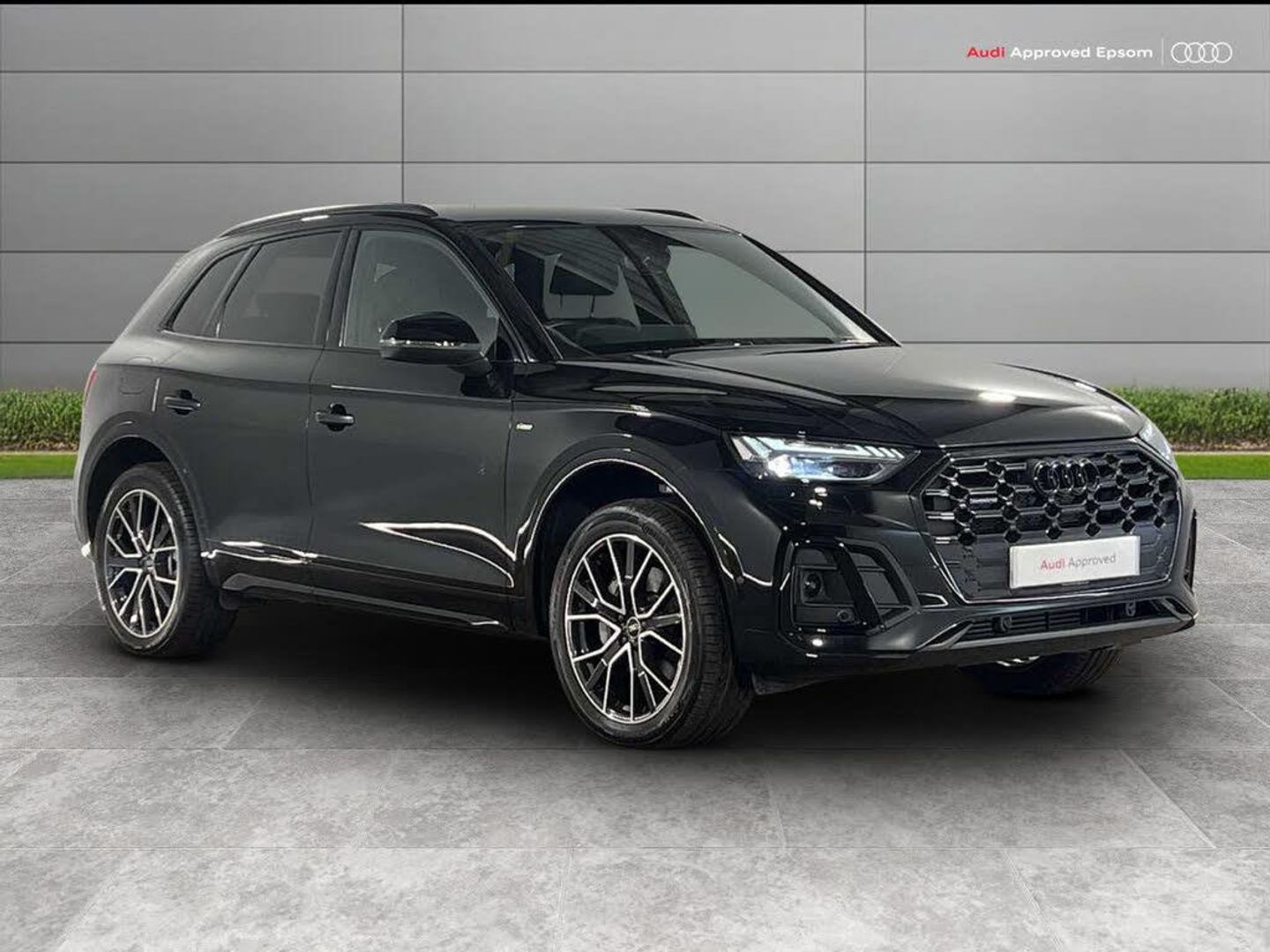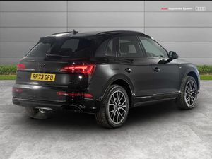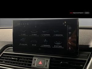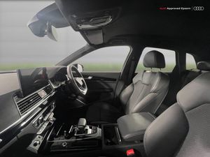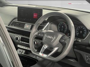 Acoustic front and rear parking sensor, Audi connect safety and service (e-call), Audi drive select, Audi virtual cockpit with 12.3" screen with specific display, Audi wireless smartphone interface, Automatic start-stop system with coasting functionality and efficiency programme, Bluetooth interface, Camera based traffic sign recognition, Electro - mechanical power assisted steering, Lane departure warning, MMI navigation plus with 10.1" touch screen, Power tailgate, Reversing camera, Service interval indicator, Voice control system with Audi hotword activation "Hey Audi", 3 pin 10 amp domestic charging cable, 7.4 kW onboard charger, Dynamic suspension, Industrial connector CEE 32A, 230V, Quattro on demand, Type 2 mode 3 22kW 32 amp charging cable, Type 2 socket for AC charging, 2 x USB charging port with aux input socket, 8 loudspeakers, DAB Digital radio, Acoustic windscreen, Auto dimming door mirrors, Auto dimming frameless rear view mirror, Automatic headlight adjustment, Automatic headlights and windscreen wipers, Black roof rails, Black styling with black rings, Body colour bumpers, Body colour rear diffuser with matt aluminium silver surrounds, Body colour underbody protection, Chrome plated exhaust trims, Daytime running lights, Door sills in Selenite silver, Electric adjustable/heated/folding door mirrors, Front air inlet surrounds in aluminium, Front and rear electric windows, Front radiator grille in honeycomb design, LED 3rd brake light, LED headlights and LED tail lights, Loading edge protection in stainless steel, Lower bumpers painted in contrast Manhattan grey, Rear chrome trim strip below lights, Rear privacy glass and rear side windows, Rear side wing doors, Rear wiper, Roof bars, S Line badges on the front wing panels, S Line front and rear bumpers, S Line rear spoiler, S Line side skirts, 3 rear headrests, 3 seater rear seat bench, Black cloth headlining, Comfort front centre armrest, Contrast stitching on seats, steering wheel and gear lever gaiter, Deluxe 3 zone electronic climate control, Front head restraints, Front sport seats with S embossed logo, Front/rear floor mats, Gear lever in black leather, Heated front seats, Height/reach adjustable steering column, Illuminated door sill trims with S logo, Luggage compartment cover, Manual seat adjustment with 4-way electric lumbar support, Rear seat bench plus-adjust for forwards/backwards position/backrest angle, load through hatch and remote backrest release, Single front passenger seat, Sunvisors with vanity mirrors, Top surface of the rear centre armrest in artificial leather, High gloss pack - Q5, LED interior light pack - Q5, 3 point seatbelts on all seats, 6 airbags - Driver, front passenger, curtain and side airbags, Attention and drowsiness assist, Electrically operated child locks on rear doors, Electromechanical parking brake, Electronic stabilisation control including ABS, ASR and EDL, First aid kit with warning triangle and vests, Front passenger airbag deactivation, Hill descent control, Hill hold assist, ISOFIX child seat mounting for front passenger seat and ISOFIX child seat mounting with Top Tether for outer rear seats, Multi collision brake assist, Pop-up bonnet for pedestrian protection, Pre sense city, Seatbelt monitoring, Tyre pressure warning, Anti theft alarm, Anti-theft wheel bolts, Remote central locking, Remote control key with SAFELOCK and keyless go, Air vents inserts and centre console in gloss black, Tool kit, Tyre repair kit
