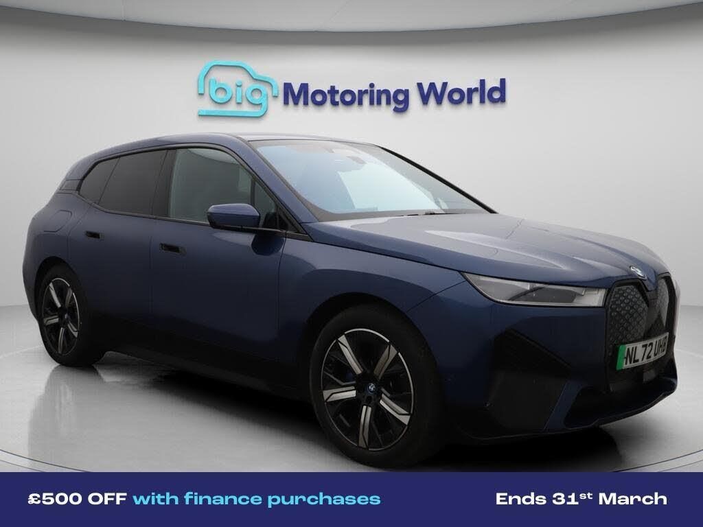 All Wheel Drive,Head up Displa-Our BMW iX comes with optional extras worth £795. Specification includes a range of fantastic features including All Wheel Drive, Head up Display, Leather Seats, Apple CarPlay, Electric Seats, Harman Kardon Speakers, Connected Package Professional, M Sport Bodykit, Android Auto, Satellite Navigation Specification information is supplied by CAPHPI and may vary to the actual car. This data does not form any part of a buying contact. Please check specification prior to purchase in-store. The MOT is valid until November 2026, visit bigmotoringworld.co.uk for more photos, a 360 tour, service history and a free HPI report.Were BIG on peace of mind and this Blue BMW iX has completed our comprehensive 200 point inspection and passed all checks. Its ready for you to drive away with immediate collection in-store. We include a 90-day warranty as standard plus an option to extend for up to 3 years.Reserve this car exclusively for you, safely and securely at bigmotoringworld.co.uk, with a fully refundable £99 deposit. Test drive before you buy, with no commitment, no hassle and a completely haggle free experience. Still searching and want to see thousands more cars? We are BIG on choice with over 8000 cars to choose from.Visit our award winning web site bigmotoringworld.co.uk.Were Big Motoring World and were BIG on what matters to you.