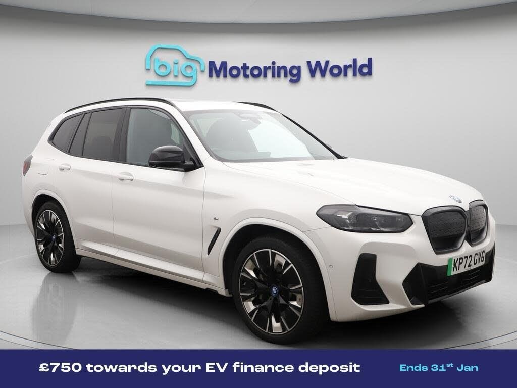 £750 towards your finance depo-Our BMW iX3 is finished in White. Specification includes a range of fantastic features including £750 towards your finance deposit, Panoramic Roof, Sun Protection Pack, Head up Display, 20'' Alloy Wheels, Leather Seats, Apple CarPlay, Adaptive Cruise Control, Electric Seats, Harman Kardon Speakers Specification information is supplied by CAPHPI and may vary to the actual car. This data does not form any part of a buying contact. Please check specification prior to purchase in-store. The MOT is valid until September 2026, visit bigmotoringworld.co.uk for more photos, a 360 tour, service history and a free HPI report.Were BIG on peace of mind and this White BMW iX3 has completed our comprehensive 200 point inspection and passed all checks. Its ready for you to drive away with immediate collection in-store. We include a 90-day warranty as standard plus an option to extend for up to 3 years.Reserve this car exclusively for you, safely and securely at bigmotoringworld.co.uk, with a fully refundable £99 deposit. Test drive before you buy, with no commitment, no hassle and a completely haggle free experience. Still searching and want to see thousands more cars? We are BIG on choice with over 8000 cars to choose from.Visit our award winning web site bigmotoringworld.co.uk.Were Big Motoring World and were BIG on what matters to you.