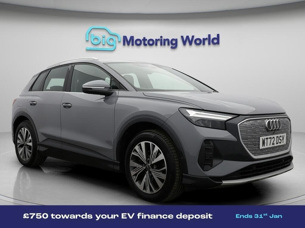 £750 towards your finance depo-Our Audi Q4 e-tron is finished in Grey. Specification includes a range of fantastic features including £750 towards your finance deposit, 19'' Alloy wheels, Apple CarPlay, Lane Assist, Android Auto, Satellite Navigation, Heated Seats, Rear View Camera, Bluetooth, Parking Sensors Specification information is supplied by CAPHPI and may vary to the actual car. This data does not form any part of a buying contact. Please check specification prior to purchase in-store. The MOT is valid until November 2026, visit bigmotoringworld.co.uk for more photos, a 360 tour, service history and a free HPI report.Were BIG on peace of mind and this Grey Audi Q4 e-tron has completed our comprehensive 200 point inspection and passed all checks. Its ready for you to drive away with immediate collection in-store. We include a 90-day warranty as standard plus an option to extend for up to 3 years.Reserve this car exclusively for you, safely and securely at bigmotoringworld.co.uk, with a fully refundable £99 deposit. Test drive before you buy, with no commitment, no hassle and a completely haggle free experience. Still searching and want to see thousands more cars? We are BIG on choice with over 8000 cars to choose from.Visit our award winning web site bigmotoringworld.co.uk.Were Big Motoring World and were BIG on what matters to you.