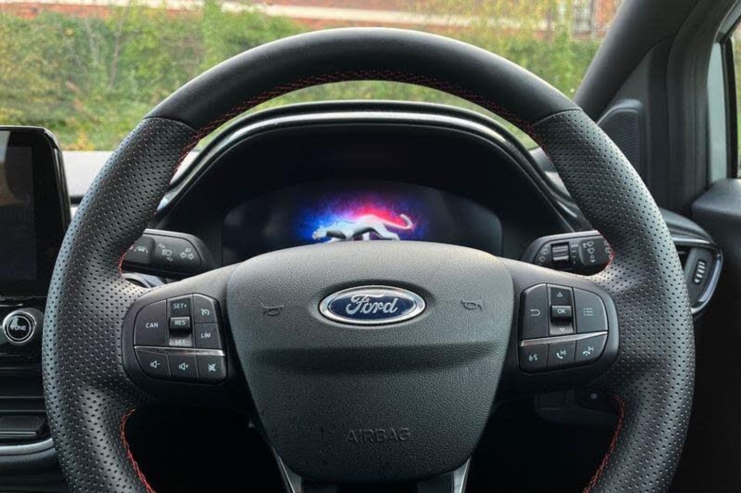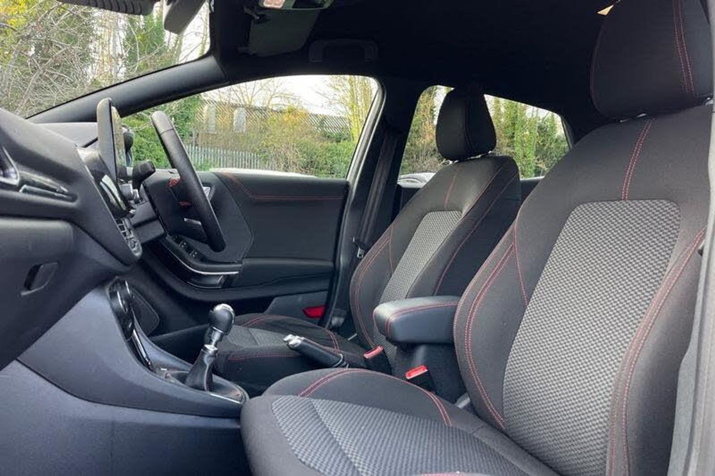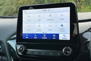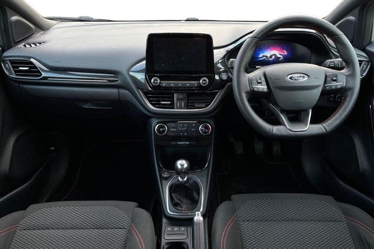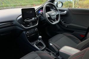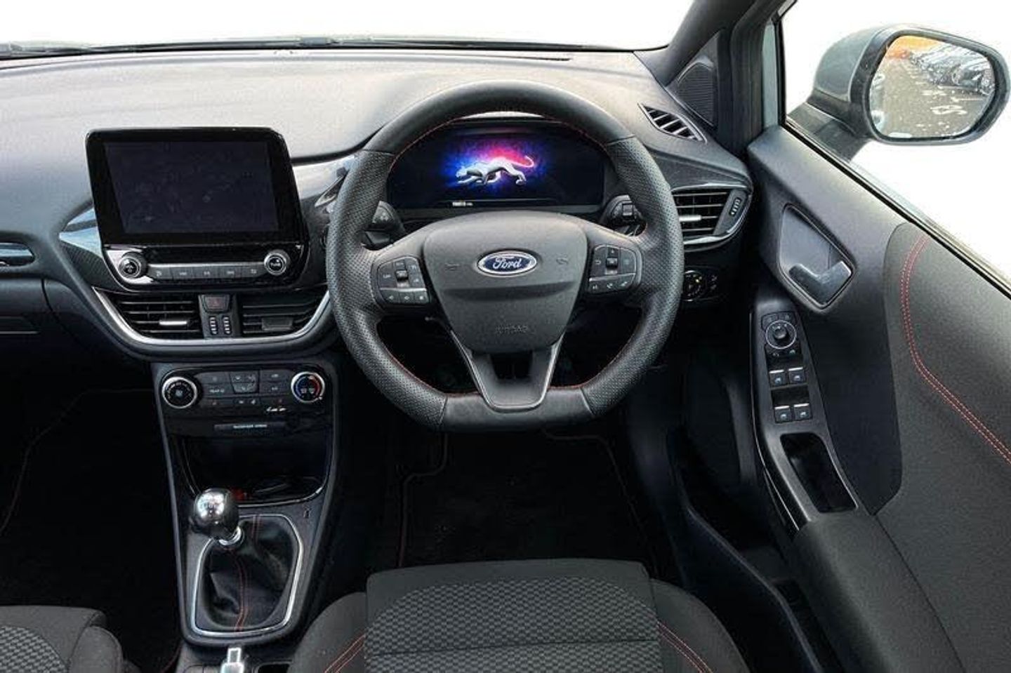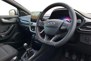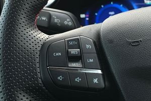 Driver impairment monitor, Emergency call service, Ford easy fuel, Full digital 12.3 instrument cluster, Lane keeping aid with lane departure warning, Power assist steering, Power start button, Rear parking sensor, Selectable drive modes(Normal, sport, Eco, trail, slippery), Speed sign recognition, Automatic headlights with auto high beam, Automatic rain sensing wipers, LED rear lamps, Power foldable heated door mirrors with puddle lamps, Projector headlamps with LED day time running lights and front fog lamps, Quickclear heated windscreen, Rear side wing doors, Rear wiper, ST-Line body styling kit with unique grille, Third brake light, 3 seat bench in 2nd row, Centre console with armrest and stowage, Ford megabox extended bootspace, Front and rear head restraints, Front floor mats, Manual 2 way passenger seat adjustment, Manual 4 way driver seat adjust with lumbar adjustment, Single front passenger seat, ST- Line cloth trim with red stitching, ST-Line flat bottomed sensico leather steering wheel with leather handbrake and aluminium gear knob, 3 rear seatbelts, Child safety lock, Electronic stability control (ESC) and hill start assist, Pedestrian/cyclist detection & post-collision braking, Pre collision assist system, Tyre pressure monitoring system (TPMS)