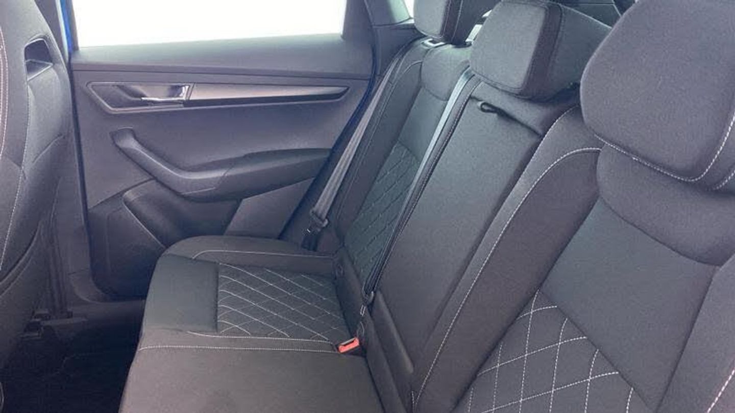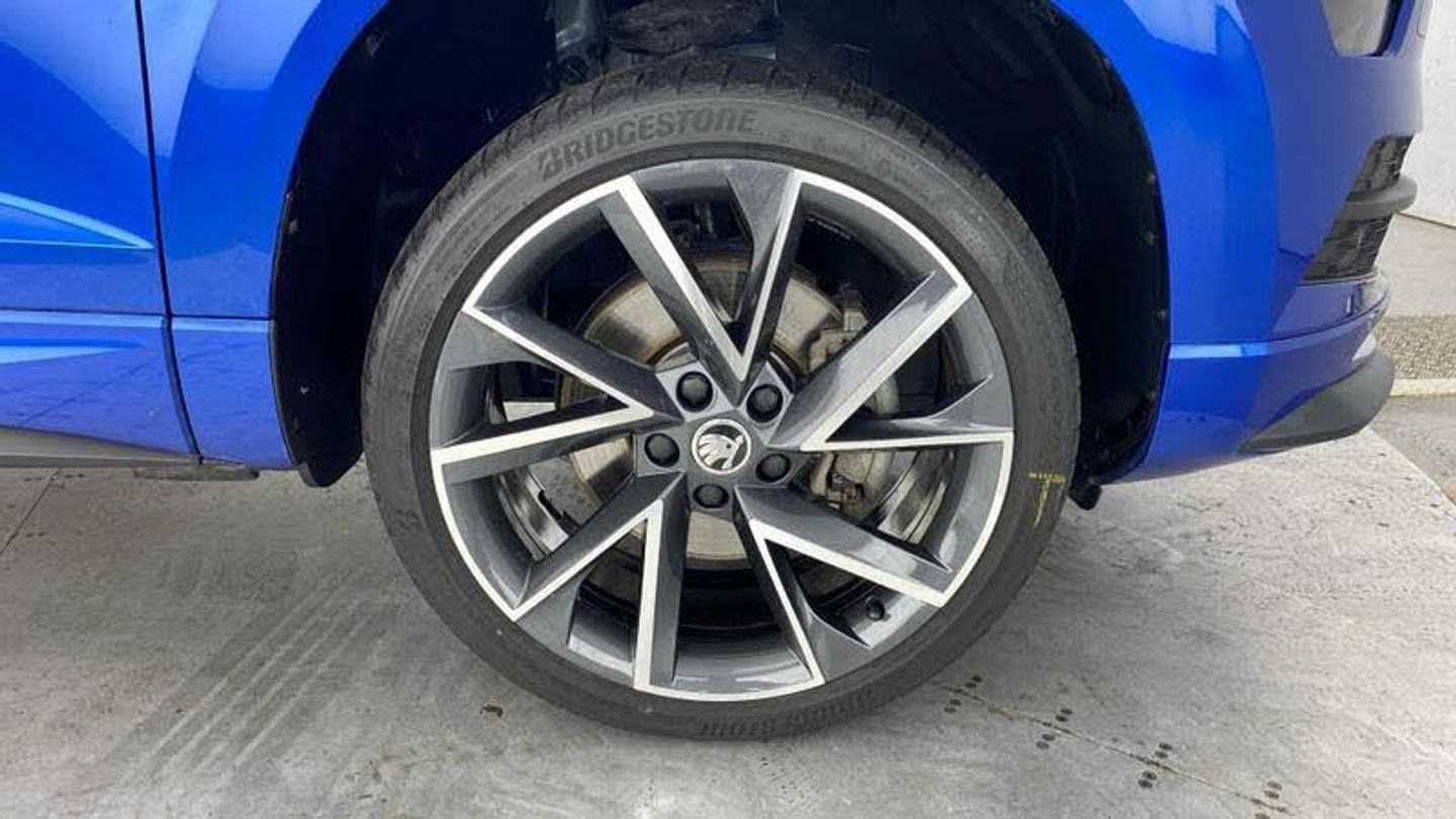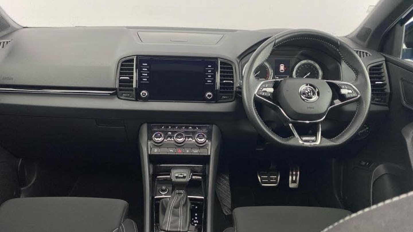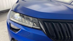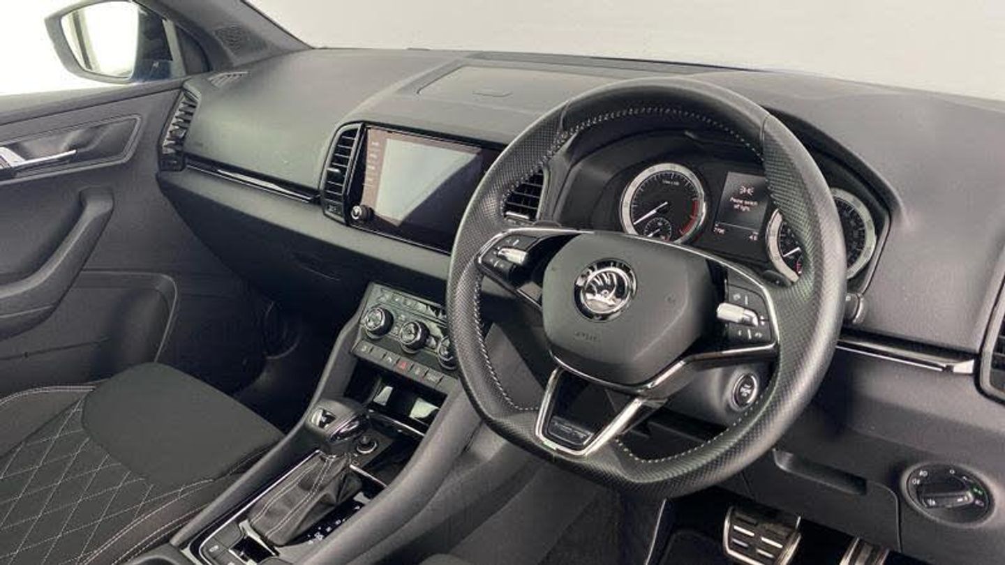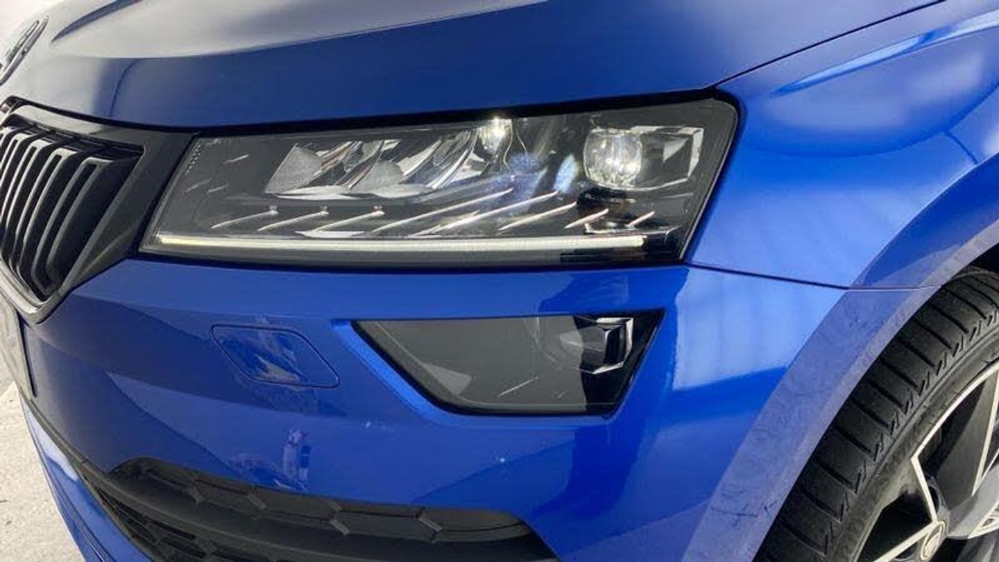Acoustic glass, Aero front windscreen wipers with intermittent function, Black electric window control buttons, Black radiator grille, Black roof rails, Body colour door handles, Body coloured bumpers, Front door steps with SportLine logo, Panoramic sliding sunroof, Sportline decorative inserts with badging, Automatic headlight control system, Full LED headlights + adaptive front light system + LED daytime running lights and front cornering fog lights, Headlight washers, LED rear lights with high functionality, Light assistant (coming/leaving home/tunnel light), ESC including ABS, MSR, ASR, EDS, HBA, DSR, RBS, MKB and traction control, Front assist radar scanning of the space in front of the car with automatic braking, Drive mode selector, Black door mirrors, Airbags - Front side, head, knee and curtain, Automatic door unlocking in case of crash, Automatic fuel cut off in case of crash, Driver airbag, Passenger airbag with switch-off function, Seatbelt reminder signalisation and pretensioner for all seats, Three point seatbelts rear, Tyre pressure monitor, Pollen filter, 1.5 litre bottle holders in driver and front passenger door panels, 12V socket in boot, 12v socket in front centre armrest with storage compartment and rear air vents, 2 Folding hooks and nets in boot, 4 foldable roof handles with rear coat hooks, Chrome inner door handles, Door sill scuff plates, Height/reach adjust steering wheel, Illuminated and cooled glovebox, Net programme in boot, Retractable parcel shelf attachable to tailgate, Solid rear boot cover, Storage box in upper central dashboard closed, Umbrella under passenger seat, 2 Front readings lights for driver and passenger, Cargo elements in boot, Illuminated luggage compartment, Rear reading lights, Sunvisors with illuminated vanity mirrors, Care connect, DAB radio with Bluetooth, USB connection, Start/stop system with regenerative braking, Multifunction colour trip computer, Outside temperature gauge, Service interval indicator, SmartLink wireless for Apple and wired for Android, Black air vent surround, 3 rear height adjustable headrests, Driver and passenger seats height adjust, Front head restraints, Height adjustable front three point seats belts with tensioners, Isofix child seat preparation outer rear, Rear seats fixed folding and divided 60:40, LED Interior lighting pack with Skoda welcome logo - Karoq, Alarm with interior monitoring, back up horn and tilt sensor with safe function, Keyless entry and keyless start with safe system, Remote central locking with 2 remote folding keys, Anti-theft wheel bolts protection, 19 Vega anthracite alloy wheels, [Audio and Communications]Wireless charging without wireless aerial connection, USB C Port x 2 in front centre console, [Drivers Assistance]Tyre pressure display, Driver fatigue sensor, [Exterior]Electric front and rear windows with child proof lock, Heated rear windscreen, Privacy glass, Protective door side sills in body colour, Rear diffuser, Skoda lettering on tailgate in black, Sportline badge on front fender, Sports front and rear bumpers, Welcome animation with sportline logo, [Illumination]Third brake light, [Interior]Safety reflectors on front doors, Textile floor mats, Aluminium pedals, Black roof headlining, Ice scraper, Pen holder, Storage compartment below the passenger seat, Safety vest holder, Manual lumbar support for front seats, Storage on wheel cover, [Safety and Security]Electronic parking brake with auto hold function, Emergency rear braking signal, Hill hold control, Pedestrian monitor, Two tone horn, Electronic engine immobiliser