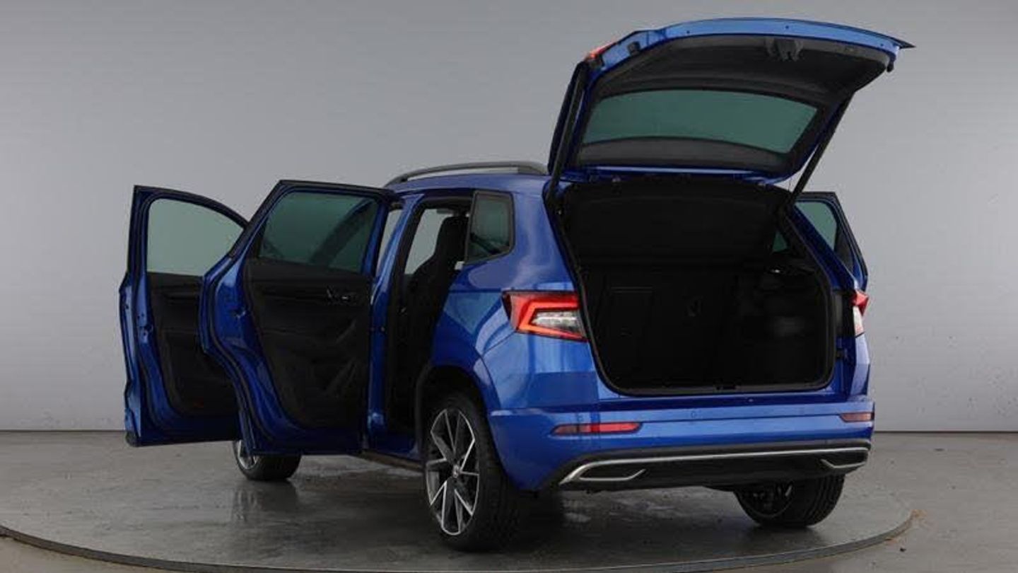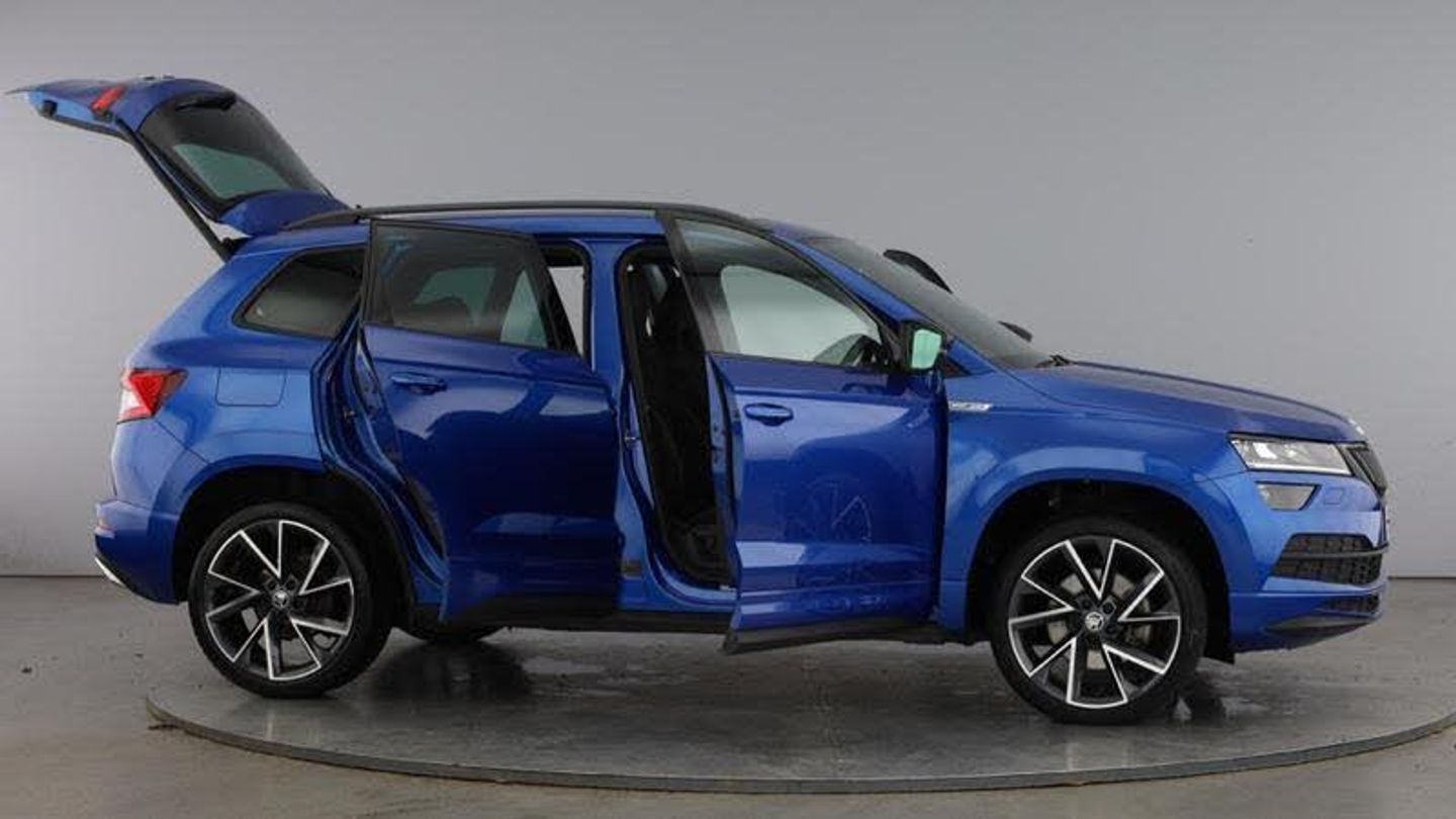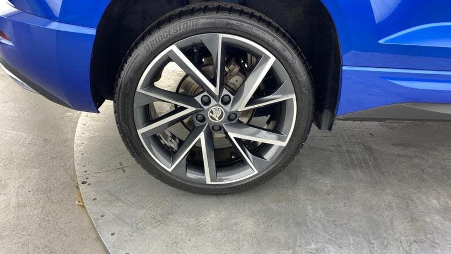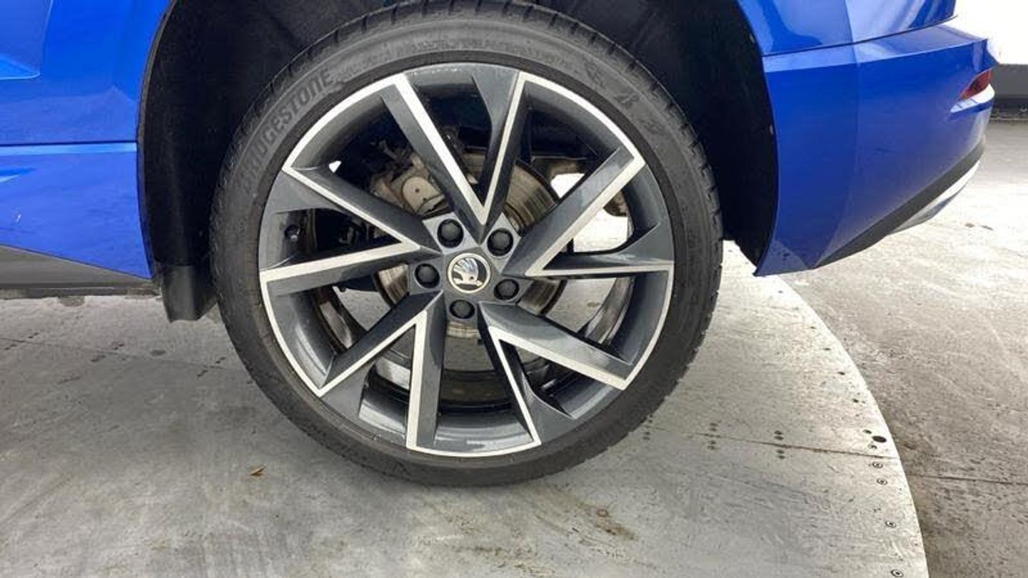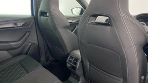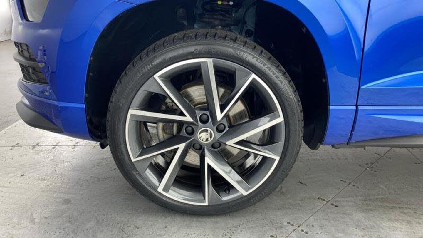 Acoustic glass, Aero front windscreen wipers with intermittent function, Black electric window control buttons, Black radiator grille, Black roof rails, Body colour door handles, Body coloured bumpers, Front door steps with SportLine logo, Panoramic sliding sunroof, Sportline decorative inserts with badging, Automatic headlight control system, Full LED headlights + adaptive front light system + LED daytime running lights and front cornering fog lights, Headlight washers, LED rear lights with high functionality, Light assistant (coming/leaving home/tunnel light), ESC including ABS, MSR, ASR, EDS, HBA, DSR, RBS, MKB and traction control, Front assist radar scanning of the space in front of the car with automatic braking, Drive mode selector, Black door mirrors, Airbags - Front side, head, knee and curtain, Automatic door unlocking in case of crash, Automatic fuel cut off in case of crash, Driver airbag, Passenger airbag with switch-off function, Seatbelt reminder signalisation and pretensioner for all seats, Three point seatbelts rear, Tyre pressure monitor, Pollen filter, 1.5 litre bottle holders in driver and front passenger door panels, 12V socket in boot, 12v socket in front centre armrest with storage compartment and rear air vents, 2 Folding hooks and nets in boot, 4 foldable roof handles with rear coat hooks, Chrome inner door handles, Door sill scuff plates, Height/reach adjust steering wheel, Illuminated and cooled glovebox, Net programme in boot, Retractable parcel shelf attachable to tailgate, Solid rear boot cover, Storage box in upper central dashboard closed, Umbrella under passenger seat, 2 Front readings lights for driver and passenger, Cargo elements in boot, Illuminated luggage compartment, Rear reading lights, Sunvisors with illuminated vanity mirrors, Care connect, DAB radio with Bluetooth, USB connection, Start/stop system with regenerative braking, Multifunction colour trip computer, Outside temperature gauge, Service interval indicator, SmartLink wireless for Apple and wired for Android, Black air vent surround, 3 rear height adjustable headrests, Driver and passenger seats height adjust, Front head restraints, Height adjustable front three point seats belts with tensioners, Isofix child seat preparation outer rear, Rear seats fixed folding and divided 60:40, LED Interior lighting pack with Skoda welcome logo - Karoq, Alarm with interior monitoring, back up horn and tilt sensor with safe function, Keyless entry and keyless start with safe system, Remote central locking with 2 remote folding keys, Anti-theft wheel bolts protection, 19 Vega anthracite alloy wheels, [Audio and Communications]Wireless charging without wireless aerial connection, USB C Port x 2 in front centre console, [Drivers Assistance]Tyre pressure display, Driver fatigue sensor, [Exterior]Electric front and rear windows with child proof lock, Heated rear windscreen, Privacy glass, Protective door side sills in body colour, Rear diffuser, Skoda lettering on tailgate in black, Sportline badge on front fender, Sports front and rear bumpers, Welcome animation with sportline logo, [Illumination]Third brake light, [Interior]Safety reflectors on front doors, Textile floor mats, Aluminium pedals, Black roof headlining, Ice scraper, Pen holder, Storage compartment below the passenger seat, Safety vest holder, Manual lumbar support for front seats, Storage on wheel cover, [Safety and Security]Electronic parking brake with auto hold function, Emergency rear braking signal, Hill hold control, Pedestrian monitor, Two tone horn, Electronic engine immobiliser