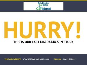 A Beautiful Mazda MX-5 in Arctic Whiter with low mileage andGreat Service History. Satellite Navigation, Bluetooth, Touch Screen, Remote Central Locking, Air Conditioning, Electric Windows & Wing Mirrors.1 Previous Owner. This car is In Superb Condition, Part Exchange Very Welcome EURO 6 ULEZ Compliant****** Bob Davies Car Sales is established as a trusted supplier of quality cars. Family business providing low mileage cars for over 40 years. High standards, great reputation & 5-star customer service. Open Monday-Saturday. Best value in 100 mile radius. ***** Request a personal walk round on any car and we'll make sure you're happy before reserving, travelling or delivery. No pressure, no fuss, no fees. Secure with £100 refundable deposit.***** We deliver all over the UK to your door with our successful "Mouse to House" delivery. Wherever you live, we will bring your perfect car to you. Feel confident in the quality and condition of our vehicles, our warranty covers the UK.****** Best Rate Finance available to all, even for poor credit. No deposit needed just get contact us and we will tailor to suit you. £0 deposit finance available " Easy -Low Rate Finance for all Circumstances - NO ADMIN FEES"