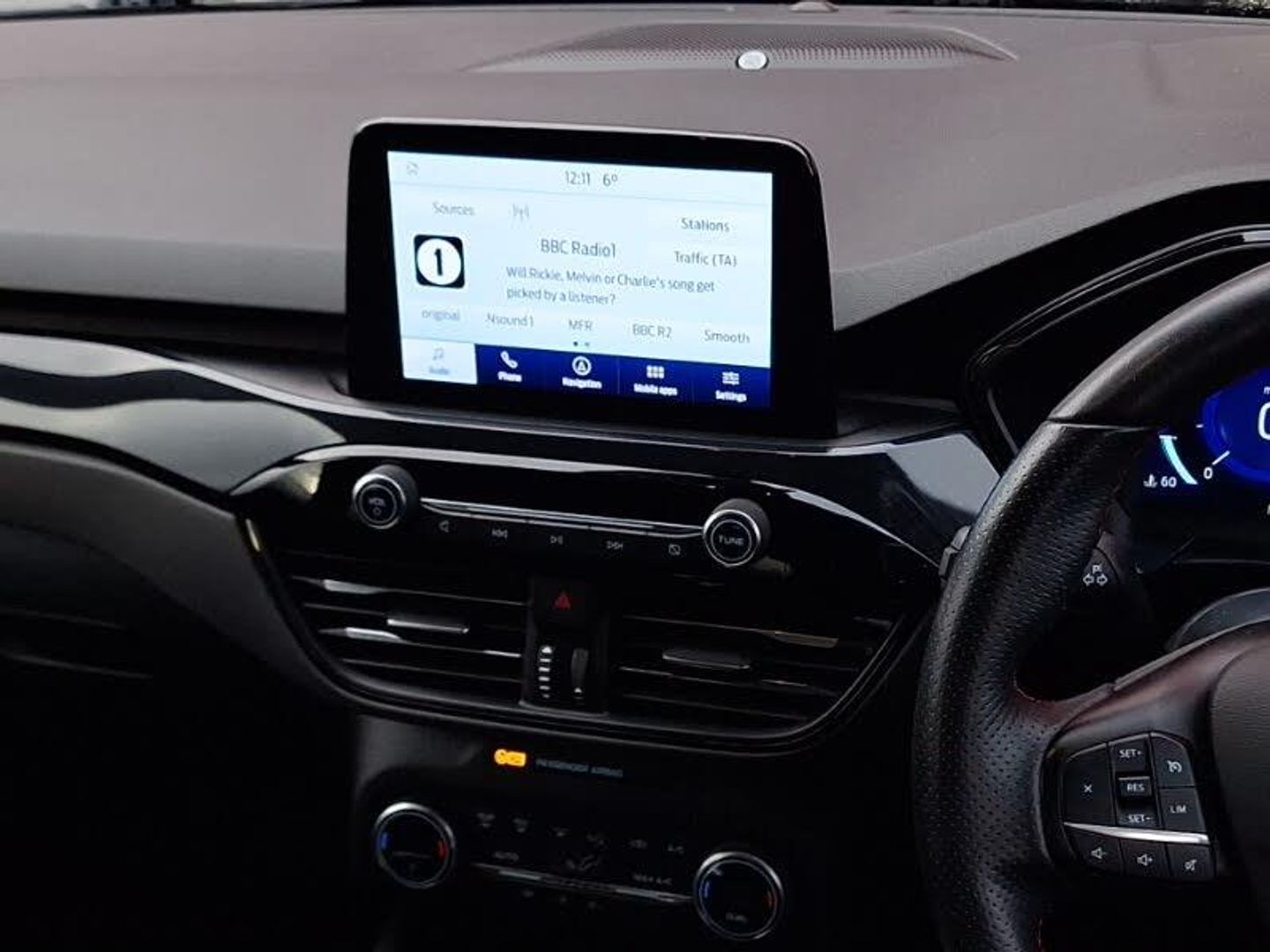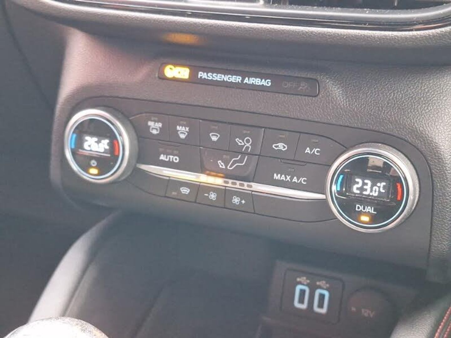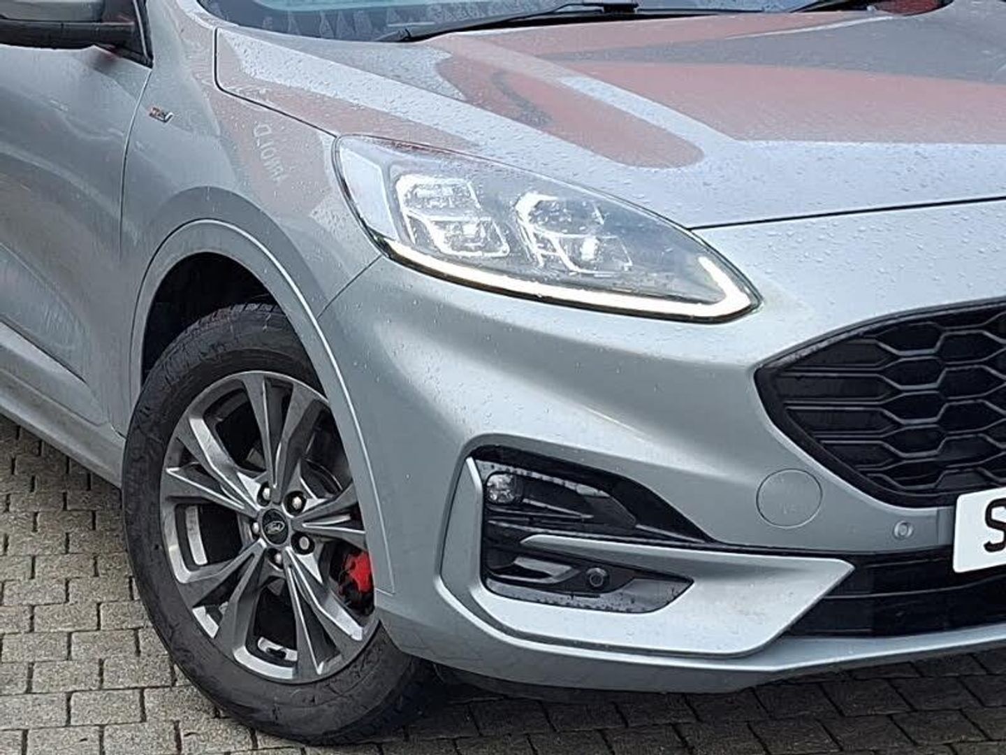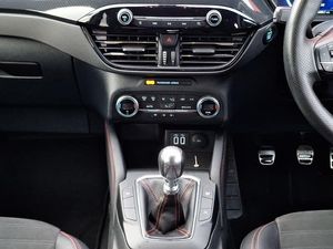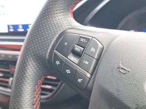 LED daytime running lights, Rear parking sensor, Front and rear parking sensors, Hands free power tailgate, Lane keeping aid with lane departure warning, Mobile phone wireless charging pad, ST Line body styling kit with unique front and rear fascia and bumper, rear painted diffuser, front painted skid plates, dark mesh upper grille, ST Line front scuff plates, Power front/rear windows with global close, LED rear lights, LED daytime running lights, Black roof rails, Rear charging point, Dual electronic automatic temperature control, Keyless start with 'Ford Power' starter button