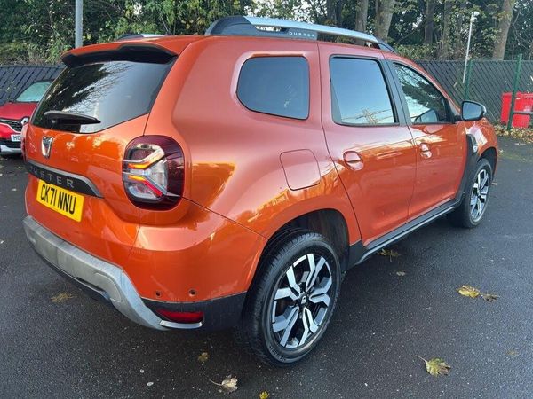 Desert Orange, 17in Alloy Wheels, 3-Point Rear Seatbelts x3, 3-Speed Front Windscreen Wipers, 7-Function On-Board Computer, 8in Media Nav and Smartphone Replication with Navigation, ASR - Traction Control with ESC - Electronic Stability Control, Acoustic Windshield, Air Vents - Satin Chrome, Airbags - Driver, Airbags - Front Passenger with Deactivation Function, Airbags - Front Side, Anti-lock Braking System - ABS and Emergency Brake Assist - EBA, Automatic Air Conditioning, Backlighted Steering Wheel, Blind Spot Warning, Body-Coloured Front and Rear Bumpers, Boot Light, Centre Console Fascia - Matt Black, Centre Console Surround, Child Locks in Rear Doors, Cruise Control and Speed Limiter, DRL - Daytime Running Lights, Dacia Plug and Radio - MP3 - USB - Bluetooth - DAB - Steering Wheel Control, Dark Glass on Lateral Rear Windows, Decorative Insert on Door Panels - Front, Decorative Insert on Door Panels - Rear - Piano Black, Door Handles - Body Coloured, Door Mirrors - Heated and Electrically Adjustable, Door Mirrors - Painted Grey Quartz, Door Open - Visual and Audible Warning, Driver and Passenger Seatbelt Not Fastened - Visual and Audible Warning, Dusk Sensor, ECO Mode, Electric Front Windows with Impulse on Drivers Side, Electric Windows - Rear, Fabric Decorative Insert on Front and Rear Door Panels, Front Door Sill Protection Strip, Front Fog Lights, Front Grille with Hot Stamping, Front Passenger Reading Light, Front Seatbelt Pretensioners, Gear Lever Cap Insert - Satin Chrome, Gear Shift Indicator, Glovebox Light, Headlights - Rear Lights - Front and Rear LED Lights - Y-Shape, Heated Rear Window, Heated Seats, Height and Depth-Adjustable Steering Wheel, Height-Adjustable Drivers Seat, Height-Adjustable Front Seatbelts, Height-Adjustable Front and Rear Headrests, High Centre Console with Driver Armrest, High Level Third Brake Light, Hill Start Assist, ISOFIX Points for Child Seats in Both Outer Rear Seats, Interior Door Handles - Front and Rear - Satin Chrome, Keyless Entry, Lower Steering Wheel Insert - Satin Chrome, Lumbar Seat Adjustment, Map Pockets on Front Seatbacks, Multiview Camera, Power Assisted Steering, Rear Parking Sensors, Rear Passenger Reading Light, Rear Wash and Wiper, Remote Central Locking, Rev Counter, Roof Bars - Longitudinal with Duster Inscription - Grey Quartz, Roof Spoiler - CO2 Efficient, Seats - 60-40 Split Folding Rear, Side Sills - Black, Skid Plates - Underbody Protection, Soft Feel Leather Steering Wheel, Steering Wheel - Chrome Logo Surround, Sunvisor with Vanity Mirror - Passenger, Tailgate Trim with Duster Inscription - Black-Satin Chrome, Thatcham Approved Engine Immobiliser, Tyre Inflation Kit, Tyre Pressure Monitor, Cloth - Black with Grey Stitching, Spare Wheel
