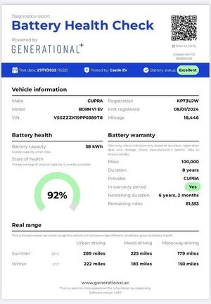 18in Alloy Wheels - Cyclone, 3-Point Seatbelts, 5 Infotainment Speakers, 5.3in Digital Cockpit with 12in Central Display Infotainment System, ABS - Anti-lock Braking System, Aluminium Pedals, Anti-Theft Alarm System - Interior Monitoring - Backup Horn and Towing Protection, Auto Dimming Rear View Mirror, Bluetooth without Wireless Charger, CUPRA Connect - Safety - Service - Remote and Online, CUPRA Emblem on Steering Wheel, Charging Cable - Mode 3 - 16amp, Climatronic Dual-Zone Air Conditioning, DAB and AM/FM Radio, Door Mirrors Electrically Adjustable - Folding and Heated, Driver Alert System - Tiredness Recognition, Driver and Front Passenger Airbags with Front Passenger Airbag Deactivation - Side Airbag in Front with Curtain Airbag and Interaction Airbag, Drivers and Passenger Seats - Manual Height Adjustment, Driving Profile Selection, Dynamic Steering, Electric Auxiliary Air Heater, Electric Window - Front, Emergency Steering Support with Turn Assist, Extended Safety System, Forward Collision Warning with Automatic Braking, Full LED Headlights with Welcome Home Function and Adverse Weather Function, Grey Exterior Mirrors, Heat-insulated Glass and Acoustic Windshield, Heated - Leather-Wrapped - Multifunction Steering Wheel, ISOFIX Points in Outer Rear Seats with Top Tether Anchorage Points, Keyless-Go Central Locking System, LED Rear Lights, Lane Assist, Locking Wheel Bolts with Anti-theft Protection, Multi-Coloured Interior Ambient Lighting, Park Distance Control in Front and Rear, Pilot - M, Recycled Black Interior Roof, Shock Absorption in Front, Sports Rear Shock Absorption, Sunvisor with Illuminated Mirror, Tool Kit, Transport Protection Film, Tyre Pressure Monitoring System, USB Type C x4 - x2 Front and x2 Rear, Unsplit Rear Seat Bench - Split Folding Backrest without Centre Armrest, Visual and Acoustic Seatbelt Reminder, Voice Assistant, Windshield Wiper with Light-Rain Sensor, Wireless Full Link Smartphone Integration, Without Armrests for Front Seats, Without Heat Pump, Without Lumbar Support in Seat Backrests, e-Call Service