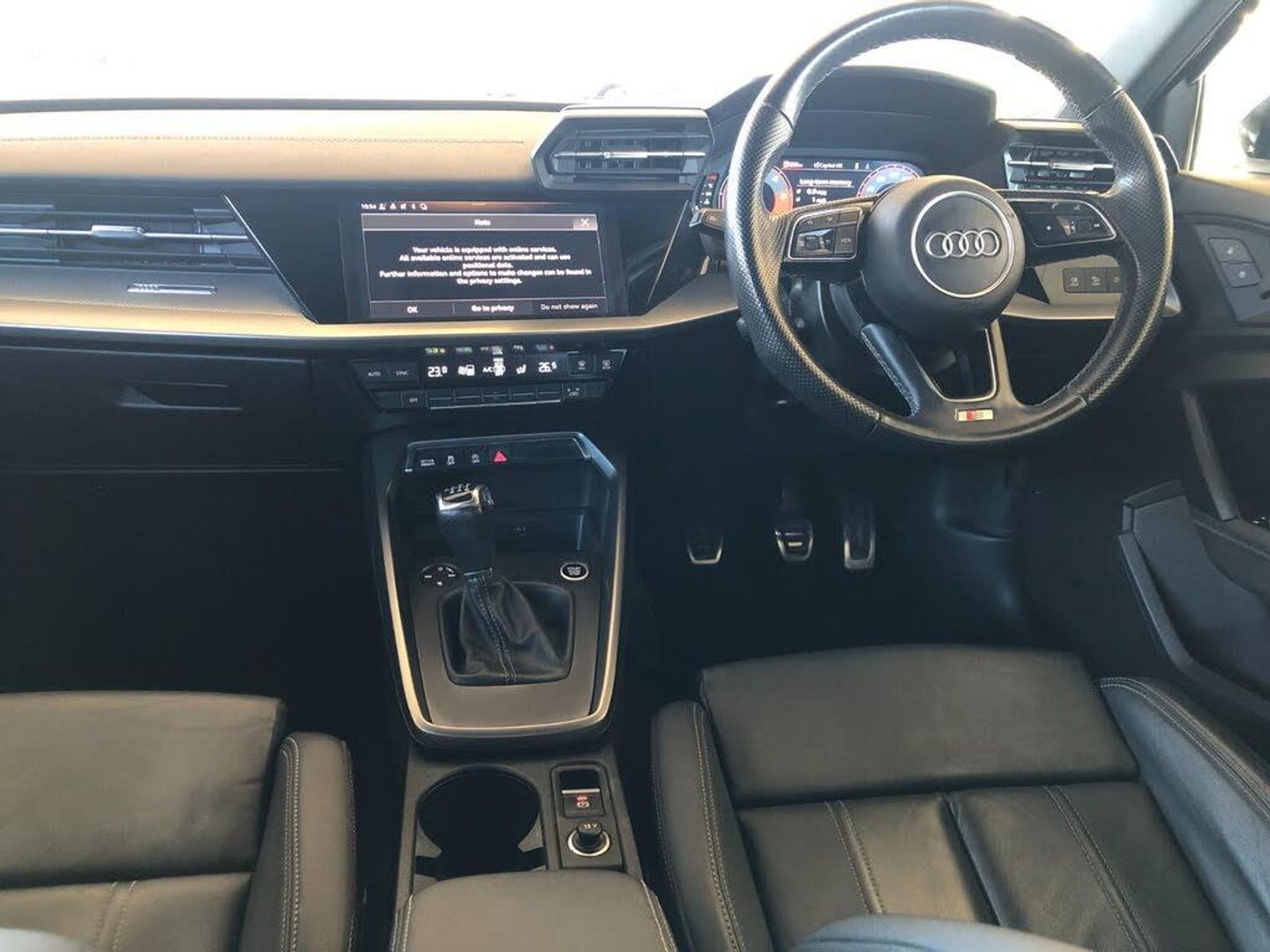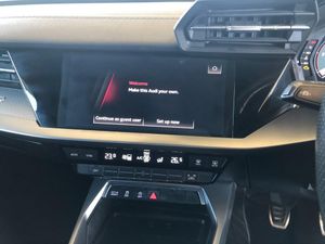 Audi connect emergency call and service, Audi drive select (Auto, Comfort, Dynamic and Individual), Audi smartphone interface, Audi Virtual Cockpit - 10.25" digital and colour instrument cluster, Automatic start/stop system with recuperation, Bluetooth interface, Collision avoidance assistant, Electromechanical power speed sensitive steering, Lane departure warning system, MMI Navigation Plus with high resolution 10.1" colour touch screen display, Service indicator, Trip computer, Voice control system with natural language interaction, 2xUSB-C connection with data and charging functions, 6 passive loudspeakers, DAB Digital radio, 3rd brake light, Acoustic glass windscreen, Aluminium window trim, Auto dimming frameless rear view mirror, Electrically adjustable/heated/folding/auto dimming door mirrors with integrated LED indications + kerb view function for passenger side, Front electric windows, Illuminated aluminium inserts front door sills with S logo, LED daytime running lights, LED headlights with LED rear lights and dynamic rear indicators, Light and rain sensors, Privacy glass - dark tinted rear window, rear door and side windows, Rear electric windows, Rear side air outlets in grained matt black, Rear wiper, S line bumpers, S roof spoiler, 12V socket and storage compartment in front centre console, 40/20/40 split folding rear seat bench with cupholder, Black cloth headlining, Dual zone electronic climate control, Front and rear centre armrest in leather, Front and rear headrests, Front/rear floor mats, Height and reach adjustable steering wheel, Interior lighting - glove compartment light and right hand side, Luggage compartment floor covering, Manual boot compartment lid, Manually adjustable front seats, Seat side bolsters, Stainless steel pedals and front footrest, Twin leather upholstery with front sports seats S embossed logo, Aluminium interior elements pack - A3 Sportback, S line styling pack - A3 Sportback, 3x3 point rear seat belts, Driver and front passenger airbag with passenger airbag deactivation, Electronic Stabilisation Control (ESC) including ABS, ASR and EDL, First aid kit with warning triangle and 2 safety vests, Front side airbags with head airbags and interaction airbag, Hill hold assist, Pre-sense front with pedestrian and cyclist detection, Seatbelt monitoring, Tyre pressure loss indicator, Anti theft alarm, Anti-theft wheel bolts, Electronically operated child lock, Immobiliser, Remote control central locking, Accent surfaces in the dashboard and centre console in platinum grey silk effect paint finish, Dark spectrum aluminium inlays