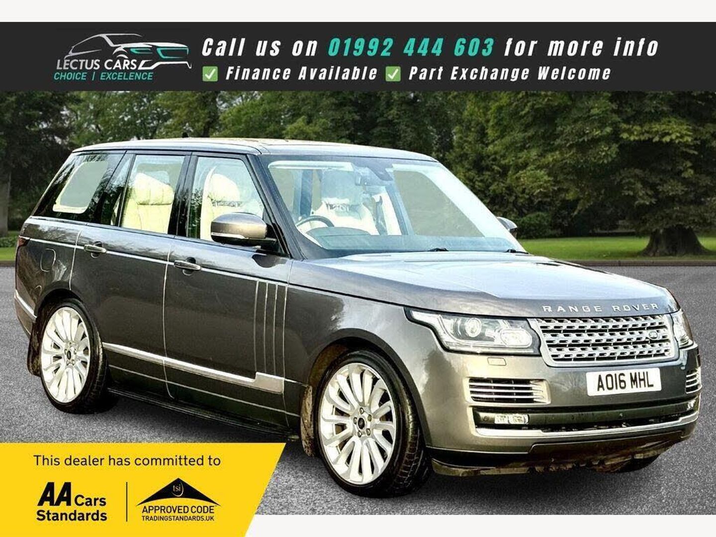 Finished in Tempest grey Metallic with stunning Cream Leather upholstery this 2016 Land Rover Range Rover SD V8 Autobiography is a remarkable example, having had only two owners since new and the last owner has had it since it was 6 months old with a Full service history and it has just been serviced by us in December 2025 and has an MOT until December 2026. It boasts a powerful 4.4L Diesel engine, paired with a Four Wheel Drive system, and meets Euro 6 emissions standards. The Autobiography trim level ensures a luxurious experience, enhanced by features such as front passenger memory seats, a comprehensive surround camera system with five cameras for 360 degree parking assistance, and striking Xenon headlights with LED signature lighting. You also have the benefit of a Tilt & slide panoramic glass roof with electric sun blind. DAB digital radio with TV function. Bluetooth connectivity for phone connection. Cruise control is available on the Multi function Heated steering wheel.This Range Rover is exceptionally capable, with a towing weight of 3500 kg, supported by Towing Assist and front and rear recovery hooks, making it ideal for demanding tasks. The large boot space offers ample room for luggage or equipment. Performance is equally impressive, with an acceleration of 0 to 60 mph in just 6.5 seconds, demonstrating its superior power and responsiveness compared to similar vehicles. Split power tailgate with gesture feature great for loading.See the video in the advert or use this link: https://youtu.be/8-nIuWNGTh4?si=4_csV6vOpKvBIWxB0% Deposit when financing through us.DELIVERY AVAILABLE. The Car Comes With A 6 Month Premium Nationwide Parts And Labour Warranty Finance Available From 10.9 % Apr All Inspections Welcome AA/RAC Px Welcome Viewing By Appointment Only Please Call John On 07785 555111 Or 01992 444603-FSH - JUST SERVICED - PAN ROOF