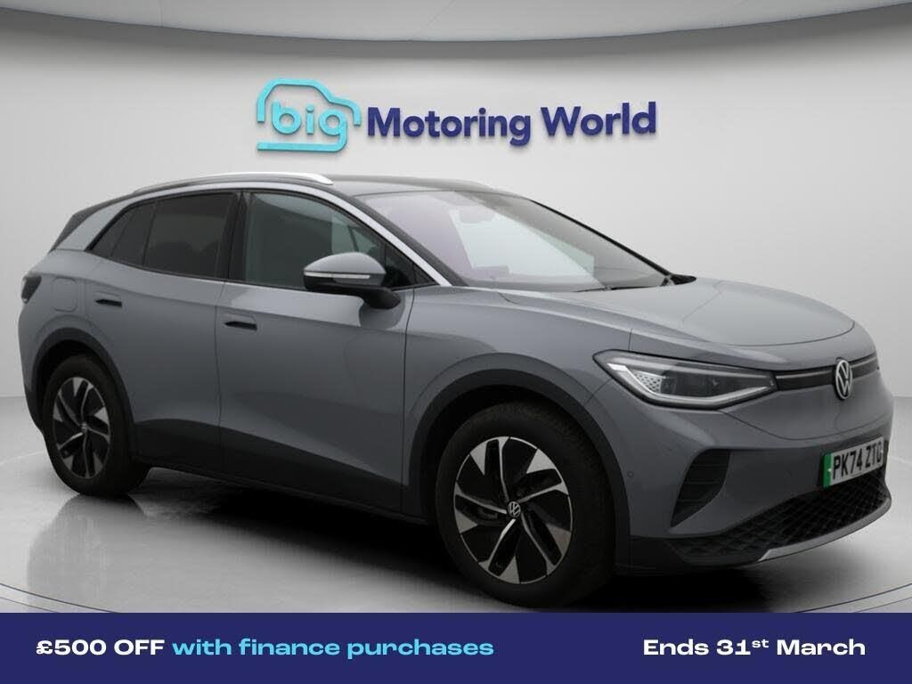 £500 towards your finance depo-Our Volkswagen ID.4 is finished in Grey. Specification includes a range of fantastic features including £500 towards your finance deposit, Part Leather Seats, Apple CarPlay, Adaptive Cruise Control, Android Auto, Satellite Navigation, Privacy Glass, Heated Seats, Gesture Tailgate, Rear View Camera Specification information is supplied by CAPHPI and may vary to the actual car. This data does not form any part of a buying contact. Please check specification prior to purchase in-store. The MOT is valid until October 2027, visit bigmotoringworld.co.uk for more photos, a 360 tour, service history and a free HPI report.Were BIG on peace of mind and this Grey Volkswagen ID.4 has completed our comprehensive 200 point inspection and passed all checks. Its ready for you to drive away with immediate collection in-store. We include a 90-day warranty as standard plus an option to extend for up to 3 years.Reserve this car exclusively for you, safely and securely at bigmotoringworld.co.uk, with a fully refundable £99 deposit. Test drive before you buy, with no commitment, no hassle and a completely haggle free experience. Still searching and want to see thousands more cars? We are BIG on choice with over 8000 cars to choose from.Visit our award winning web site bigmotoringworld.co.uk.Were Big Motoring World and were BIG on what matters to you.