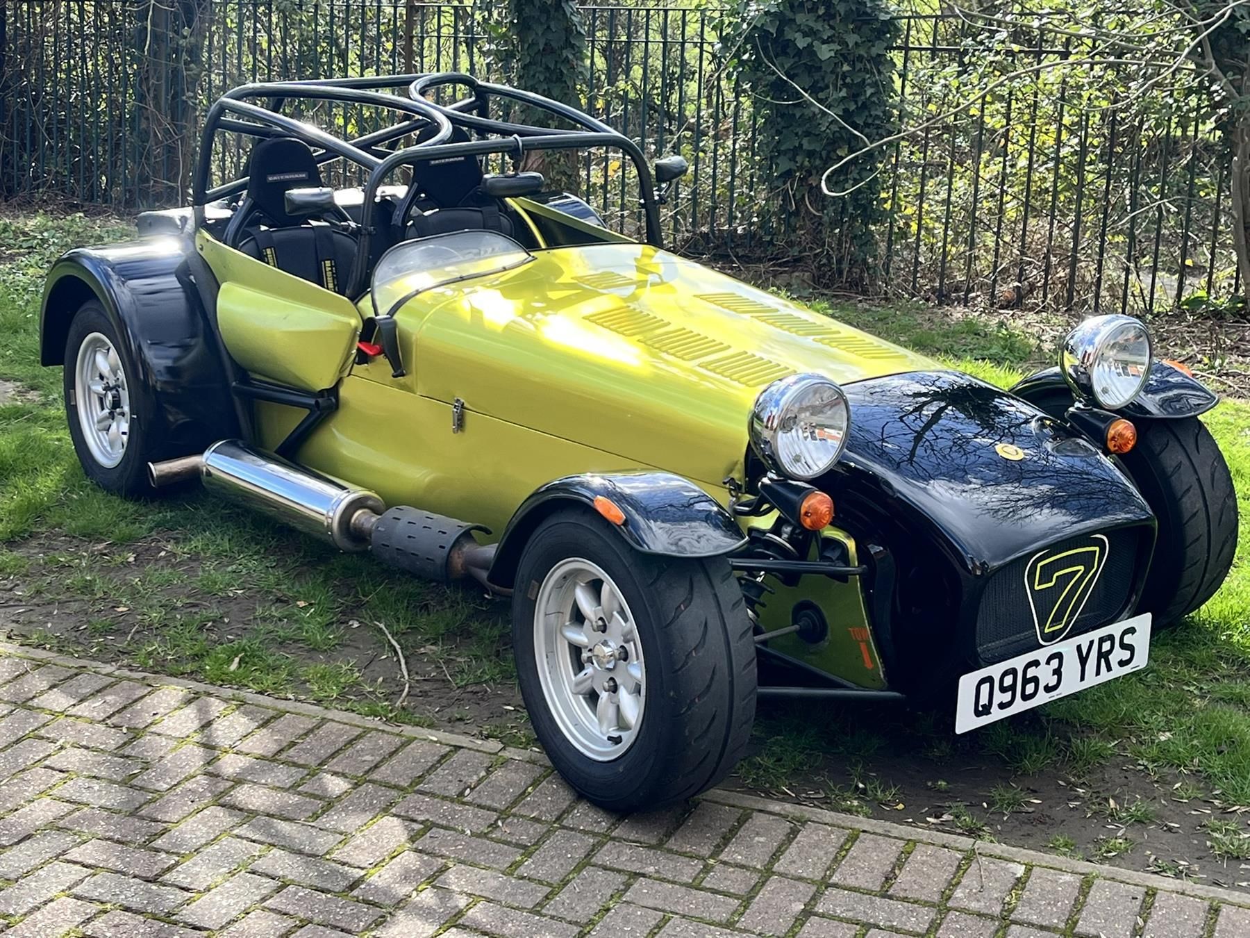 Having recently retired from racing, it’s had a new nosecone, front wings and a fresh wrap. Note that the side and rear skins have some dents but overall looks stunning in the candy yellow/green wrap.