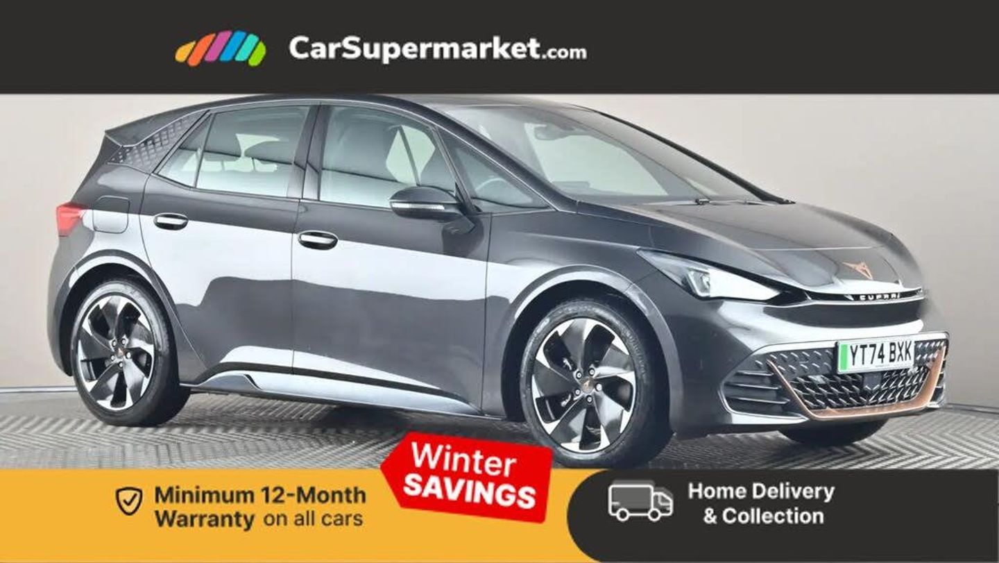 5.3" digital cockpit with 12" central display infotainment system,Driving profile selection - Range, Comfort, Performance, CUPRA Individual,Dynamic steering,e-call service,Emergency steering support with turn assist,Forward collision warning with automatic braking,Lane assist,PAS,Tailgate,Voice assistant,Wireless full link smartphone integration,11 kW Onboard charger,120kW DC charging capacity,Charging cable mode 3, type 2/3 32 A,Shock absorption in front,Sports rear shock absorption,2x USB sockets in front,2x USB sockets in rear, charge only,DAB (Digital Audio Broadcasting) and AM/FM radio,Acoustic windshield,Auto dimming rear view mirror,Daytime running lights,Electric adjustable/heated/folding door mirrors,Full LED headlights,Grey exterior mirrors,Heat insulated glass,LED 3rd brake light,LED rear lights,Rear side wing doors,Rear wiper,Transport protection film,Variable intermittent wiper,Welcome home function and adverse weather function,Windshield wiper with light/rain sensor,3 seat bench in 2nd row,Aluminium pedals,CUPRA emblem on steering wheel,Dual zone climate control,Electric auxiliary air heater,Heated leather wrapped multi function steering wheel with satellite buttons,Integrated front head restraints,ISOFIX points in outer rear seats with top tether anchorage points,Manual height adjustable front seats,Multi-colour ambient interior lighting,Rear headrests,SEAQUAL Yarn cloth upholstery,Single front passenger seat,Sunvisors with illuminated mirror,Unsplit rear seat bench, split folding backrest, without centre armrest,3 point seatbelts on all rear seats,Driver and front passenger airbags with front passenger airbag deactivation, side airbag in front with curtain airbag and front interaction airbag,Extended safety system with proactive passenger protection system,Manual child lock in rear doors,Tiredness recognition system, driver alert system,Tyre pressure monitoring system,Visual and acoustic seat belt reminder,Anti theft alarm system with interior monitoring in cab, backup horn and towing protection,Anti theft wheel bolts,Keyless go central locking system,Tool kit,Tyre repair kit