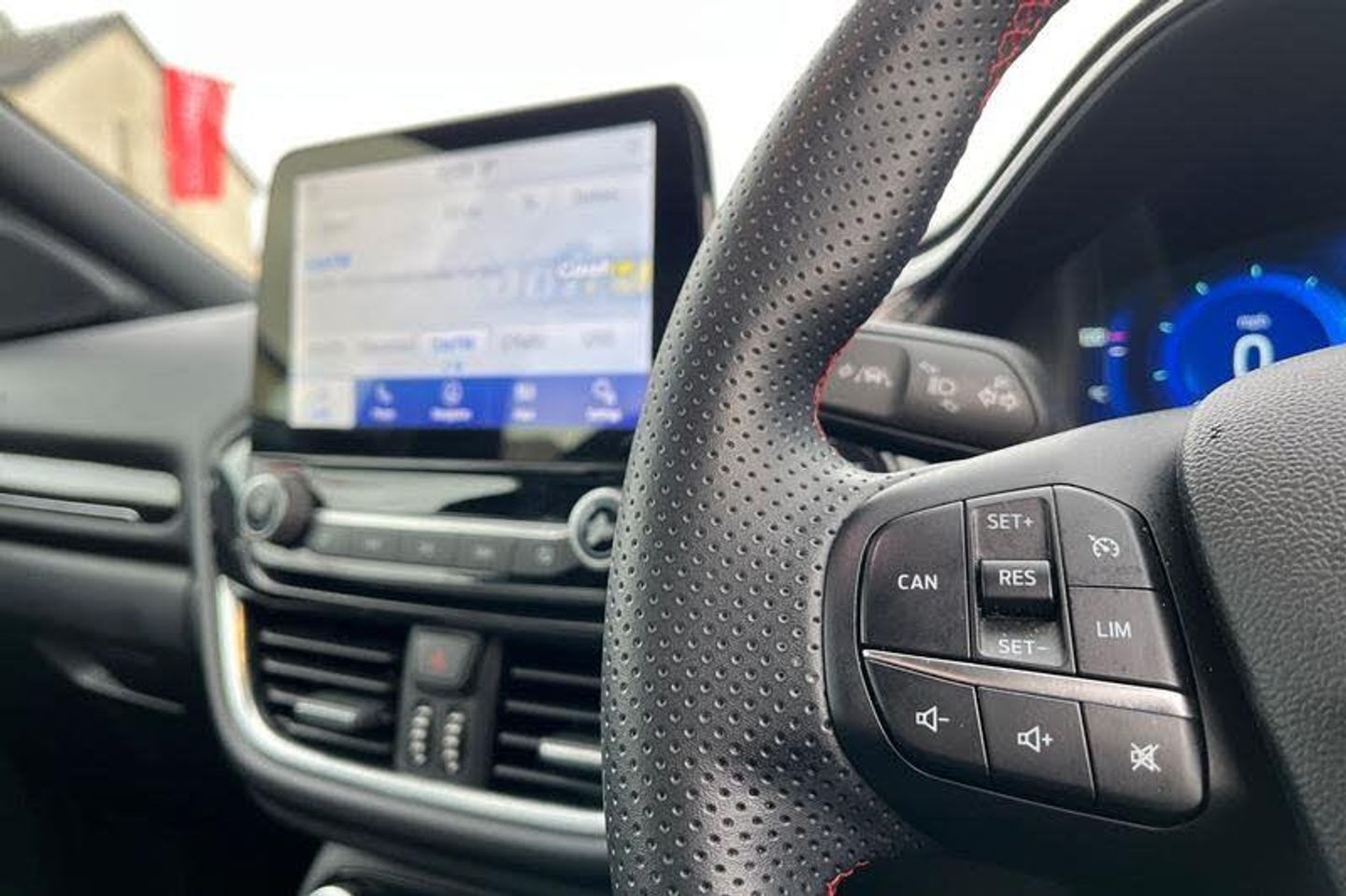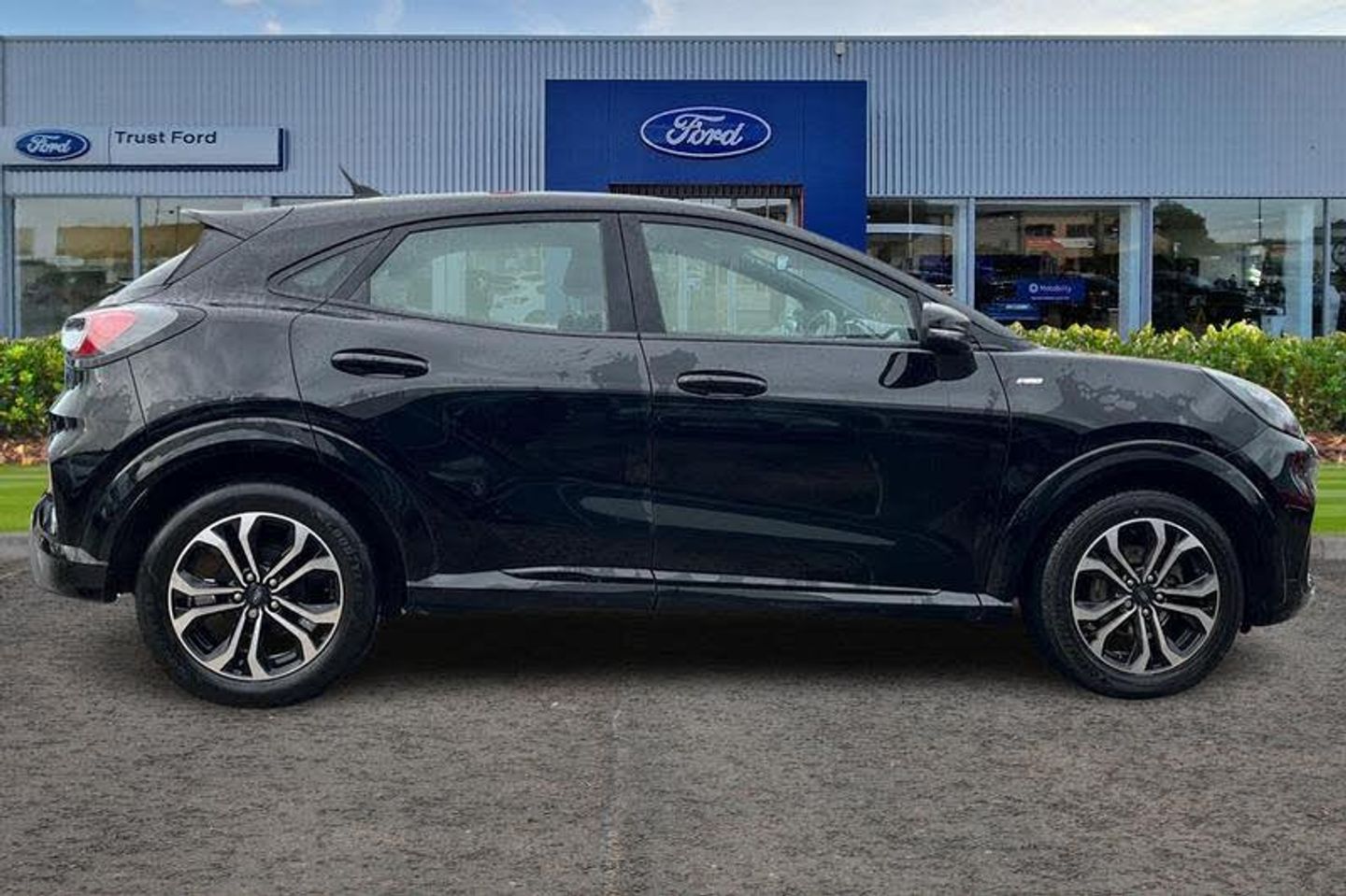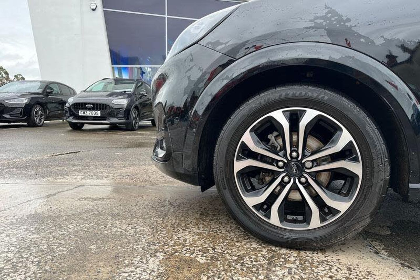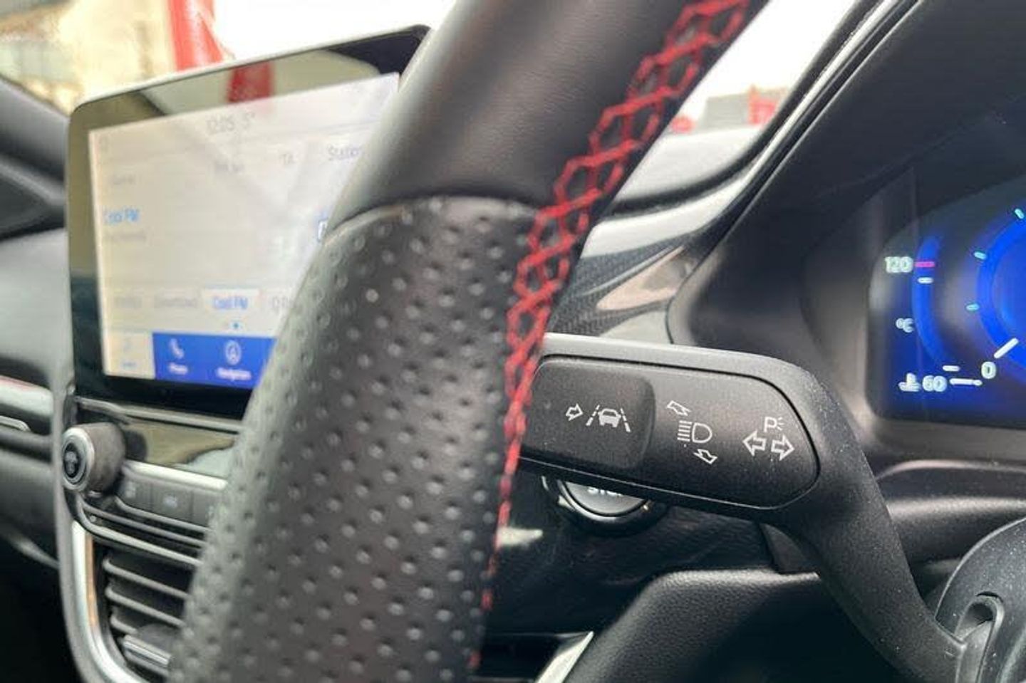 Driver impairment monitor, Emergency call service, Ford easy fuel, Full digital 12.3 instrument cluster, Lane keeping aid with lane departure warning, Power assist steering, Power start button, Rear parking sensor, Selectable drive modes(Normal, Eco, Sport, Slippery and Trail), Speed sign recognition, Automatic headlights with auto high beam, Automatic rain sensing wipers, LED rear lamps, Power foldable heated door mirrors with puddle lamps, Projector headlamps with LED day time running lights and front fog lamps, Quickclear heated windscreen, Rear side wing doors, Rear wiper, ST-Line body styling kit with unique grille, Third brake light, 3 seat bench in 2nd row, Centre console with armrest and stowage, Ford megabox extended bootspace, Front and rear head restraints, Front floor mats, Manual 2 way passenger seat adjustment, Manual 4 way driver seat adjust with lumbar adjustment, Single front passenger seat, ST- Line cloth trim with red stitching, ST-Line flat bottomed sensico leather steering wheel with leather handbrake and aluminium gear knob, 3 rear seatbelts, Child safety lock, Electronic stability control (ESC) and hill start assist, Pedestrian/cyclist detection & post-collision braking, Pre collision assist system, Tyre pressure monitoring system (TPMS)