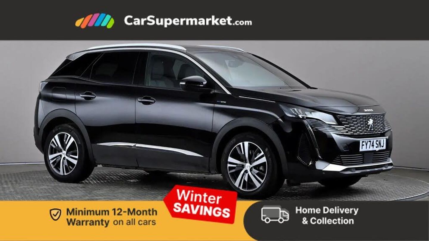 3D connected navigation with 10" HD touchscreen + voice recognition system,Apple car play and Android auto,Bluetooth telephone facility,Drive mode selector (Electric, Hybrid, Sport),Driving Time Warning (DAA1),Emergency services call system,Extended traffic sign recognition,Exterior temperature indicator with ice warning,Front and rear parking sensors,Lane departure warning system,Mirror screen with mirror link, apple carplay and android auto,Multi function trip computer,Peugeot i-cockpit with compact multi-function sports steering wheel,PEUGEOT i-Cockpit with configurable 12.3" Head-up digital instrument panel,PEUGEOT SOS and assistance,Speed limit recognition and recommendation,Deferred charging option, configurable in car or via My PEUGEOT App,Dynamic stability control and electronic anti-skid system,Mode 3 type 2 cable for wallbox charging,6 speakers radio with mp3 compatible,DAB Digital radio,USB socket,Aluminium front door sills,Aluminium longitudinal roof bars,Automatic hazard light activation upon heavy brake application,Automatic triggered rear windscreen wiper in reverse gear,Black diamond roof,Black rubber side window trim,Black with chrome detailed front wing trim,Body colour door handles,Body colour rear roof spoiler with stainless steel edging trim,Body protectors (bottom of front and rear bumpers + wheel arches + protection at bottom of doors) in black,Chrome frameless 'Classic' grille,Chrome rear bumper facia,Dark tinted rear side windows + tailgate window,Diamond Black door mirror shells,Door mirror mounted LED courtesy floor lighting,Eco LED headlights,Electric folding door mirrors with exterior courtesy LED lighting,Electric operated/heated door mirrors,Front and rear door and sill protectors with polished stainless steel insert,Front bumper lower trim in Silver,Front windscreen wiper with magic wash cleaning system,Gloss black B and C pillar and aerodynamic deflector trim,Gloss black front bumper air scoops,Gloss black rear cluster connecting strip,Gloss black windscreen trim,Headlights left on audible warning,Heated rear windscreen with integrated antenna,HYBRID emblem on front wings and tailgate,LED daytime running lights,LED front indicator,LED rear number plate lighting,LED side indicator lights integrated into door mirrors,LED third brake light,One touch electric front/rear windows with pinch protection,Rear LED Peugeot signature 'Claw Effect' lights with clear lens and scrolling LED direction indicators,Rear side wing doors,Stainless steel door sill scuff plates,Stainless steel roof arches,1/3 to 2/3 split folding rear seats,12V Sockets in dashboard, rear cabin and load area,2 cupholders in front centre console,2 cupholders in rear armrest,2 x Rear reading spotlights,2x Rear coat hooks,3x Isofix child seat fittings in the front passenger and outer rear seats,4 Grab handles retractable and damped,Aluminium pedals,Blue ambient lighting for connecting zone,Blue ambient lighting to front door panels,Blue ambient lighting to headup instrument panel,Brumeo fabric trimmed door armrests,Cabin pre-conditioning,Centre front armrest with butterfly wing opening and illuminated storage compartment,Driver seat lumbar adjustment,Driver seat manual adjustment (longitudinal and back rest angle),Dual zone automatic climate control,e-Toggle compact gear selector,Electric power steering with reach and rake adjustable steering column,Fixed boot floor with access to the charging cable storage box,Flocked glovebox interior,Foldable front passenger seat with picnic table,Footwell illumination,Front interior light with 2 reading spotlights and rear interior light with timer,Front passenger seat manual adjustment (longitudinal and back rest angle),Front seat back map pockets,Gear shift indicator,Height adjustable front seats,Illuminated glovebox,Individual left and right controls in boot for seat folding,Leather steering wheel with detail stitch,LED interior lighting in storage spaces and load area,LED roof interior lighting,Rear bench seat with central armrest and ski hatch,Rear centre console ventilation system,Roof lining - Mistral black,Satin chrome dashboard trim,Satin chrome digital instrument panel and touchscreen trim,Satin chrome front door panel recess trim,Satin chrome interior door handles,Satin chrome scorpion's tail and toggle switch trim,Seatbelt not fastened audible and visual alert for front seats,Seatbelt unfastened on the move audible and visual alert for front and rear seats,Sunvisors with illuminated vanity mirrors,Safety Plus Pack - 3008,Visibility pack - 3008,3x Rear three-point retractable seatbelts with force limiters in the outer rear seats,ABS (Anti-lock Braking System) with EBD (Electronic Brakeforce Distribution) and EBA (Emergency Braking Assistance),Acoustic vehicle alerting system,Adaptive driver and front passenger airbags with passenger airbag deactivation function,Driver and front passenger side airbags