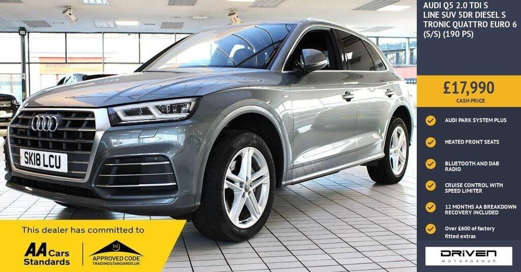 AUDI Q5 2.0 TDI S LINE SUV FINISHED IN SILVER AND COMPLIMENTED WITH ALCANTARA BLACK LEATHER INTERIOR, THIS VEHICLE HAS BEEN VERY WELL CARED FOR AND MAINTAINED WITH DOCUMENTED SERVICE HISTORY PLUS COMPREHENSIVE PRE DELIVERY HEALTH CHECK AND SERVICE COMPLETED PRIOR TO SALE AT 65678 MILES. KEY FEATURES INCLUDE ALLOY WHEELS, VOICE CONTROL SYSTEM, S LINE STYLING, QUATTRO ON DEMAND, PRIVACY GLASS, HEATED FRONT SEATS, GEARSHIFT PADDLES, SD CARD BASED SATALLITE NAVIGATION, USB CHARGING, ALARM, AUDI PARKING SYSTEM PLUS, AUDI SMARTPHONE INTERFACE, AUDI SOUND SYSTEM, BLUETOOTH, MMI COLOUR DISPLAY, CRUISE CONTROL WITH SPEED LIMITER, DAB RADIO, ELECTRIC HEATED DOOR MIRRORS, ELECTRIC BOOT RELEASE, FRONT SPORT S LINE SEATS PLUS MUCH MORE. COMMITTED TO AA CARS STANDARDS: 3 MONTHS OR 3000 MILES WARRANTY INCLUDED WITH AN OPTION TO UPGRADE: 12 MONTHS AA BREAKDOWN RECOVERY INCLUDED: £75.00 CONTRIBUTION TOWARDS YOUR NEXT SERVICE/MOT AT ANY AA CARS STANDARD APPROVED WORKSHOP: WE STAND BY THE QUALITY OF OUR VEHICLES. WITH THE PURCHASE OF THIS VEHICLE, YOU WILL RECEIVE 3 MONTHS OR 3000 WARRANTY, 12 MONTHS AA BREAKDOWN RECOVERY, GIVING YOU ADDITIONAL PEACE OF MIND AND PROTECTION. ALL OUR CARS COME WITH AT LEAST 6 MONTHS MOT AND PRE SALE HEALTH CHECK AND ROAD TEST. OUR PROFESSIONAL TEAM ENSURES YOUR VEHICLE STAYS IN TOP CONDITION, AND YOU ENJOY A HASSLE-FREE OWNERSHIP EXPERIENCE. 4.7 STARS ON GOOGLE WITH OVER 550 REVIEWS: JOIN OUR COMMUNITY OF SATISFIED CUSTOMERS! OUR DEALERSHIP IS PROUD TO HAVE A 4.7 STAR RATING ON GOOGLE, BACKED BY OVER 550 POSITIVE REVIEWS. WE ARE COMMITTED TO PROVIDING EXCELLENT SERVICE AND HIGH-QUALITY VEHICLES. This Vehicle Comes Equipped with High Specification, Which Includes: - Drive this car home with complete confidence and satisfaction: All cars proudly offered by driven group are rigorously inspected, hpi checked and prepared to the highest standard To drive this car home, visit www.drivegroup.co.uk or call 01642-601999 to arrange an appointment with our sales team Please note we do not operate an organised distance selling scheme as defined by the consumer contracts (cancellation, information and additional charges) regulations 2013. Therefore, even if you choose to not view your vehicle at our premises prior to purchase,you will not be entitled to cancel your order under any 14 day cancellation period. All other statutory rights remain unaffected. Whilst every effort has been made to ensure the accuracy of the information contained in this website, please check with us about any item which may affect your decision to purchase. Driven motor group shall not be liable for any errors, inaccuracies or delays in content.