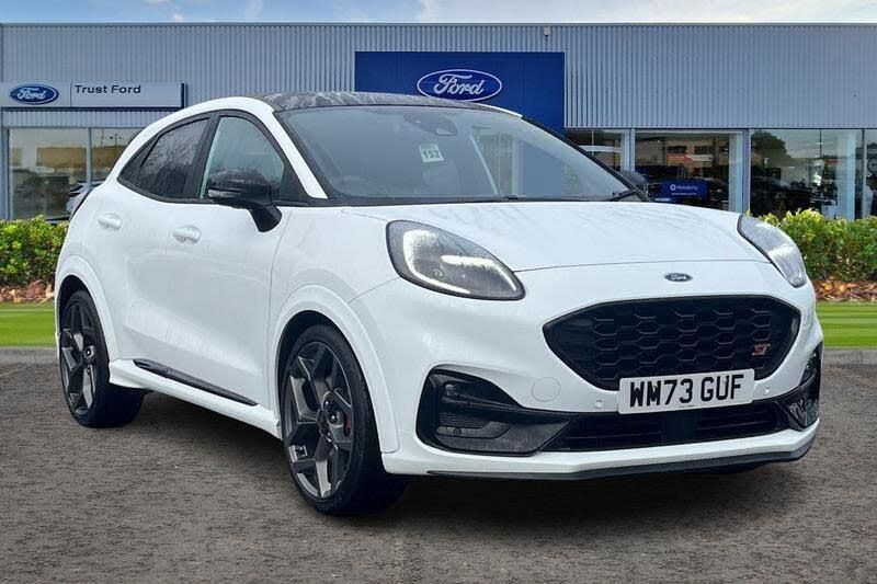 Cruise control with Intelligent speed assist, Driver impairment monitor, Emergency call service, Ford easy fuel, Front and rear parking sensors, Full digital 12.3 instrument cluster, Lane keeping aid with lane departure warning, Power assist steering, Selectable drive modes (normal, sport, eco, track), Speed sign recognition, Automatic headlights with auto high beam, Automatic rain sensing wipers, Dual chrome exhaust, Fixed LED signature headlamps, Front fog lamps, LED daytime running lights, LED rear lamps, Power foldable heated door mirrors with puddle lamps and puma logo protection, Privacy glass to side rear windows and tailgate glass, Quickclear heated windscreen, Rear side wing doors, Rear wiper, ST scuff plates, Third brake light, Unique ST body styling kit including wing mirrors and Ford Performance embossed splitter, 3 seat bench in 2nd row, Alloy sports pedals, Centre console with armrest and stowage, Ford megabox extended bootspace, Ford Performance sensico partial premium leather upholstery with metal grey stitching, Front and rear floor mats, Front and rear head restraints, Manual 6 way driver seat adjust with lumbar adjustment, Manual 6 way passenger seat with lumbar seat adjustment, Single front passenger seat, ST flat bottomed steering wheel with metal grey stitching, ST logo projection, Unique ST gear shift knob, Wireless charging pad with electronic air temperature control (EATC), 3 rear seatbelts, Child safety lock, Electronic stability control (ESC) and hill start assist, Pedestrian/cyclist detection & post-collision braking, Pre collision assist system, Red brake calipers, Tyre pressure monitoring system (TPMS)