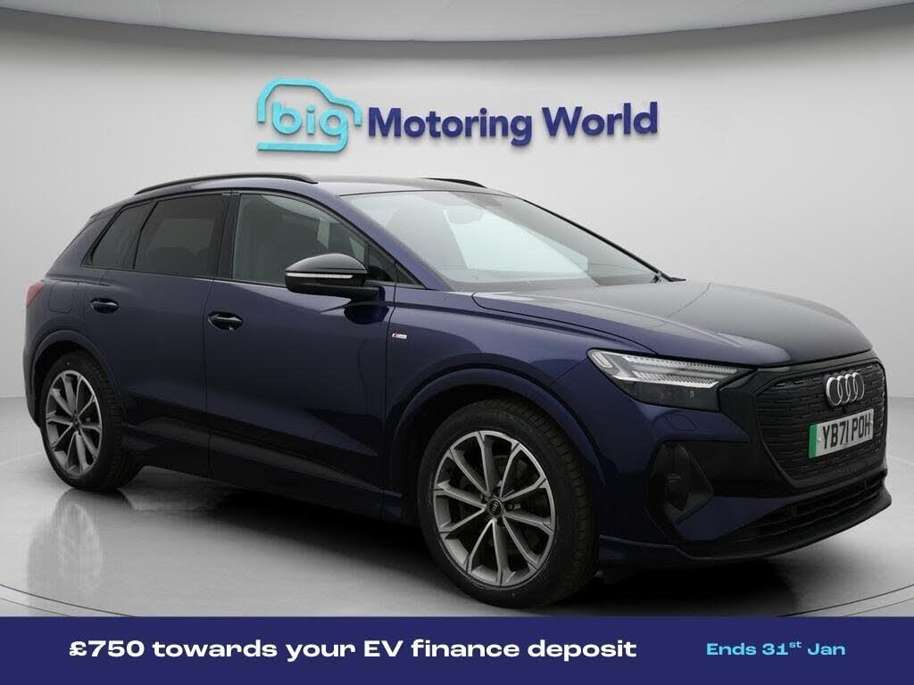 £750 towards your finance depo-Our Audi Q4 e-tron is finished in Blue. Specification includes a range of fantastic features including £750 towards your finance deposit, Leather Seats, Apple CarPlay, Lane Assist, S Line Body Styling, Android Auto, Satellite Navigation, Privacy Glass, Heated Seats, Rear View Camera Specification information is supplied by CAPHPI and may vary to the actual car. This data does not form any part of a buying contact. Please check specification prior to purchase in-store. The MOT is valid until December 2026, visit bigmotoringworld.co.uk for more photos, a 360 tour, service history and a free HPI report.Were BIG on peace of mind and this Blue Audi Q4 e-tron has completed our comprehensive 200 point inspection and passed all checks. Its ready for you to drive away with immediate collection in-store. We include a 90-day warranty as standard plus an option to extend for up to 3 years.Reserve this car exclusively for you, safely and securely at bigmotoringworld.co.uk, with a fully refundable £99 deposit. Test drive before you buy, with no commitment, no hassle and a completely haggle free experience. Still searching and want to see thousands more cars? We are BIG on choice with over 8000 cars to choose from.Visit our award winning web site bigmotoringworld.co.uk.Were Big Motoring World and were BIG on what matters to you.