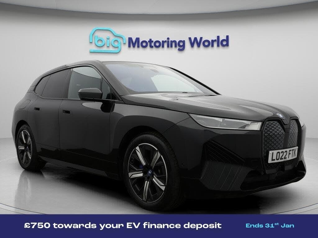 £750 towards your finance depo-Our BMW iX comes with optional extras worth £795. Specification includes a range of fantastic features including £750 towards your finance deposit, All Wheel Drive, Head up Display, Leather Seats, Electric Seats, Harman Kardon Speakers, Connected Package Professional, M Sport Bodykit, Satellite Navigation, Privacy Glass Specification information is supplied by CAPHPI and may vary to the actual car. This data does not form any part of a buying contact. Please check specification prior to purchase in-store. The MOT is valid until August 2026, visit bigmotoringworld.co.uk for more photos, a 360 tour, service history and a free HPI report.Were BIG on peace of mind and this Black BMW iX has completed our comprehensive 200 point inspection and passed all checks. Its ready for you to drive away with immediate collection in-store. We include a 90-day warranty as standard plus an option to extend for up to 3 years.Reserve this car exclusively for you, safely and securely at bigmotoringworld.co.uk, with a fully refundable £99 deposit. Test drive before you buy, with no commitment, no hassle and a completely haggle free experience. Still searching and want to see thousands more cars? We are BIG on choice with over 8000 cars to choose from.Visit our award winning web site bigmotoringworld.co.uk.Were Big Motoring World and were BIG on what matters to you.