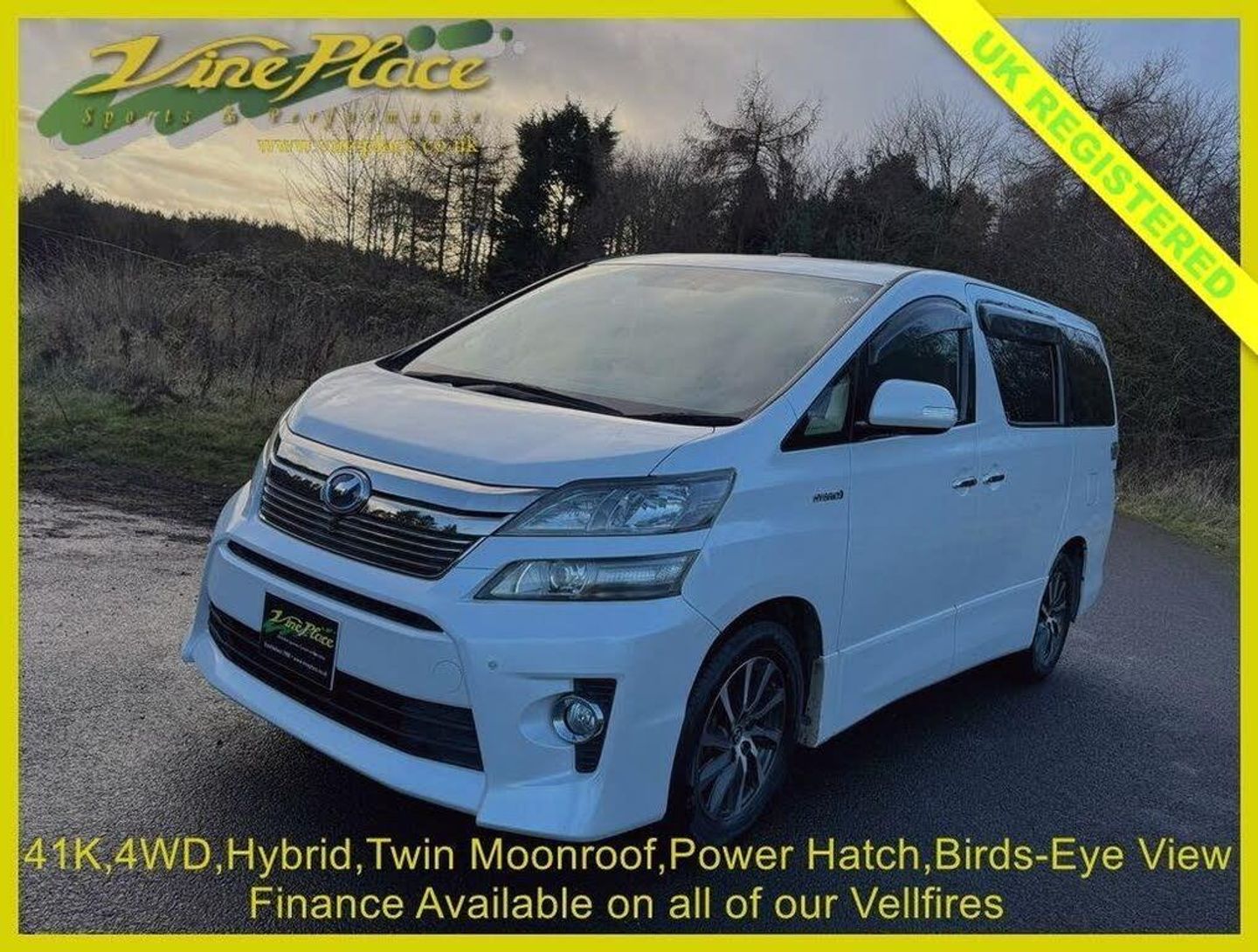 The second-generation Alphard/Vellfire Hybrid was introduced in 2011 and uses a 2.4 petrol engine along with a later more advanced Toyota Hybrid System II with Eco and EV mode. It is 4WD. The vehicle has a class-leading official Japanese fuel consumption of up to 53.6 MPG. Its rare to be able to get a low mileage high spec Vellfire out of Japan, however we've manged it with this one! Only 41K and the car has twin sunroofs, birds eye view monitor, Toyota Premium Sound, AC100V and power doors on both sides. + ULEZ Compliant (London). + Fresh from Japan. + 41K warranted miles with BIMTA/AA mileage certificate. + Grade 4 vehicle (non-accident history in good order). + All factory recalls carried out. + 7 Seats. + Dark grey cloth seats with tailored leather look covers. + Electric powered front seats with drivers' memory. + Leg rest on middle seats. + 4 Wheel Drive. + Twin moonroofs. + Rear drop down monitor. + DVD. + Birds eye view camera system. + Front parking sensors. + Rear parking sensors. + Twin power doors. + Cruise Control. + Factory fitted ISOFIX. + Front and Side Airbags + Keyless entry and starting. + Traction Control. + Retractable mirrors. + XENON Headlamps for superb night-time vision. + Directional headlamps. (AFS). + Fold up rear seats. + Toyota Nano Air Purification System + Picnic table. + Toyota alarm and immobiliser security system. + Toyota Car Theatre System + Privacy glass. + 2 Remote key fobs. + Fog light incorporated into original rear light unit. + Exposed areas of floor and chassis to be undersealed with Body-shutz. + Includes Bluetooth adapter to allow streaming to car audio. + Nationwide delivery £199. (£299 Devon, Cornwall, and South/West Wales) + Supplied with comprehensive service and MOT (inc. advisories). + MPH speedometer available as an optional extra. + This vehicle can be reserved with a deposit of £250, refundable in the unlikely event that when fully prepared you are not entirely satisfied. Explore our extensive selection of Toyota Alphard's and Vellfire vehicle, with 20 or more units available for sale in the UK or en-route! Since 1997, Vine Place has been importing a diverse range of vehicles from Japan. The Toyota Alphard holds a special place in our lineup for its exceptional blend of practicality, aesthetics, comfort, unwavering reliability, and impressive performance. Not only do we offer the Toyota Alphard/Vellfire for sale, but as a leading Toyota Alphard dealer in the UK, we extend our commitment to customer satisfaction by providing top-notch service and repair options for all our Toyota Alphard customers. The Hybrid manages a class leading (up to) 53.6 MPG With around 150 vehicles in total stock we don’t have all cars on site. At any one time we will have cars in Japan, on various ships, in preparation or at one of our 4 storage facilities. We do however have demonstrators at Wingate. However, please call Rachel on 01429 836029 or email to make an appointment. This will ensure both a demonstration vehicle and a member of staff are available at the appointed time. Stock no. 2209