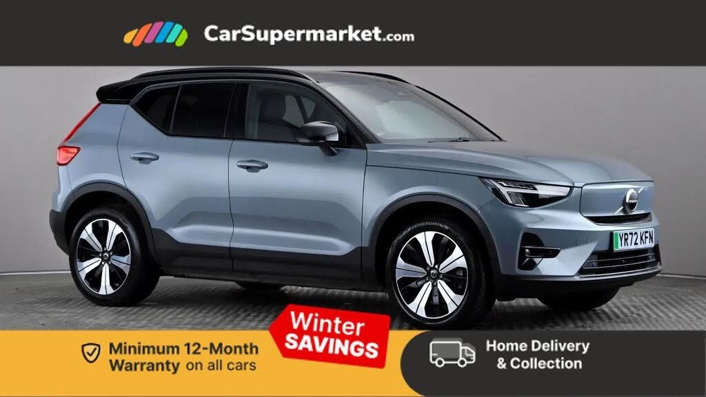 12.3" Progressive Driver Display,9" centre console portrait touch screen,Adjustable steering wheel force,Bluetooth handsfree system,Driver assistance (pilot assist and adaptive cruise control),Driver awareness - Blind spot information system with steer assist, cross traffic alert with autobrake and rear collision warning and mitigation,Emergency services call system,Front park assist,Google automatic services - Nav with google maps, apple carplay/android auto, voice recognition with google assistant,Hands free power tailgate,Lane keep assist with driver alert control,Oncoming Lane Mitigation,Rear park assist,Rear park assist camera,Speed limiter,Speed sensitive steering,Volvo cars services with app,Volvo on call with charge station locations and route planning and pre climatisation,Wireless Smartphone Integration includes Apple CarPlay and Android auto,Wireless/Inductive Mobile Phone Charging,11 kW AC onboard charger,4.5m Type 2/mode 3 charge cable,7m 10amp charging cable with 3 pin plug and 4.5m 3 phase 32 amp type 2 / mode 3 charge cable,Charging port located in nearside rear wing,Electric front axle drive,Lithium-ion battery,Recharging port located in nearside rear wing,Touring chassis,DAB Digital radio,High performance sound, 8 speakers/250W, front USB and 2 rear type C USB,Low speed exterior sound speaker,Steering wheel remote infotainment controls,Adaptive brake lights with high level LED brake lights,Auto dimming exterior rear view mirror,Auto dimming interior mirror,Automatic headlamp levelling,Automatic LED Headlights + Active high beam incorporating daytime running lights,Colour co-ordinated front grille and surround,Dark tinted windows for rear door side windows and cargo compartment,Electric adjustable/heated/auto folding door mirrors,Front and rear electric windows,Front recharge tread plates,High gloss black front and rear skid plate,High gloss black lower front bumper,High gloss black window trim,Home safe and approach lighting,Integrated roof rails in high gloss black,LED front fog lamps,Puddle lights,Rain sensor with automatic windscreen wiper activation,Rear side wing doors,Rear wiper,Recharge embossed rear side roof pillar,Roof antenna,Visible VIN plate,12V socket in front tunnel console and luggage compartment,2 zone electronic climate control and rear air vent with clean zone air quality system and pollen filter,3 bench rear seats in 2nd row,3 spoke sports tailored steering wheel,60/40 versatile split folding rear seat,A-pillar parking ticket holder,Centre console cupholders and storage,Charcoal headlining,Flexible load floor and grocery bag holder,Front footwell illumination,Front headrests,Front load compartment (31 litres),Front reading light and theatre lighting,Front seat cushion extensions,Front tunnel net pocket and integrated waste bin,Glovebox bag hook,Heat pump (Enhanced cabin heating and cooling efficiency with optimal vehicle range),Height/reach adjustable steering column,High gloss black centre tunnel and centre screen surround deco,Illuminated glovebox,Illuminated luggage compartment,Illuminated vanity mirrors + ticket holder,Load protection net,Multi directional lumbar support,Power driver seat with memory + exterior mirrors memory,Power passenger seat,Rear armrest with cupholder,Rear coat hook,Rear headrests,Single front passenger seat,Underfloor cargo storage,Climate pack - C40/XC40,3x3 point rear seatbelts,City safety includes pedestrain and cyclist detection, front collision warning with full and rear auto brake,Drivers knee airbag,Dual stage driver/passenger airbags,Electronic parking brake with auto hold,First aid kit,Front and outer rear seatbelt reminder and pretensioners,Front seats SIPS airbags,Hill descent control,Hill start assist,Inflatable curtain,ISOFIX attachment (Front passenger and Rear outer seats),Passenger airbag cut-off device,Power child locks on rear doors,Road sign information display,Run off Road Mitigation,Run off Road Protection,SIPS (Side Impact Protection System),Slippery road and hazard light alert,Stability and traction control includes spin control and corner traction control,Tyre pressure monitoring system,Vehicle deceleration control with Anti-lock Brake System, Electronic Brake Distribution and Emergency Brake Assist,Warning triangle,WHIPS whiplash protection system - front,Anti-theft alarm including immobiliser/volume sensor + level sensor,Care key with user defined top speed,Convenient entry and start,Key integrated remote control central locking + fuel flap with deadlocking system and auto open/close power windows,Keyless drive plus handsfree tailgate opening/closing,Locking wheel nuts,Private locking for tailgate,Origin inlay,Tyre sealant kit + 12v compressor,Thunder Grey