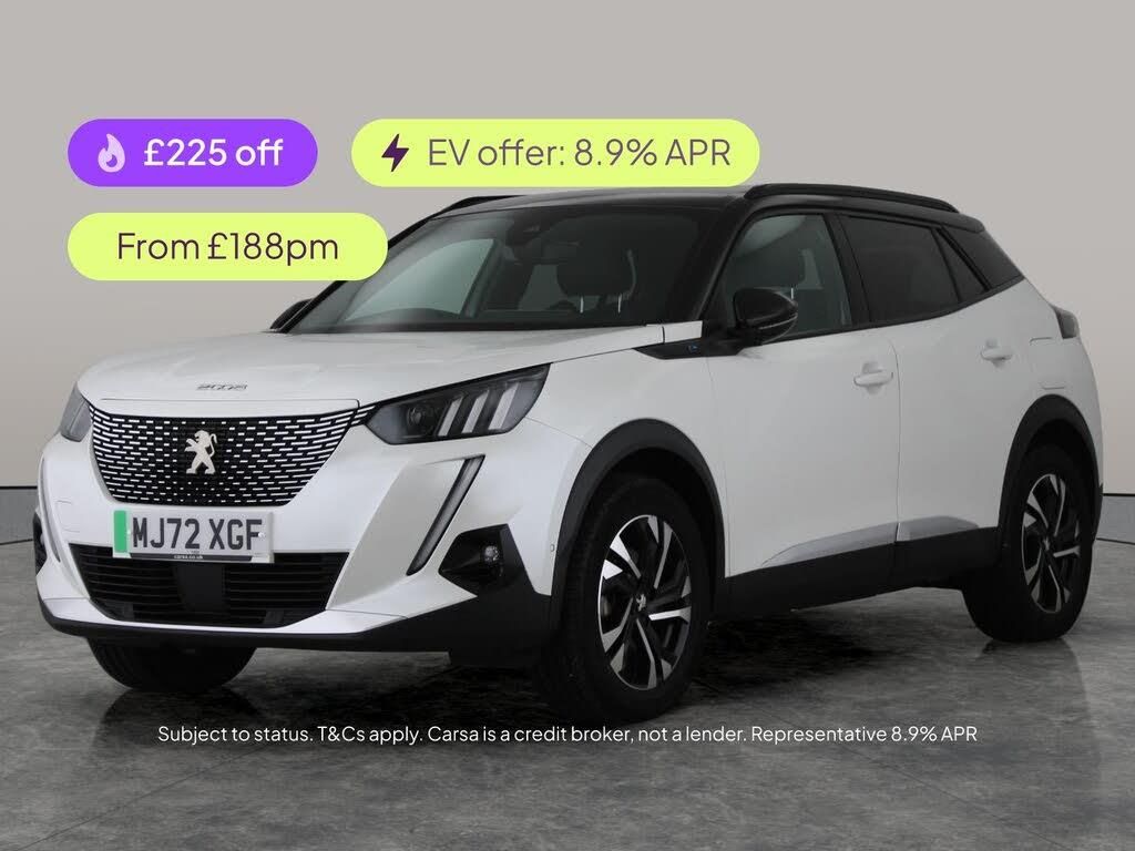 Discover the sleek white Peugeot E-2008 Electric SUV, blending style with advanced tech. Enjoy a futuristic drive with a Head-Up Display, wireless phone charging, and Apple CarPlay for seamless connectivity. Stay safe and confident thanks to active lane assist, lane departure warning, traffic sign recognition, and a reversing camera. LED headlights shine ahead, while cruise control and satellite navigation make every journey a breeze. Experience modern motoring with outstanding comfort and innovation. 1 service recorded, last serviced on 10/12/2025 at 23,162 miles. MOT to 29/09/2026. Visit our website for service history, online valuation, full vehicle specification plus multiple images. This vehicle is VAT qualifying. Any feature/option specified here is from 3rd party data. We cannot guarantee the accuracy of any specification supplied by a 3rd party. We recommend that you physically check the specification of the vehicle on site prior to purchase. This information does not form part of the buying contract. Terms & Conditions apply. We have over 2,000 cars available from our 10 national branches, check our website to see all our stock. Our Trustpilot rating is 4.4/5 with over 9,000 reviews.