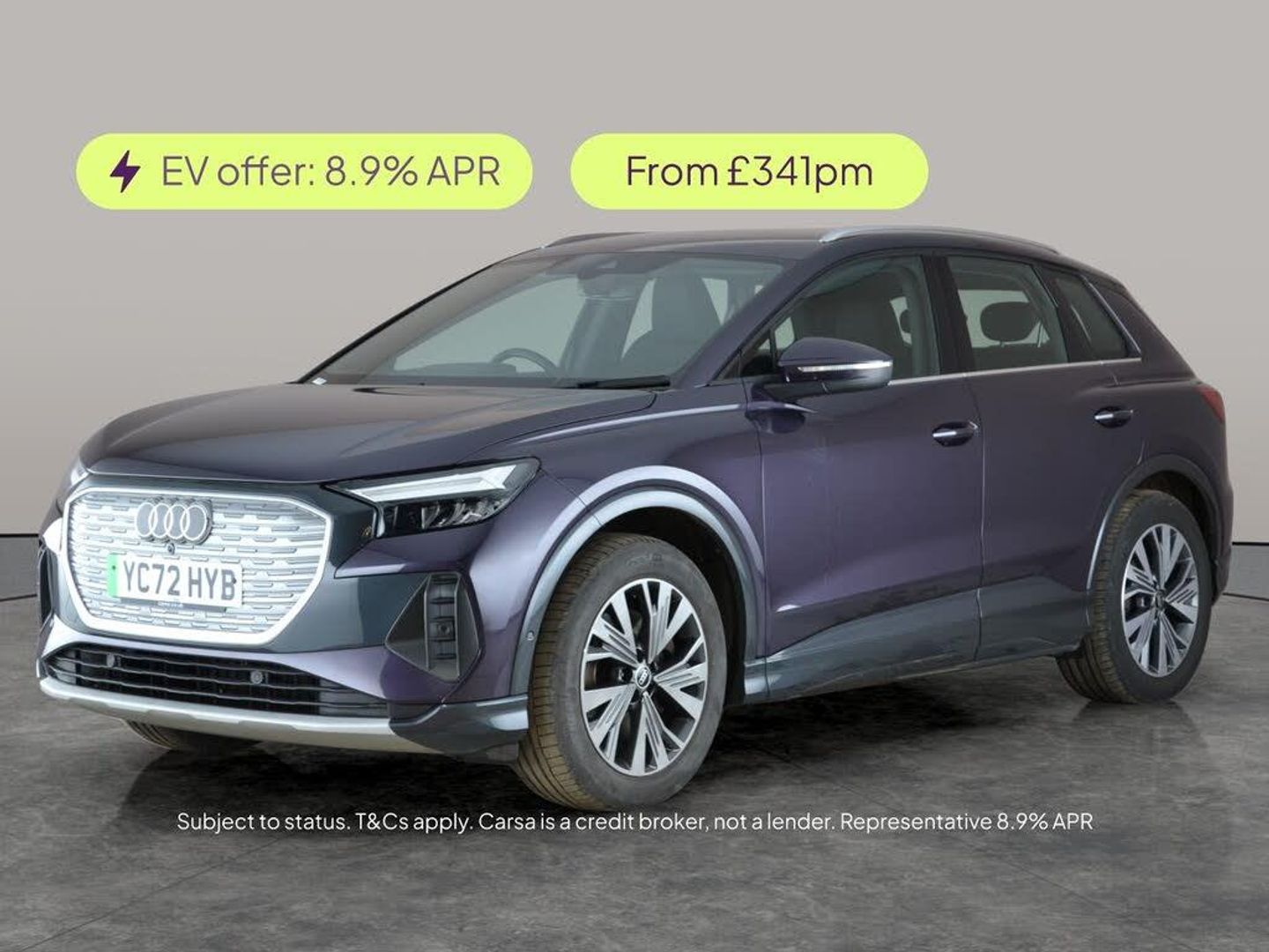 Experience the Audi Q4 E-tron Sport, an electric SUV in stunning purple. Enjoy premium touches like MMI Navigation Plus, Apple CarPlay, and an upgraded sound system. LED headlights light your way, while heated seats and a reversing camera add comfort and convenience. Stay connected with Bluetooth audio streaming and drive relaxed with lane departure warning and cruise control. Including driving modes and traffic sign recognition, this Q4 E-tron is perfect for those who want innovation and style in every journey. 2 services recorded, last serviced on 11/06/2025 at 30,036 miles. MOT to 24/10/2026. Visit our website for service history, online valuation, full vehicle specification plus multiple images. Certain features listed may be available via subscription packages at extra costs, please consult with Audi for details. This vehicle is VAT qualifying. Any feature/option specified here is from 3rd party data. We cannot guarantee the accuracy of any specification supplied by a 3rd party. We recommend that you physically check the specification of the vehicle on site prior to purchase. This information does not form part of the buying contract. Terms & Conditions apply. We have over 2,000 cars available from our 10 national branches, check our website to see all our stock. Our Trustpilot rating is 4.4/5 with over 9,000 reviews.