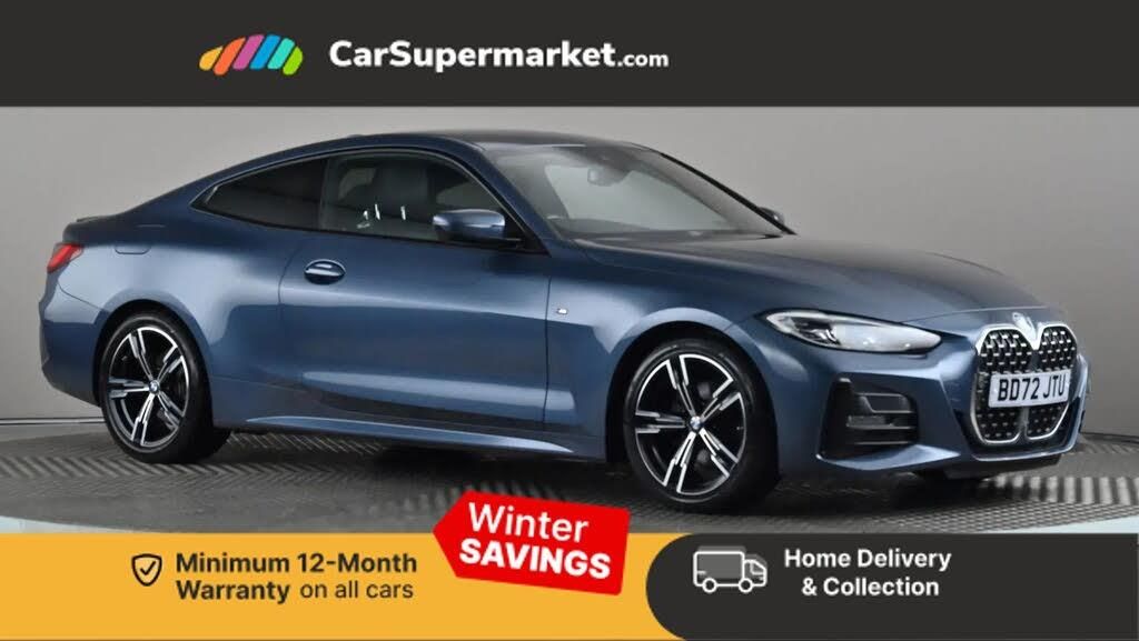 Active guard plus,Attentiveness assist,Auto start-stop,BMW ConnectedDrive online services,BMW iDrive controller on centre console,BMW Live Cockpit Professional Nav with 12.3" instrument display + 10.25" display, Intelligent Voice Assist, BMW OS 7, HDD, 2USB, 4G LTE connect,BMW service history,BMW Teleservices,Brake pad wear indicator in front and rear,Check Control warning system for monitoring of lights and door/luggage compartment open warning,Condition based service,Cruise control with speed limit function,Electric power steering with Servotronic steering optimised at all speed ranges,Gearshift time display in manual mode,Instrument cluster with speedometer with mph readout, tachometer, fuel gauge and oil temperature gauge,Integrated owners handbook,Oil sensor for level and grade, warning by check control system,On board computer - average speed, fuel consumption, outside temp display with acoustic warning, clock/date, service interval, odometer/trip meter,Optimum shift indicator,Run flat indicator,Shifting point display,Touch control functionality for BMW Live Cockpit Professional Nav,Variable sport steering,8 speed automatic steptronic transmission with gearshift paddles,Balanced 50/50 weight distribution,Double joint spring strut front axle,Double VANOS,Drive performance control - ECO PRO, comfort and sport modes,High precision injection,Low centre of gravity,M sport suspension,Petrol Particulate Filter,Stroke dependent dampers,VALVETRONIC engine management,2x USB Type C ports in front centre console for charging and data transfer,2x USB Type C ports in rear centre console for charging,DAB tuner,Electronic service booklet,Acoustic glazing,Automatic headlight beam throw control with load dependent regulating reaction, dynamic compensation of braking dive and acceleration squat,Automatic windscreen wipers and automatic headlight,Automatically dimming electrochromatic rear view mirror,BMW emblem on engine compartment lid and tailgate,BMW kidney grille with mesh grille front side of the nuggets in matt aluminium and frame in chrome high gloss,Body colour fuel filler flap,Body colour roof fin,Brushed aluminium inserts in the front door sill finishers with BMW designation,Door sill strips,Dynamic brake lights,Electric windows - front and rear, with open/close fingertip control, anti trap facility and comfort closing function all round,Exterior mirrors - electrically folding with anti-dazzle,Fading support,Follow me home headlights,Front and rear bumper system,Front apron plastic in body colour,Green tinted heat protection glazing,High gloss shadow line exterior trim,Illuminated bow type door handles in body colour drivers side with door lock,Interior rear view electrochromatic mirror with automatic anti dazzle function,LED daytime running lights,LED front fog lights,LED front indicators,Licence plate panel integrated into front bumper and tailgate,Lightweight engineering,M designation on front side panels, left and right,M rear boot spoiler,Model designation on right side of tailgate,One piece front bumper cover including towing eye cover in body colour,Preparation for high beam assistant,Rear boot,Reversing light,Side frame decorative moulding black matt,Two part LED tailights in L-shape with components in smoked glass, brake light, LED turn indicator and rear fog light,Visible exhaust tailpipe finisher,Visible VIN plate,Welcome lights in interior and door handle area,Widened track and increased camber values for max transverse dynamics, agility and steering precision,Window recess cover black high gloss,Windscreen wipers with integrated heated washing jets,12V power socket in front centre console,2 front cupholder in centre console with clamping elements and matt black inlay,2 Rear seat headrests,2 seat bench in second row,3 spoke M sport leather multifunction steering wheel,3 zone automatic air conditioning,4 pieces lashing eyelets in luggage compartment,40:20:40 split folding rear seat and rear centre armrest with two cupholders,Anthracite headlining,Armrest integrated in front and rear door trim + front centre console armrest,BMW ID,Driver seat backrest width adjustment,Four grab handles integrated in roof lining,Front and rear door pockets,Front and rear reading lights,Front sport seats,Heated driver and front passenger seats,Height adjustable front headrests,Height adjustable mechanically and infinitely variable steering column,Illuminated armrest storage compartment,Illuminated glove compartment with separate small compartment,Make-up mirror lights,Single front passenger seat,Storage compartment in rear centre console,Sunvisors with illuminated vanity mirrors and ticket pocket,Toolkit located in luggage compartment,Vernasca leather upholstery,Ambient lighting pack - 4 Series,Connected professional pack - 4 Series,M sport exterior styling pack - 4 Series,2 x 3-point rear seatbelts,Battery safety cut-off,BMW emergency call,Brake energy regeneration,Braking pre-tensioning