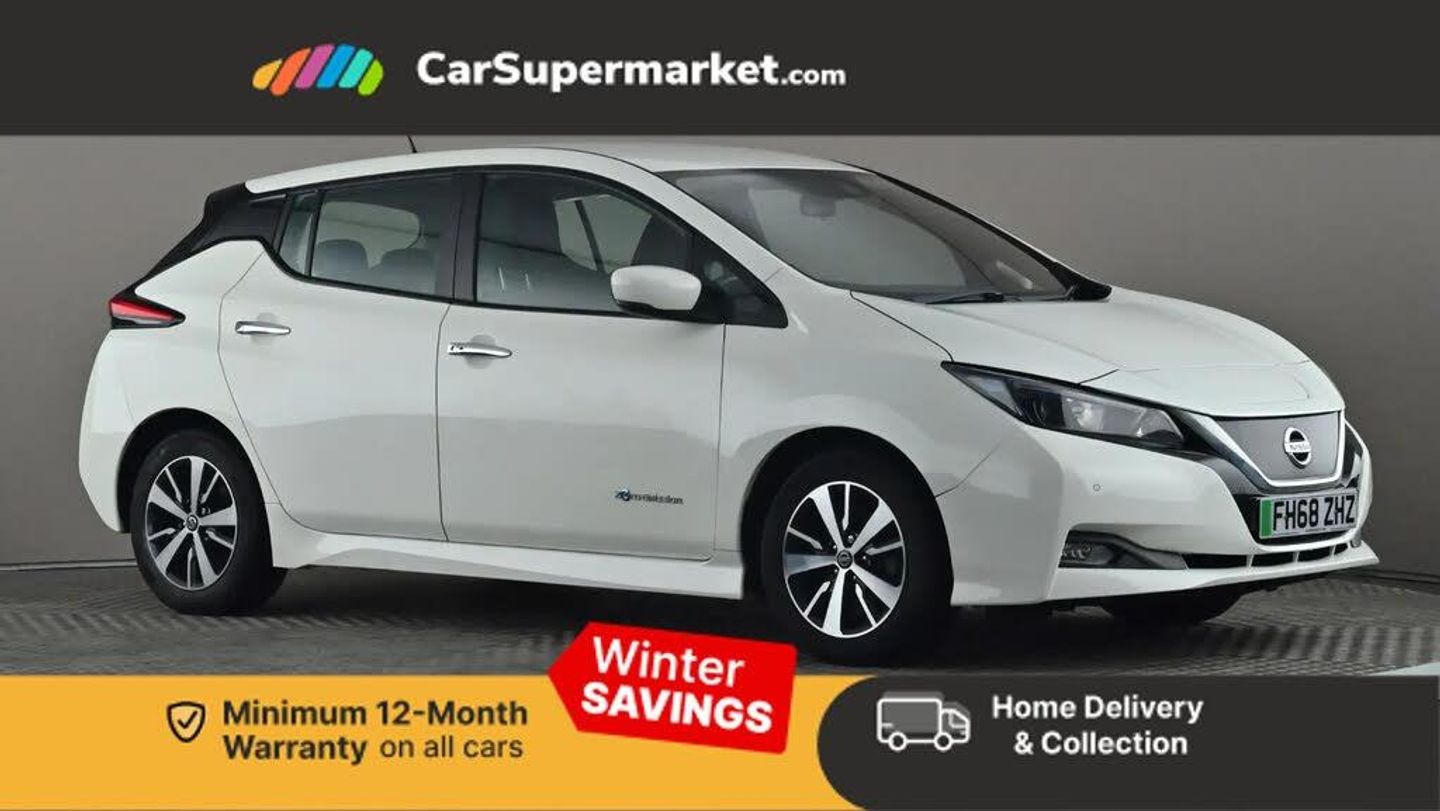 Apple car play/Android Auto,Intelligent Cruise control (ICC),Nissan connect sat nav system,Push button starter,Speed limiter,Speed sensitive power steering,Telematics system,Trip computer,Voice control system,6.6kw charger,EVSE charging cable,6 speakers,Steering wheel mounted audio/telephone controls,Automatic activation of hazard warning lights,Automatic headlights,Chrome door handles,Electric front/rear windows,Electrically adjustable and folding door mirrors,Follow me home headlights,Front fog lights,LED Headlights,LED rear lamps,Rain sensor,60/40 split folding rear seat,Climate control,Front head restraints,Front seatback pockets,PTC (Positive Temp Co-efficent) heater,Quick charge port,Rear assist grips,Rear head restraints,Rear heater duct,Suede fabric upholstery,Tilt adjustable steering wheel,3 point front seatbelts with pre-tensioners,3x3 point rear seatbelts,Driver and passenger airbags,Front seatbelt pretensioners + load limiters,Height adjustable front seatbelts,Hill start assist,Intelligent emergency braking with pedestrian recognition,Seatbelt reminder for driver and front passenger,Side airbags,Traction control,Tyre pressure monitoring system,VDC Dynamic Vehicle Control,Deadlock,Immobiliser,Remote central locking,Thatcham Cat.1 alarm,16" alloy wheels