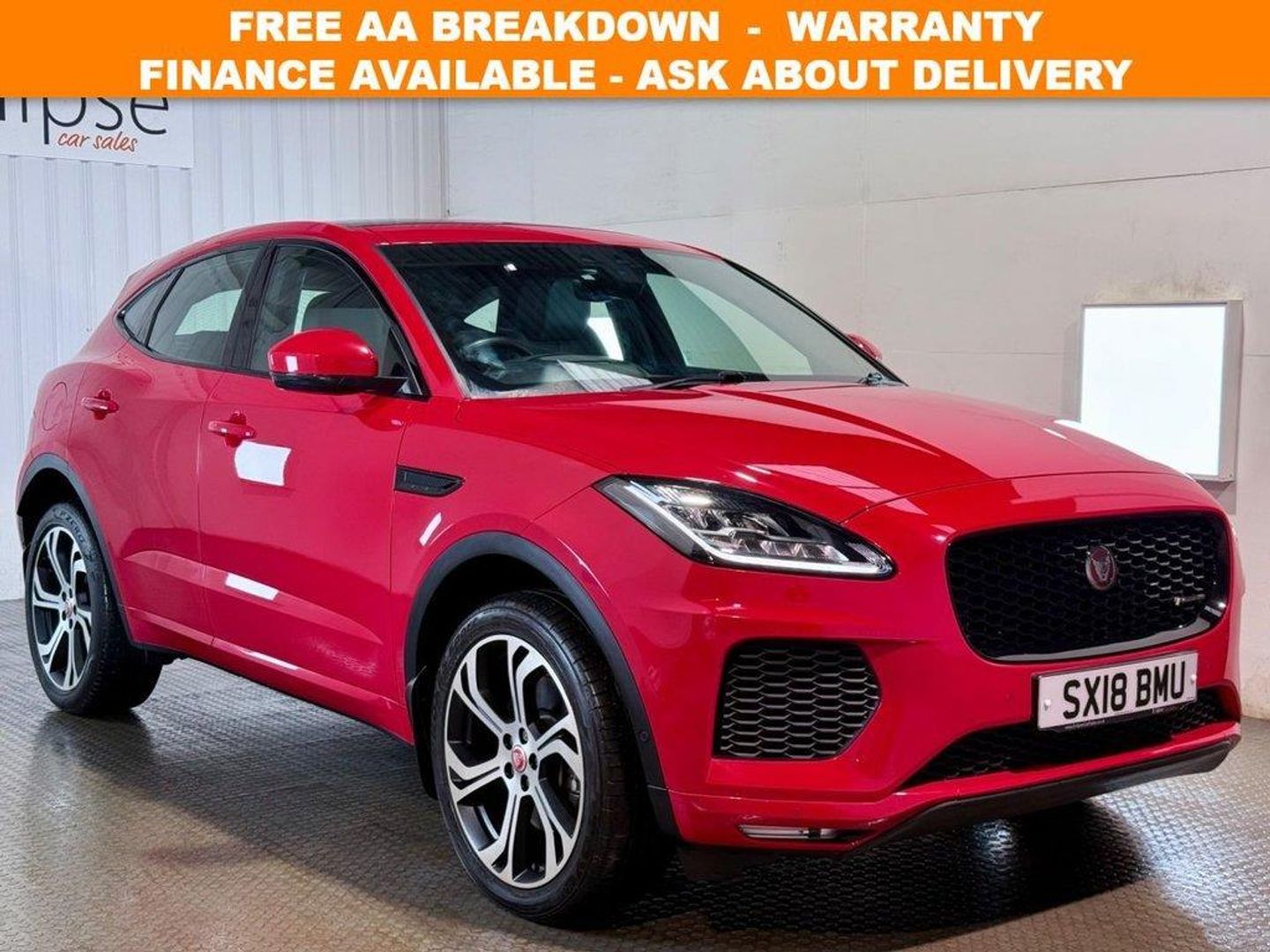 **THIS VEHICLE MAY BE AT OUR 150-CAR STORAGE FACILITY. PLEASE CALL AHEAD TO ARRANGE VIEWING AT OUR WINCHESTER SALES SITE** Jaguar E-Pace 2.0 P250 First Edition SUV first registered in March 2018 (18 Reg). Finished in Caldera Red with a leather interior and 20 inch alloy wheels. Spec includes Head up display | Panoramic sun roof | heated front electric memory seats | Dual zone climate control | Meridian sound system | Adaptive cruise control with speed limiter | Selectable drive modes | Apple car play | android auto | reversing camera with Park Assist | Powered Tailgate | Configurable Ambient Lighting | Heated windscreen | Serviced at 4216 miles | 9853 miles | 13080 miles | 18101 miles | 21557 miles. Eclipse Car Sales are Proud to be an approved AA dealership. Every car includes 12 Months AA Breakdown Cover, 3 Months National Warranty Included, Upgrade packages available, Part exchange welcome, Debit cards accepted, a range of affordable finance packages available to fit all circumstances, Open 7 days a week, 9am - 5.30pm Monday to Saturday & 10am - 3pm Sundays & Bank Holidays, Contact us on 0238 2028811 or email sales@eclipsecarsales.co.uk . 10in Touch Pro,18-Way Heated Electric Memory Front Seats,2-Zone Climate Control,20in Alloy Wheels - 6 Split-Spoke Satin Grey Diamond Turned Finish - Style 6014,3-Flash Lane Change Indicators,350mm Brakes,360 Degree Parking Aid,5in Display with Instrument Panel,60-40 Split Fold Rear Seat,ABS - Anti-locking Braking System,Activity Key,Adaptive Cruise Control with Queue Assist,Additional Power Sockets,Airbags - Front Side,Airbags - Full Length Side Window Curtain,Approach Illumination,ASPC - All Surface Progress Control,Auto High Beam Assist,Auto-Dimming - Power Fold - Heated Door Mirrors with Memory and Approach Lights,Auto-Dimming Interior Rear View Mirror,Automatic Headlights,Black Exterior Pack,Black Gearshift Paddles,Blind Spot Assist,Bluetooth Connectivity,Body Coloured Fixed Panoramic Roof,Body-Coloured Door Claddings,Bright Metal Pedals,Caldera Red,CBC - Cornering Brake Control,Centre Console Cubby Box,Centre Console with Armrest,Configurable Ambient Interior Lighting,Configurable Dynamics,Connect Pro Pa