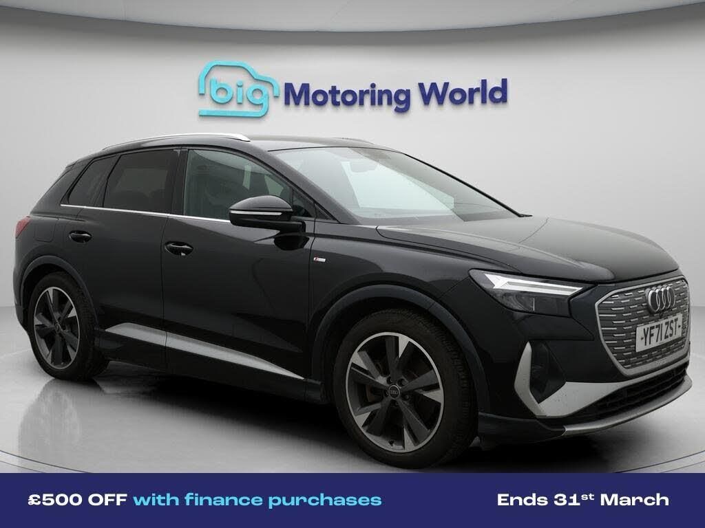 Part Leather Seats,Apple CarPl-Our Audi Q4 e-tron is finished in Black. Specification includes a range of fantastic features including Part Leather Seats, Apple CarPlay, Bang & Olufsen Speakers, Lane Assist, S Line Body Styling, Android Auto, Satellite Navigation, Privacy Glass, Heated Seats, Bluetooth Specification information is supplied by CAPHPI and may vary to the actual car. This data does not form any part of a buying contact. Please check specification prior to purchase in-store. The MOT is valid until December 2026, visit bigmotoringworld.co.uk for more photos, a 360 tour, service history and a free HPI report.Were BIG on peace of mind and this Black Audi Q4 e-tron has completed our comprehensive 200 point inspection and passed all checks. Its ready for you to drive away with immediate collection in-store. We include a 90-day warranty as standard plus an option to extend for up to 3 years.Reserve this car exclusively for you, safely and securely at bigmotoringworld.co.uk, with a fully refundable £99 deposit. Test drive before you buy, with no commitment, no hassle and a completely haggle free experience. Still searching and want to see thousands more cars? We are BIG on choice with over 8000 cars to choose from.Visit our award winning web site bigmotoringworld.co.uk.Were Big Motoring World and were BIG on what matters to you.