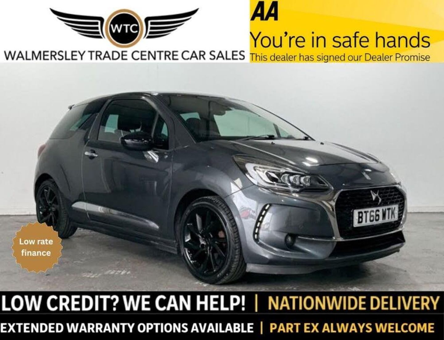 WALMERSLEY TRADE CENTRE IS DELIGHTED TO OFFER ANOTHER TOP QUALITY AUTOMATIC DS AUTOMOBILES DS 3 1.2 PureTech Prestige Hatchback 3dr Petrol EAT6 Euro 6 (s/s) (110 ps) JUST BEEN FULLY SERVICED, ONLY 1 FORMER OWNER FROM NEW, 2 KEYS, NAVIGATION SYSTEM, PARKING SENSORS, PRIVACY GLASS, ALLOY WHEELS, CLIMATE CONTROLS, AIR CONDITIONING, CD PLAYER, RADIO, AUX, ADJUSTABLE SIDE MIRRORS, ADJUSTABLE SEATS, CHROME DOOR HANDLES, ELECTRIC FRONT WINDOWS, FULL 12 MONTHS MOT PROVIDED ON SALE, THIS GREAT LITTLE GEM IS IN A BEAUTIFUL COLOUR AND CONDITION THROUGHOUT, CONTACT US FOR MORE INFORMATION TO BOOK A VIEWING OR A TEST DRIVE, LOW RATE FINANCE OPTIONS AVAILABLE ALL OF OUR CARS ARE FULLY HPI CHECKED AND ALL CLEAR, EVERY VEHICLE COMES WITH A 12 MONTHS AA BREAKDOWN COVER, P/X ALWAYS WELCOME, FOR MORE INFO ON ANY OF OUR VEHICLES OR TO BOOK A TEST DRIVE PLEASE CONTACT OUR FRIENDLY AND HELPFUL SALES TEAM ON 0161 637 7280. *PLEASE NOTE PRICES MAY BE SUBJECT TO AN ADMIN FEE. PLEASE CALL US FOR MORE INFORMATION.