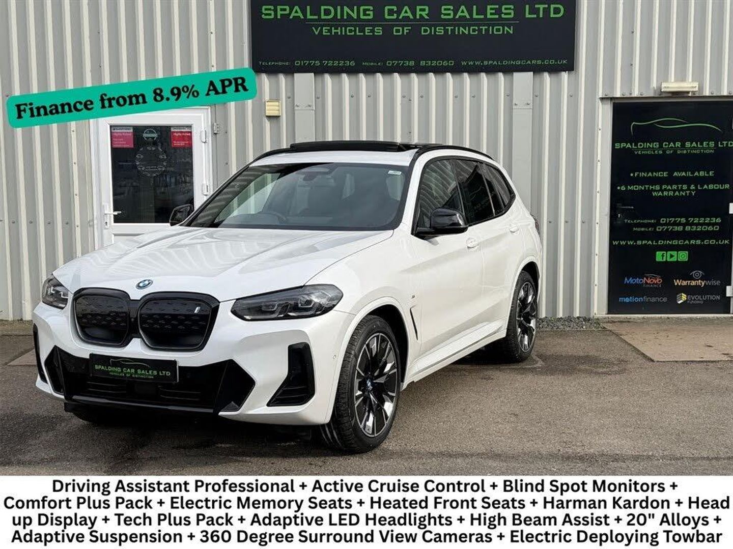 We are Delighted to Offer this Stunning High Specification Full BMW Service History, BMW IX3 210KW 80KWh M Sport Pro Auto finished in Mineral White Metallic with Contrasting Black Vernasca Leather interior with Royal Blue Stitching. The specification of this BMW IX3 210KW 80KWh M Sport Pro Pack is as follows - Mineral White Metallic - Black Vernasca Leather Sports Seats - Electrically Adjustable Drivers & Passengers Seats with Extendable Knee Support & Memory Facility - Heated Front Seats - Lumbar Support - Air Con - Tri Zone Climate Control with Independent Rear Controls - Electric Front & Rear Windows - Electric Tilt & Slide Panoramic Roof - Electric Folding Mirrors with Auto Dimming Lenses - Live Operating Area Pro - Professional Satellite Navigation & Media System - RDS DAB Digital Stereo - USB Interface - Bluetooth Music Streaming - BMW Apps Inc Spotify - Apple CarPlay - Android Auto - Harman Kardon Surround Sound System - Gesture Control - Connected Drive Services - Bluetooth Phone - Wireless Charging - Drivers Assistant Professional - Adaptive Cruise Control with Assisted Driving Mode - Active Cruise Control with Distance Control - Speed Limiter - Blind Spot Monitors - Active Lane Guidance - Steering & Lane Control Assist - Front Collision Warning - Lane Departure Warning - Cross Road Warning - Drive Recorder - Head Up Display - Virtual Cockpit - Heated Nappa Leather M Sport Multi Function Steering Wheel - Ambient Lighting - Comfort Access - Electroplated Interior Switches - 3 Pin Charger & Type 2 Cable - BMW IX3 210KW 80KWh M Sport Hybrid Bodystyling - M Sport Aero Pack - 20" M Double Spoke Alloys finished in Black & Silver 890M - Variable Damper Control - Adaptive Suspension - M Sport Brakes - Adaptive LED Headlights with Signature LED Daytime Running Lights - High Beam Assist - Reversing Assistant - Park Assist - Self Park - 360 Degree Surround View Cameras & Guidance Lines - 3D Remote View - Front & Rear Parking Sensors - Privacy Glass - Electric Deploying Towbar, 2 Keys, Full BMW Service History, 12M MOT, 6M Platinum Plus Nationwide Comprehensive Parts & Labour Warranty Viewing By Appointment, Finance From 8.9% APR, Multi Point Inspected, All Cars Fully Detailed Extra Features These are in addition to what this car typically comes with as standard: Vernasca Leather - Black with Blue Contrast Stitching Model Specific Design Elements Towbar - Fully Electric This Car Comes with 20in Alloy Wheels - M Aerodynamic - Bi-Colour Acoustic Glazing Active Protection Adaptive LED Headlights Adaptive Suspension Air Breathers with BMW i Logo Air Conditioning - Automatic Airbags - Driver Airbags - Front Side for Driver and Passenger Airbags - Head - Front and Rear Airbags - Passenger Ambient Lighting Attentiveness Assistant BMW Connected Package Professional BMW ConnectedDrive Online Services BMW Gesture Control BMW Iconic Sounds - Electric BMW Individual Lights - Shadowline BMW Legal Emergency Call BMW Live Cockpit Professional BMW TeleServices Blue Ring Around BMW Logos Brake Energy Regeneration Brake Pad Wear Indicator Bumper System Front and Rear - Replaceable Deformation Elements for Impacts Up to 15kmh Central Locking Switch for All Doors - Fuel Filler Cap - Luggage Compartment Charging Cable - Mode 3 - 5m Check Control Warning System Child Seat ISOFIX Attachment - Rear Childproof Locking System - Rear Doors Comfort Access Condition Based Service Crash Sensor Cruise Control with Brake and Speed Limiting Function DSC - Dynamic Stability Control Plus Deletion Lumbar Support-Width Adjustment Passenger Side Door Handles - Body Colour Drive Recorder Driving Assistant Professional Electric Memory Seats Electric Windows - Front Enhanced Bluetooth with Wireless Charging Extended Storage Exterior Mirrors - Electrically Folding with Anti Dazzle Exterior Trim - Extended High Gloss Shadowline Exterior Trim - High-Gloss Shadowline Front Bumper - M Sport with iX3 Specific Design with Blue Contents Front Lumbar Support Front and Rear Parking Sensors Galvanic Embellisher for Controls Head-Up Display Headlining - M Anthracite Headrests - All Seats Heat Protection Glazing with Green Tint Heated Seats for Driver and Front Passenger Heated Steering Wheel High-Beam Assistant Instrument Panel in Sensatec Integrated Owners Handbook Interior Rear-View Mirror with Automatic Anti-Dazzle Function Interior Trim - Aluminium Rhombicle with Pearl Chrome Loudspeaker System - Harman Kardon Luggage Compartment Lights M Aerodynamic Exterior M Badging on Front Side - Left and Right M Seat Belts M Sport Leather Steering Wheel Model Logo - Tailgate - Left Panoramic Glass Sunroof Parking Assistant Parking Assistant Plus Personal Profile Power Socket - 12V Power Steering - Electric Preparation for Adaptive M Suspension Rear Centre Armrest including Two Cupholders Rear Diffuser in Blue Rear Window Wiper Reversing Assist Camera Roof Rails - Black Roof Rails - Shadow Line High Gloss - Black Safety Battery - Terminal Clamp Seat Backrest Adjustment for Rear Seats Seat Backrest with Width Adjustment Seats - Front Sports Side Impact Protection Split Folding Rear Seat Sun Protection Glass Sun Visors with Vanity Mirrors and Ticket Holder TPMS - Tyre Pressure Monitoring System Third Brake Light Using LED Technology Three-Point Seat Belts - All Seats Two Tone Horn Tyre Repair Kit Visible VIN Warning Triangle Welcome Lighting eDrive Exterior Sound Buying from Spalding Car Sales Ltd Here at Spalding Car Sales our mission is to provide the best car buying experience possible. We strive to prepare all of our hand selected vehicles to the highest standards returning them to as near new condition as possible. All our cars go through a comprehensive inspection in our workshop and are supplied with a new 12 month MOT which is carried out independently. The car then goes through our intensive cosmetic preparation, all wheels (where needed) are fully refinished to erase any curbing marks, all minor dinks are removed paintlessly and the exterior 