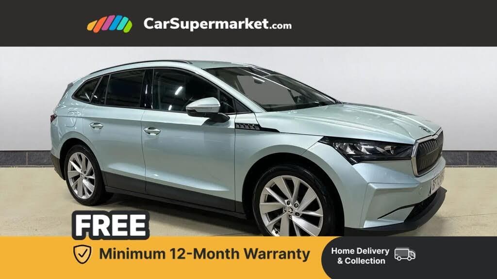 13" touchscreen display,Bluetooth system,E-call,Electronic engine sound,Exterior temperature indicator,Gesture control,Power assist steering,Rear parking sensors,Satellite navigation system,Skoda Connect iV remote services with charging, air conditioning and smart schedules,Smartlink wireless for apple carplay and wired for android auto,Speed limiter,Tailgate unlocking from outside,Virtual cockpit,Voice control system,Washer fluid level indicator,Wi-Fi hotspot,120 kW DC charging,6m mode 3 cable (32A),8 Speakers,DAB Digital radio,USB-C ports (charging + data),Auto dimming rear view mirror,Black roof rails,Body colour bumpers,Body colour door mirrors and handles,Door moulding light in multiple colours,Electric adjustable heated folding door mirrors with boarding spots and welcome logo,Electric front and rear windows,Heat insulating darkened glass in side and rear windows,Heat insulating glass in windshield,Heated rear window,LED third brake light,Light assistant (coming home/tunnel light),Radiator grille frame in matt black with chrome strip,Rain and light sensors,Rear side wing doors,Rear spoiler,Rear window wiper with washer system and intermittent control,Safety reflectors on front and rear doors,Variable front intermittent wipers,12V socket in boot,3 rear headrests,3 seat bench in 2nd row,4 foldable roof handles with rear coat hooks,60:40 foldable rear seat with sliding adjustment and backrest angle adjustment,Boot lighting,Coat hooks on B pillar,Front and rear footwell lighting,Front and rear height adjustable headrests,Front courtesy lights,Front reading lights,Height adjustable front passenger seat,High centre console,Illuminated and cooled glovebox,Interior door handle lighting in front and rear,Isofix child seat fittings in outer rear seats with top tether,Isofix child seat preparation for front passenger seat,Laminated soft-touch plastic knee rest,LED ambient lighting,Manual lumbar support for front passenger seat,Manually adjustable steering column,Pollen filter,Rear reading lights,Single front passenger seat,Sliding boot cover,Sunvisors with illuminated vanity mirrors,Umbrella in door panel,ECO Suite design pack - Enyaq,3 point height adj front seatbelts + pretensioners,Auto door release and activation of warning lights in the event of an accident,Central interaction airbag,Driver and front passenger airbags,ESC (incl. ABS+MSR+ASR+EDS+HBA+DSR+RBS+MKB),Front and rear three point safety belt on all seats,Front assist with assisted automatic braking,Front disc brakes,Front passenger airbag deactivation switch,Front side airbags with curtain airbags,Rear drum brakes,Single tone horn,Tyre pressure monitor,Visual and acoustic seat belt reminder,Warning lights in front doors,Anti theft alarm system with interior monitoring, backup horn and towing protection,Remote central locking with SAFE system,Anti-theft wheel bolts protection,Tyre repair kit with compressor