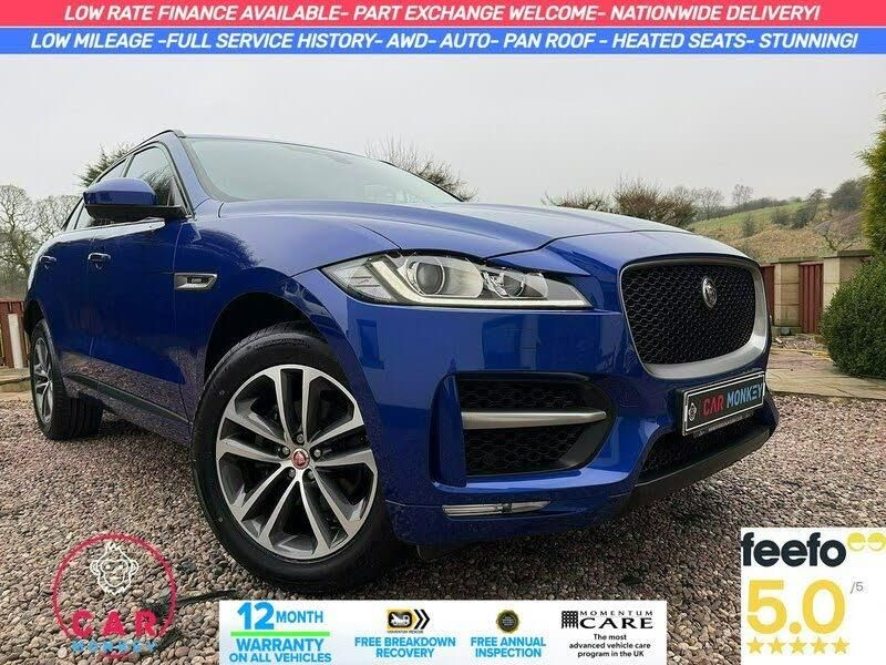 This 2018 Jaguar F-PACE P250i R-Sport boasts an exceptionally low mileage for its age, having covered just 46,470 miles. This premium SUV features a powerful 2.0 litre petrol engine paired with a responsive Four Wheel Drive system, ensuring confident performance in all conditions. It meets Euro 6 emissions standards and comes with a clear vehicle history check and a comprehensive 6 month warranty for your peace of mind. The full service history further underlines its excellent provenance.The R-Sport trim level enhances the F-PACE's already striking presence, complemented by stylish 20 inch alloy wheels with a gloss black finish. Practicality is also a key consideration, with a generous boot space perfect for luggage or shopping, and an electrically deployable tow bar capable of towing up to 2400 kg. Enjoy an open and airy cabin thanks to the fixed panoramic roof, which includes a panoramic sunroof. Auto dimming, power folding, and heated door mirrors with approach lights add to the sophisticated feel. Experience exhilarating acceleration, reaching 0-60mph in a swift 6.4 seconds, demonstrating its superior performance compared to other vehicles in its class. A 12 month MOT will be provided upon purchase, ensuring its roadworthiness.This car will come supplied with MOT, Service and a comprehensive warranty included! Low rate finance available, Best prices given for part exchanges and nationwide delivery available! Call us to reserve today!