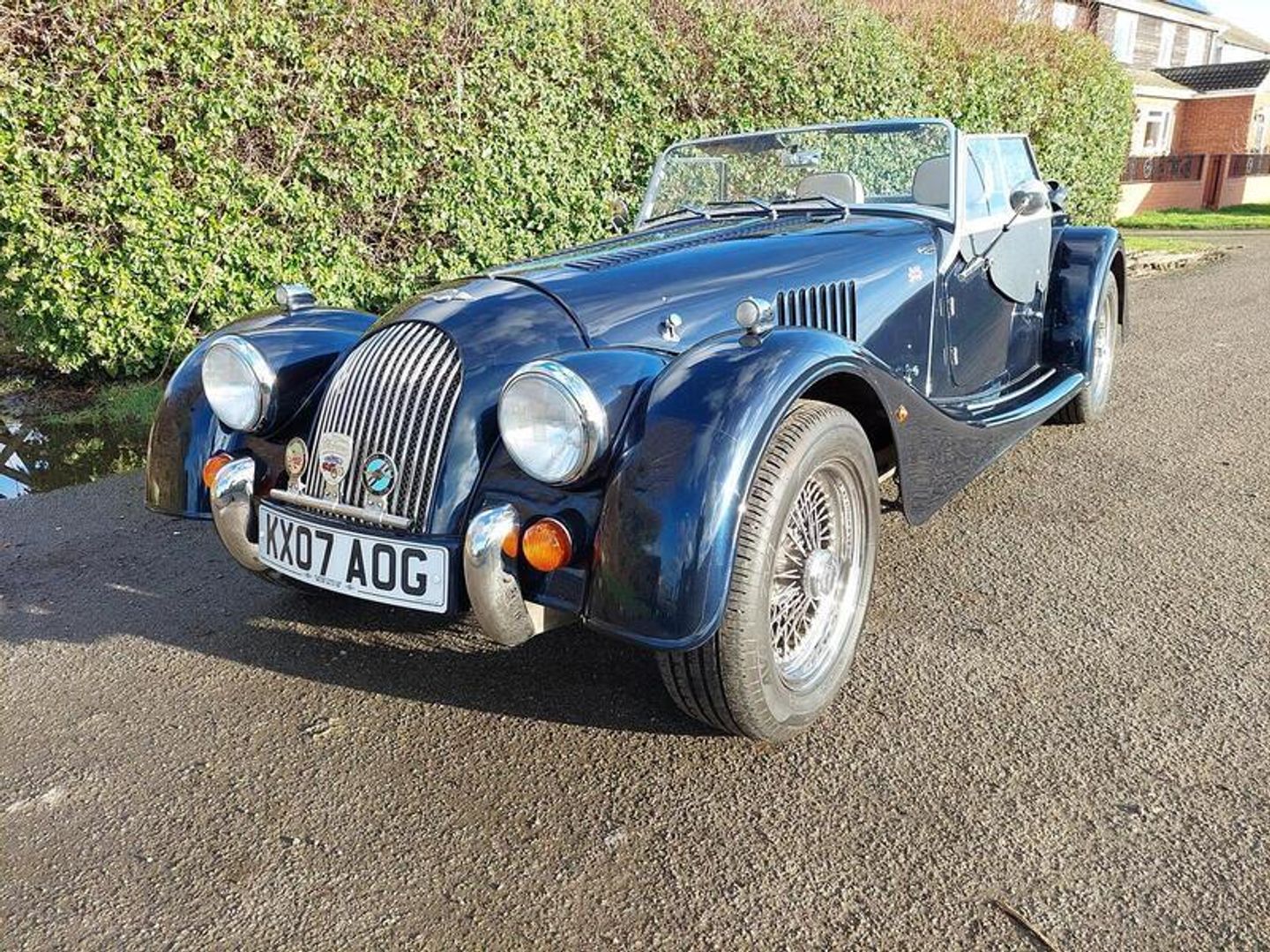 This Morgan Plus 4 is finished in metallic Monterey blue and has a stone leather piped blue interior. It features: