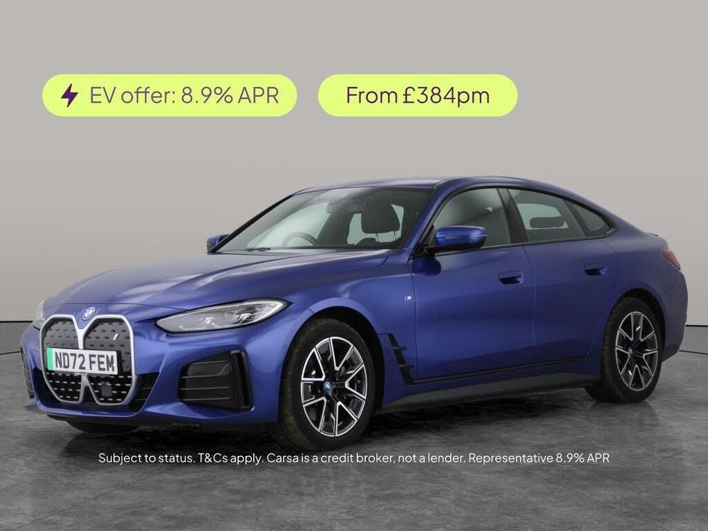 Experience the future of driving with this striking blue BMW i4 M Sport Gran Coupe. Enjoy luxury touches like heated Alcantara seats, half leather trim and advanced Adaptive Cruise Control. Stay safe and confident with Park Assist, LED headlights, reversing camera, and Attentiveness Assistant. Navigation is effortless with the intuitive Sat Nav and BMW Connected Package Professional. Drive in refined comfort with quiet electric power, all on eye-catching 18in alloy wheels. 2 services recorded, last serviced on 26/11/2025 at 26,818 miles. MOT to 01/12/2026. Visit our website for service history, online valuation, full vehicle specification plus multiple images. Certain features listed may be available via subscription packages at extra costs, please consult with BMW for details. This vehicle is VAT qualifying. Any feature/option specified here is from 3rd party data. We cannot guarantee the accuracy of any specification supplied by a 3rd party. We recommend that you physically check the specification of the vehicle on site prior to purchase. This information does not form part of the buying contract. Terms & Conditions apply. We have over 2,000 cars available from our 10 national branches, check our website to see all our stock. Our Trustpilot rating is 4.4/5 with over 9,000 reviews.