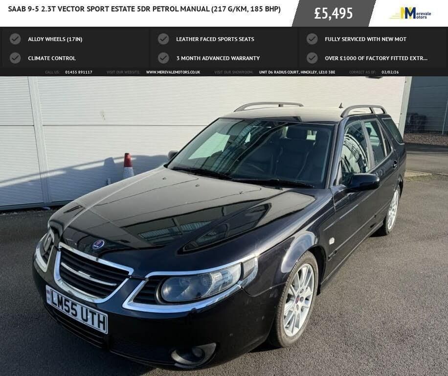 GREAT CONDITION THROUGHOUT THIS VERY WELL MAINTAINED SAAB ESTATE, ONLY 78632 MILES FROM NEW WITH A COMPLETE SERVICE RECORD BY SAAB. JUST THE ONE OWNER FROM NEW THIS SAAB FEATURES INCLUDE FULL LEATHER TRIM, 17 INCH ALLOY WHEELS CLIMATE CONTROL AND CRUISE CONTROL. WE HAVE JUST GIVEN IT A COMPLETE SERVICE INCLUDING THE REMOVAL OF SUMP AND FULL CLEAN OF THE OIL SYSTEM. THIS CAR RUNS REALLY WELL AND SMOOTH. THIS SAAB WAS UNFORTUNATELY CATERGORISED AS A NON STRUCTURAL REPAIR ER WE HAVE ANOTHER SAAB SAVED, IT JUST SEEMS THAT INSURANCE COMPANIES DO NOT WANT TO REPAIR CARS THESE DAYS. ANY INSPECTION OF THIS SAAB IS WELCOMED. PLEASE CALL 01455891117 TO ARRANGE A VIEWING AND TEST DRIVE AS THIS CAR IS STORED EXPECT A GREAT DEAL