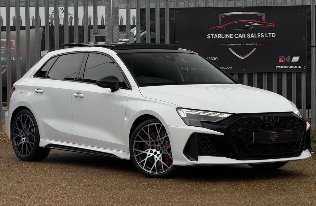 Starline Car Sales Ltd Are Proud To Present This One Owner From New 2025 Audi RS3 Carbon Vorsprung Finished In Arkona White|This Vehicle Comes With A Huge Specification Which Includes Panoramic Glass Sunroof|RS Carbon Bucket Seats|Head Up Display|Reverse Camera|19 Diamond Cut Alloy Wheels Wrapped In Pirelli P Zero R Tyres|RS Torque Rear|Adaptive Suspension with Audi Drive Select|Ambient Lighting Package Pro|High Beam Assist|Audi Connect Navigation and Infotainment Services Plus|Audi Phone Box with Wireless Charging|Audi Virtual Cockpit with RS Specific Design and 12.3in Display|Auto Dimming and Frameless Rear View Mirror|Camera Based Traffic Sign Recognition |Carbon Door Mirrors|Carbon Roof Spoiler|Engine Compartment Cover with Carbon Trim|Heated Front Seats|Hill Hold Assist|Inlays Carbon Atlas Structure|Lane Departure Warning|Lane Assist|MMI Navigation Plus with High Resolution 10.1in Touchscreen Colour Display|Privacy Glass|RS Exterior Features in Carbon|RS Sport Exhaust System|Technology Pack Pro|Top Speed Increase To 174 MPH|Audi Manufactures Warranty Until 2028|This 2025 Audi RS3 TFSI Carbon Vorsprung presents an exceptional opportunity with its remarkably low mileage of just 1500 miles. This four wheel drive model boasts a powerful 2.5 litre petrol engine and meets Euro 6 emission standards. Inside, you will find striking Dinamica microfibre leather RS bucket seats featuring a honeycomb pattern with express red contrast stitching, complemented by red brake calipers.The performance of this RS3 is truly impressive, achieving 0-62mph in a swift 3.8 seconds. This rapid acceleration demonstrates its superior capability compared to many other vehicles in its class. The Carbon Vorsprung trim signifies a high level of specification, ensuring a premium driving experience.PART EXCHANGE WELCOME ALL OUR RETAIL STOCK IS HPI CHECKED & COME WITH MINIMUM 3 MONTHS WARRANTY COMPETITIVE FINANCE RATES AVAILABLE & NATIONWIDE DELIVERY AVAILABLE CONTACT US TODAY - 01733 963330 OR EMAIL US - STARLINECARSALES@GMAIL.COM-PAN ROOF|CARBON BUCKETS|HUD|-VIEWINGS ARE STRICTLY BY APPOINTMENTS ONLY